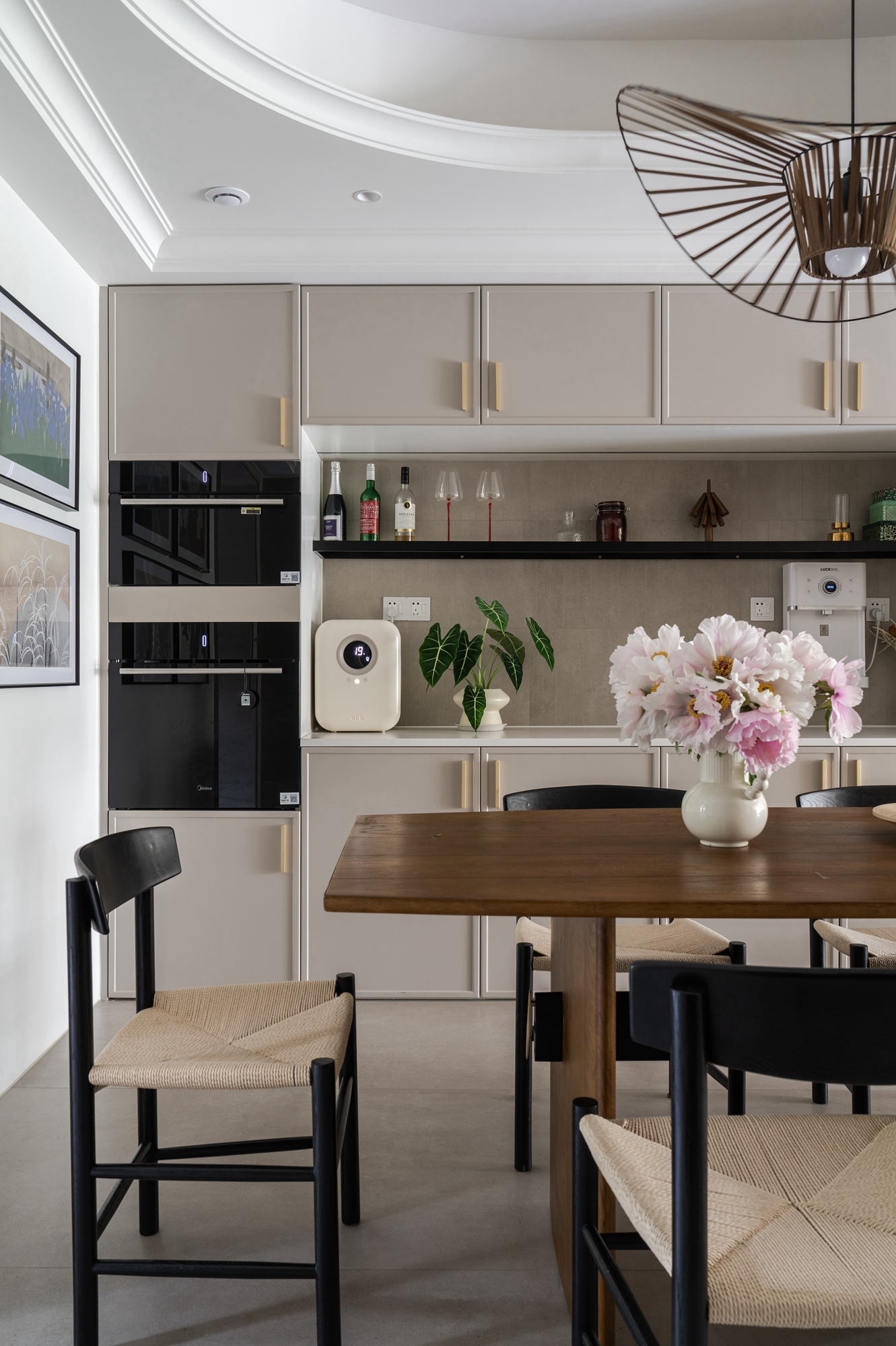 打造更符合年轻人使用习惯的餐厨场景,餐厅位于中心位置,左边是半开放中厨,右边是多功能西厨,平常女主的各式烘焙西点,茶水咖啡,以及小朋友的奶粉冲泡,都能在这里完成。