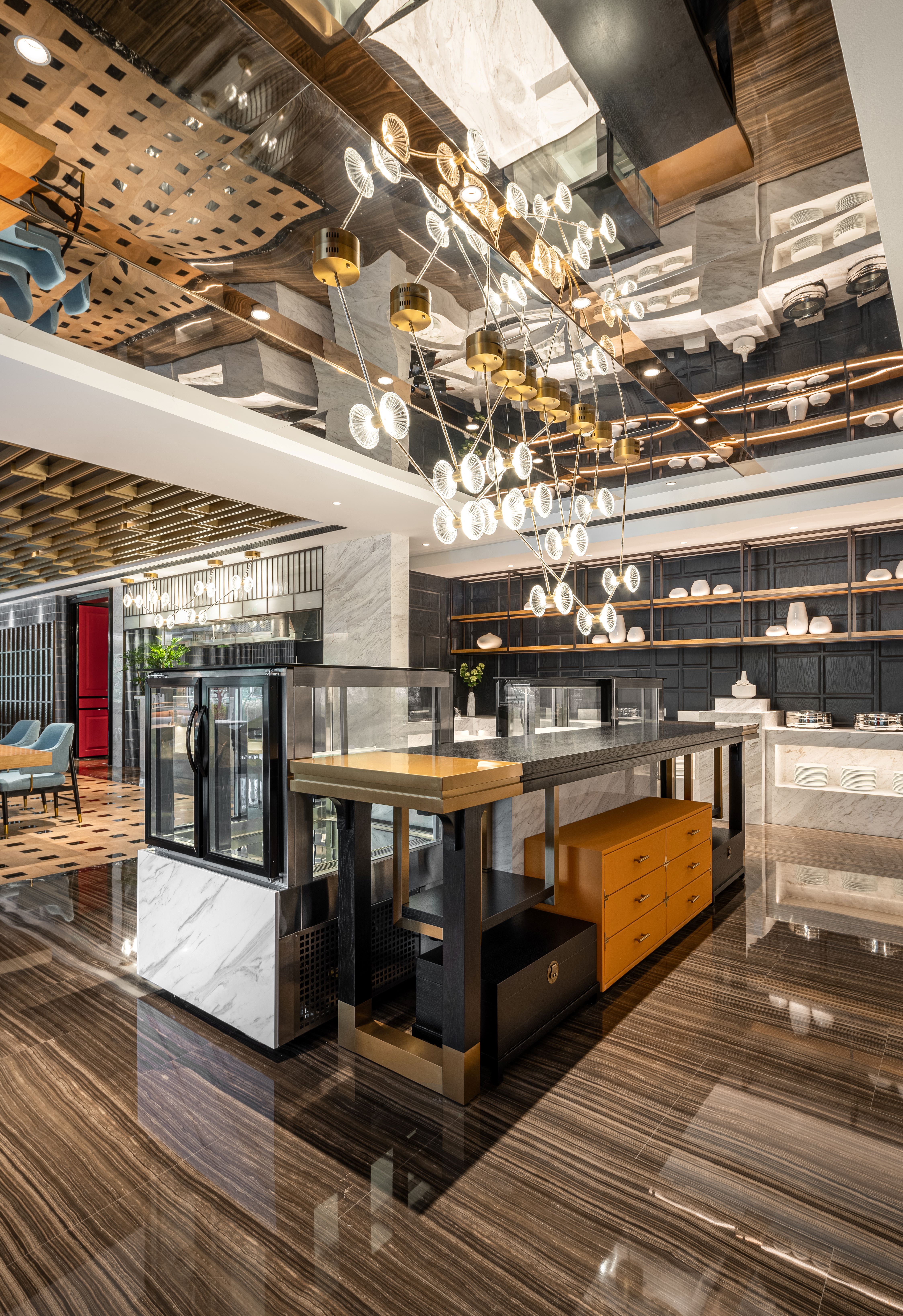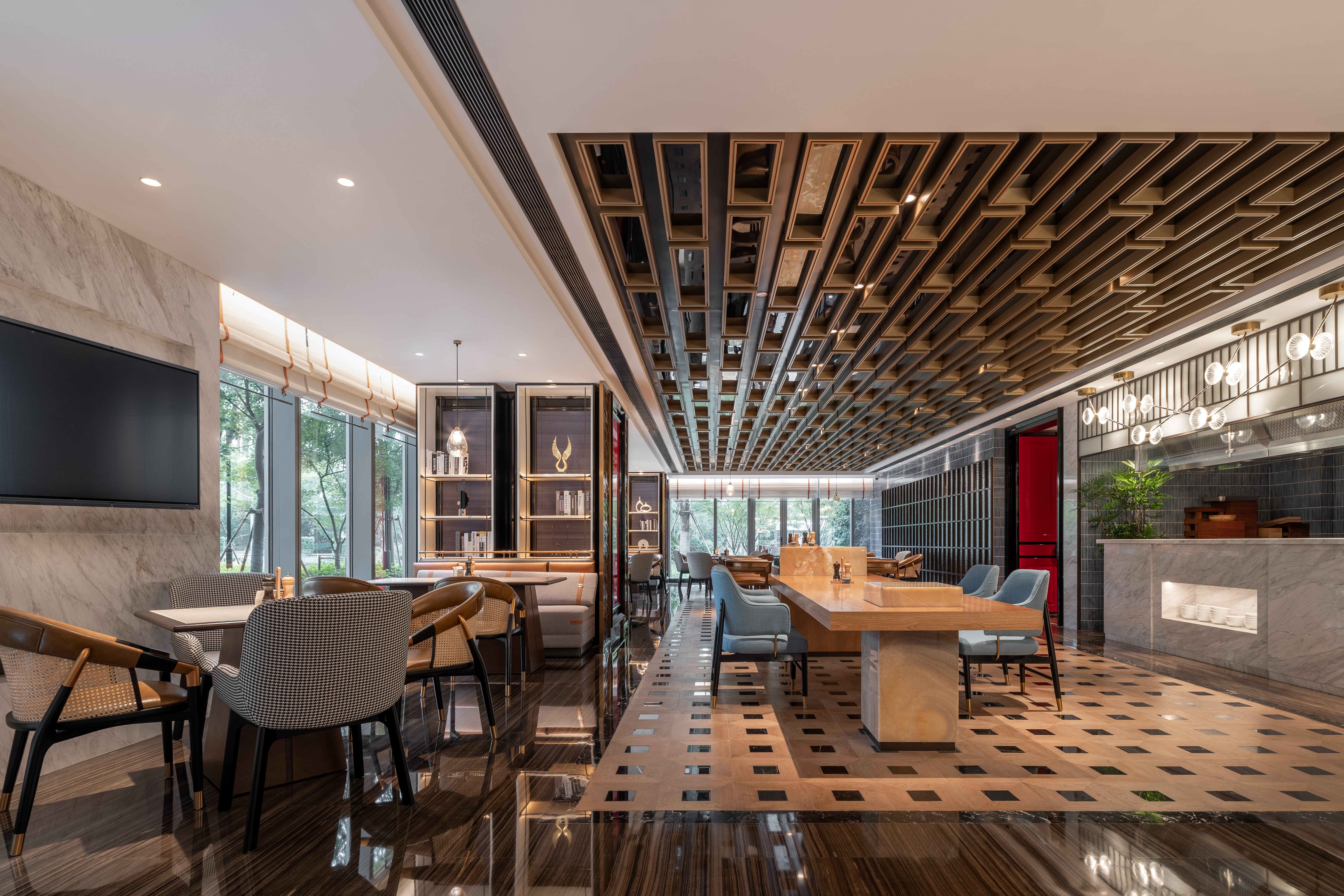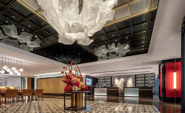 在大堂吧顶面运用水晶布的艺术吊灯,如同兰花花瓣盛开的场景,将海派文化与东方文化相结合,体现出东方低调奢华的韵味,也能给客人带来丰富的视觉感受