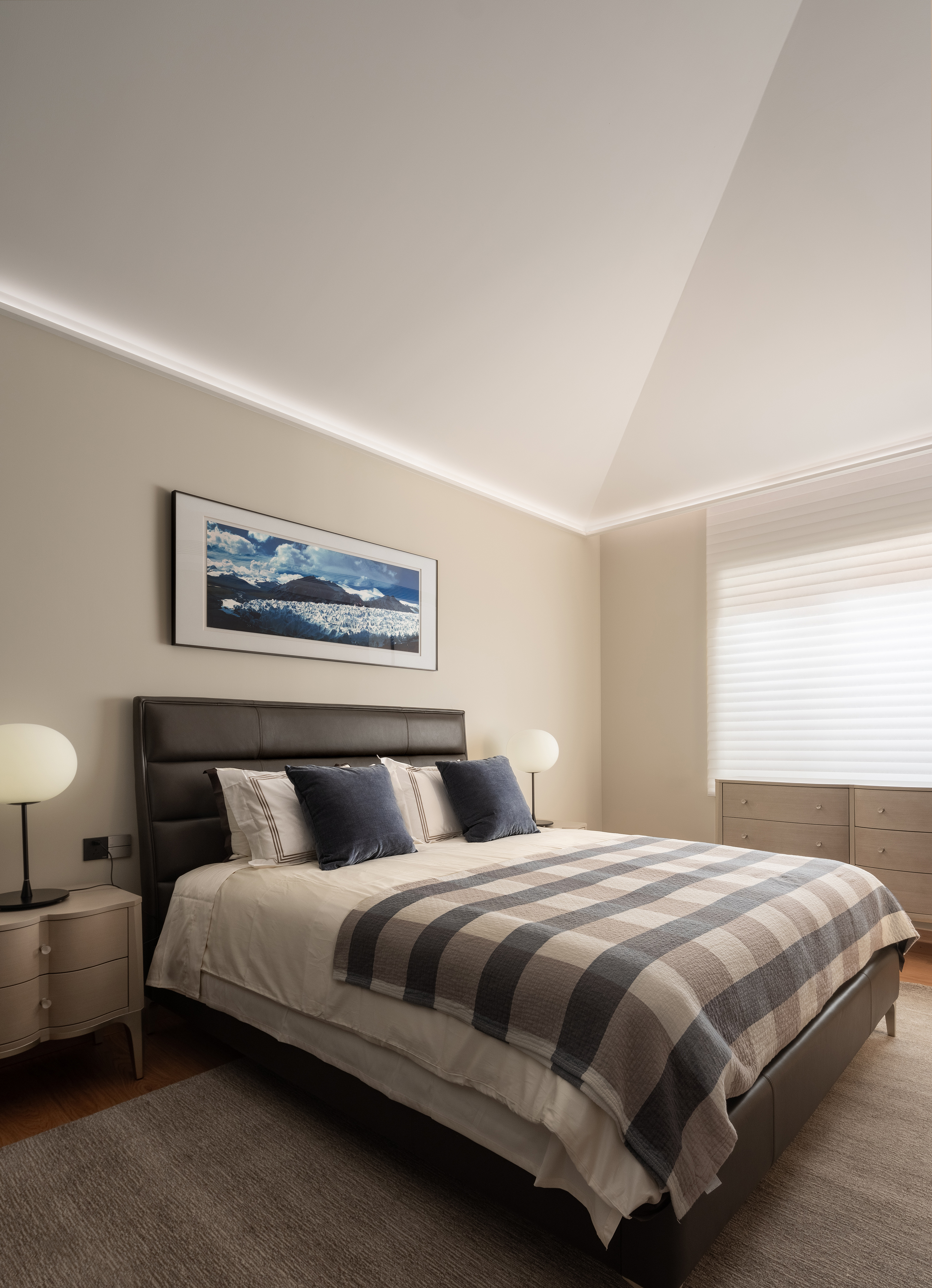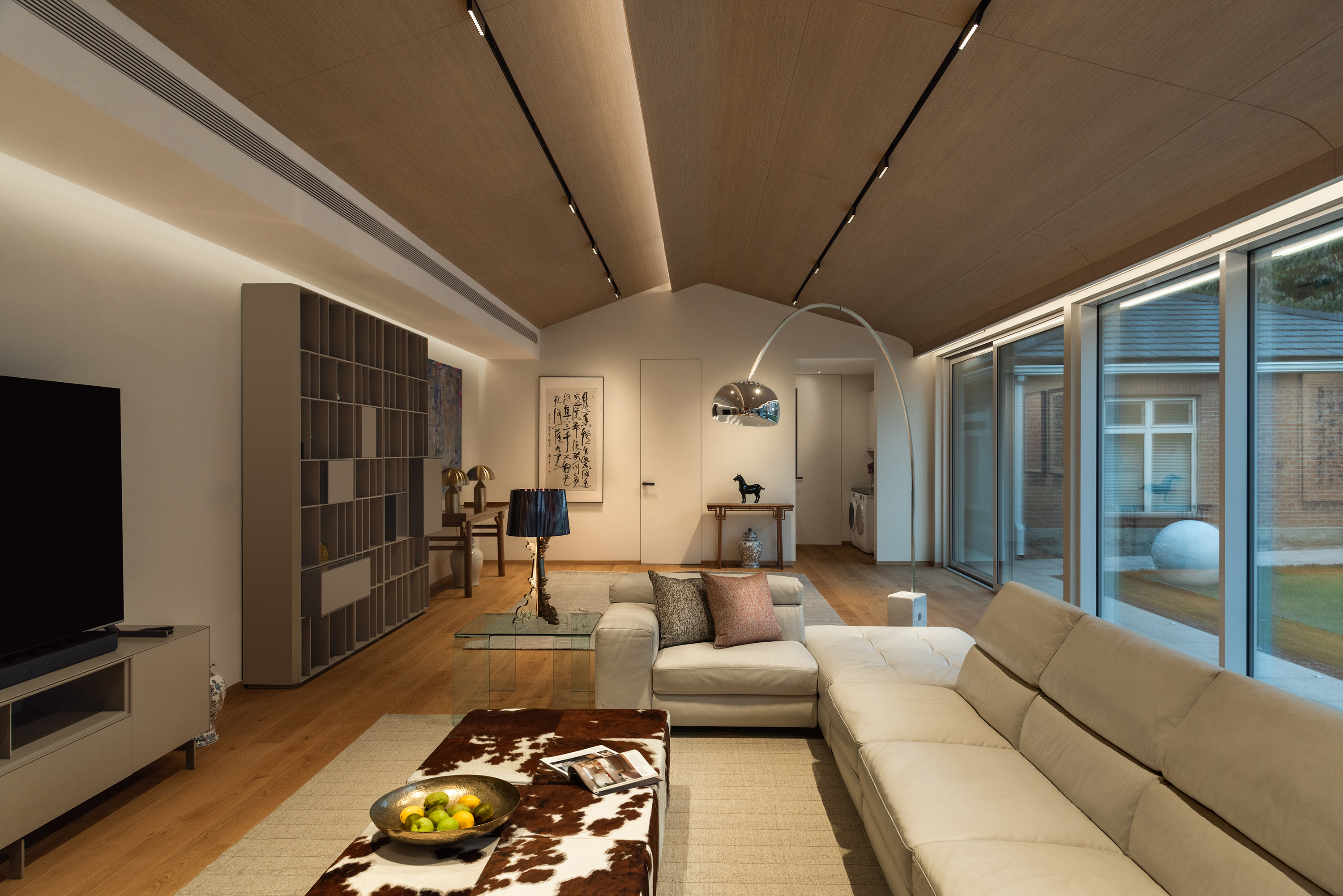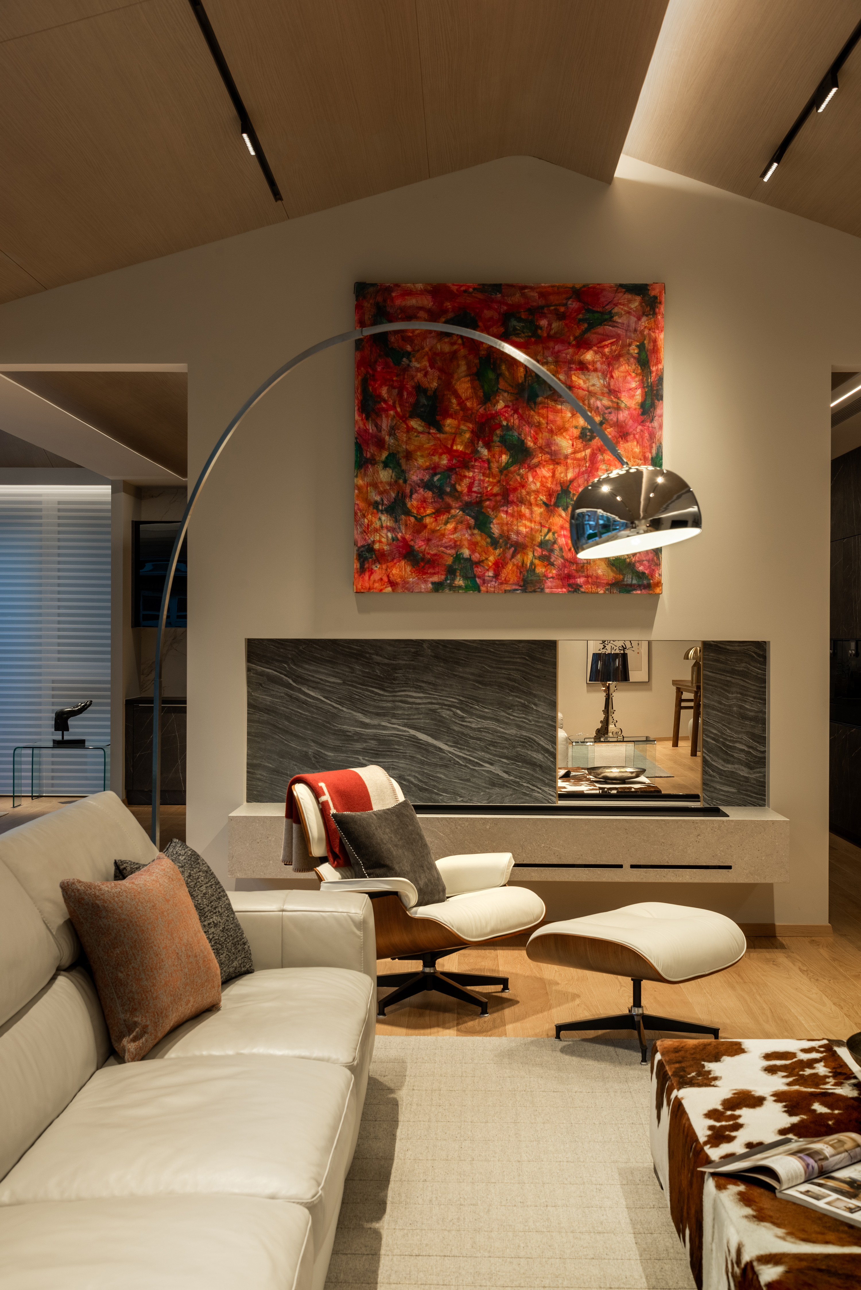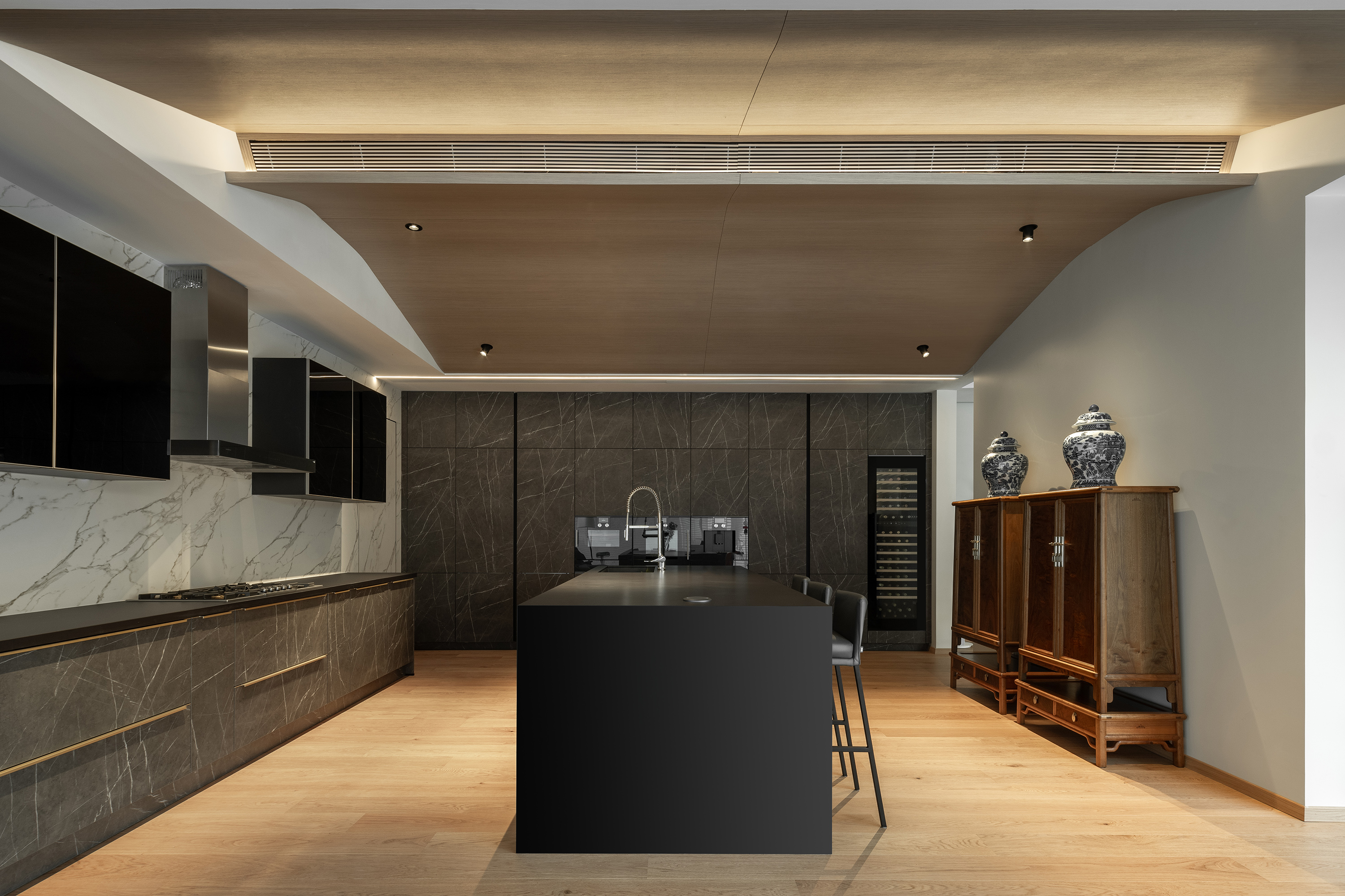 别墅的原始顶部,充斥着纵横交错的梁和错综复杂的结构,为了遮蔽这些结构,我们研究了原顶后设计出如图的异形顶,用两"片"曲面叠合在一起,形成倒钩的造型。在叠合处暗藏灯带,增加了室内线条感。 The original roof of the villa is filled with crisscrossing beams and intricate structures. In order to conceal these structures, we studied the original roof and designed an irregular roof as shown in the picture. Two curved surfaces are stacked together to form a hooked shape. Concealed light strips at the overlapping area enhance the sense of indoor lines.