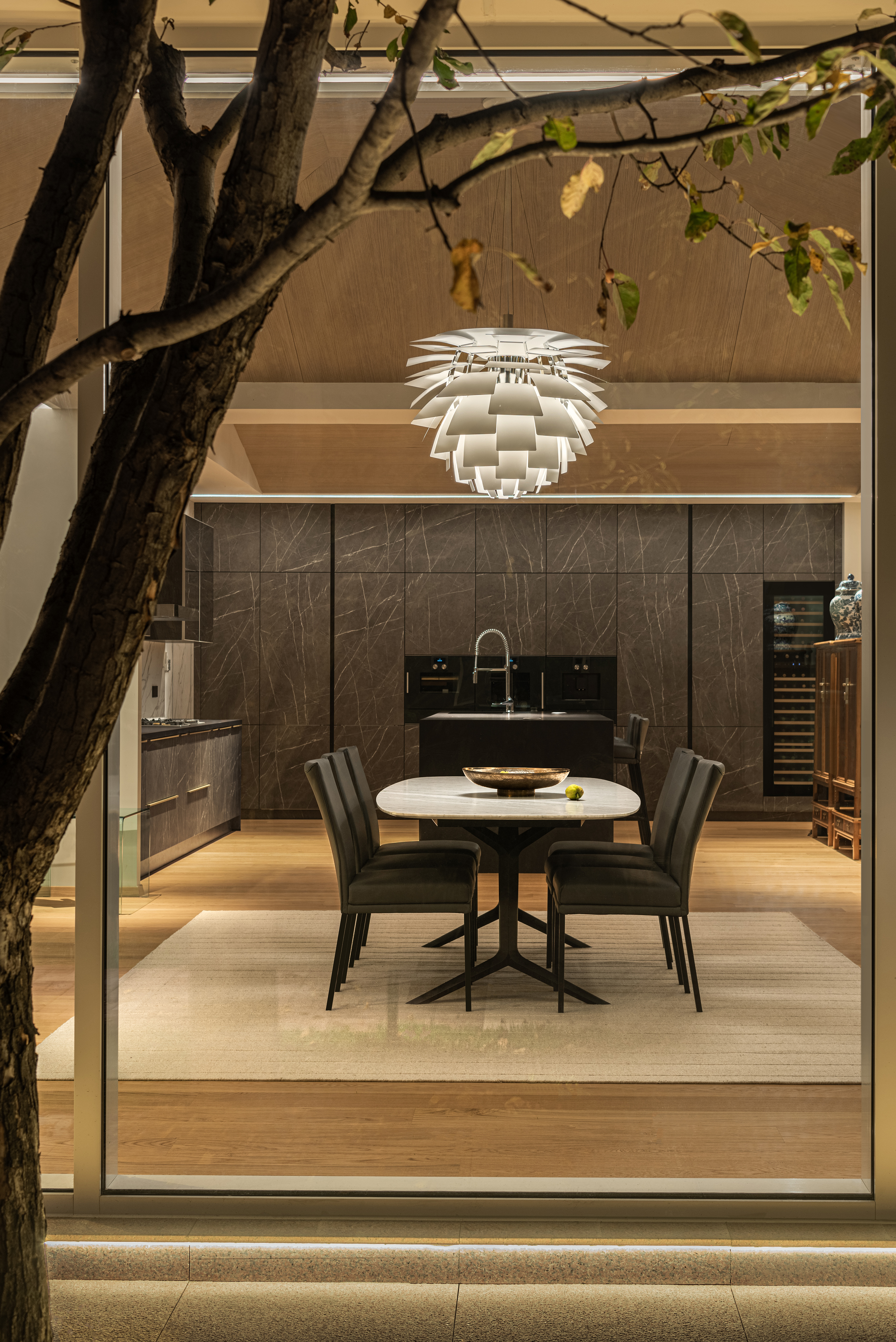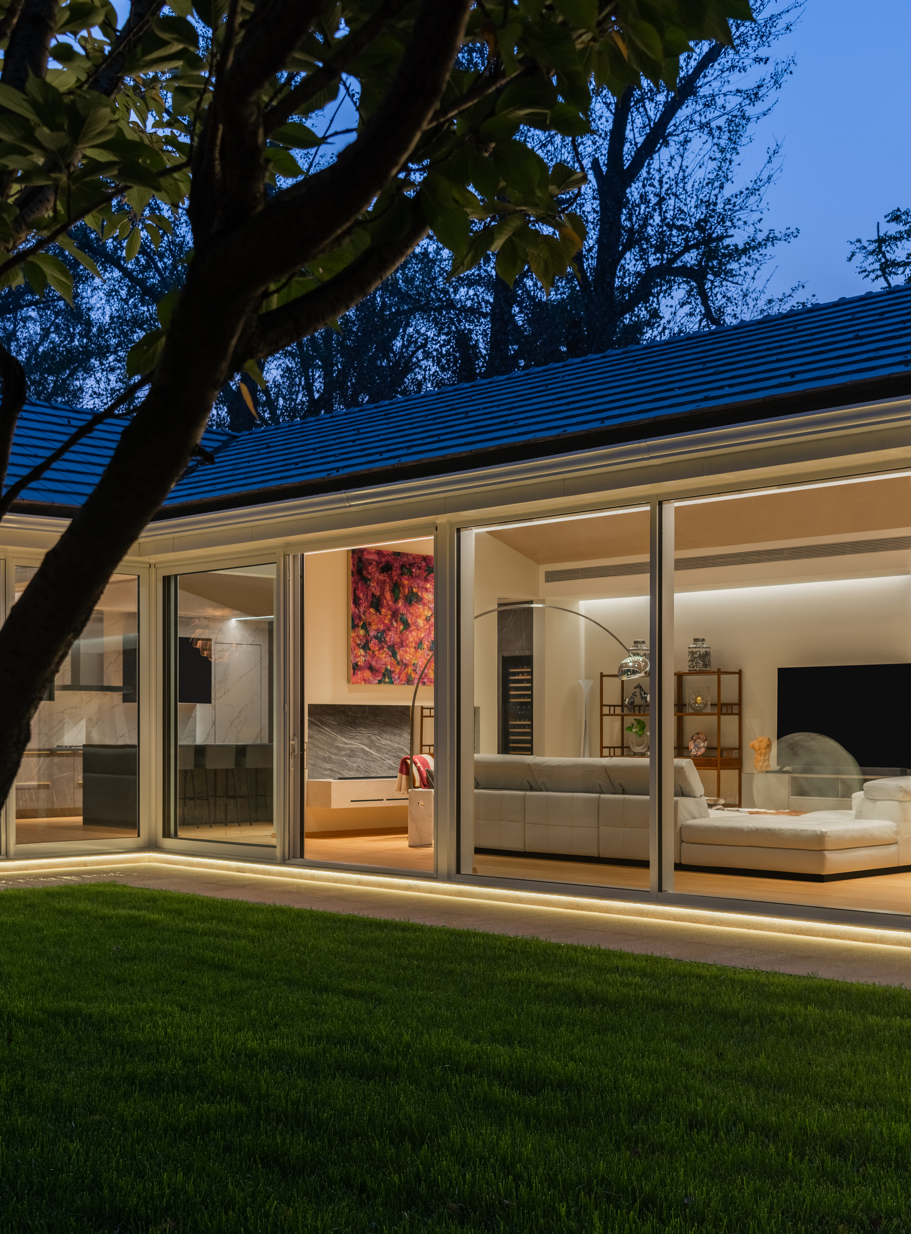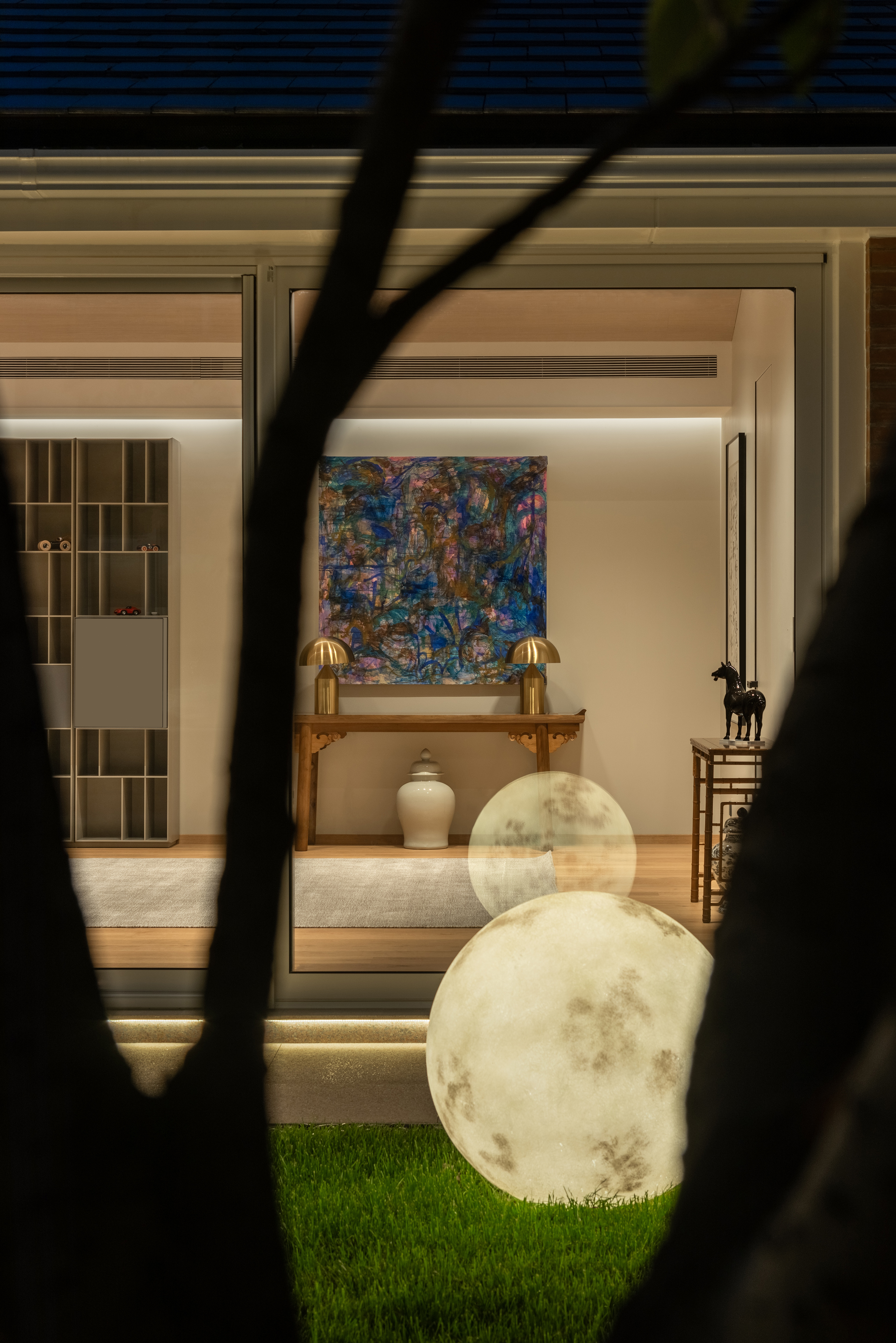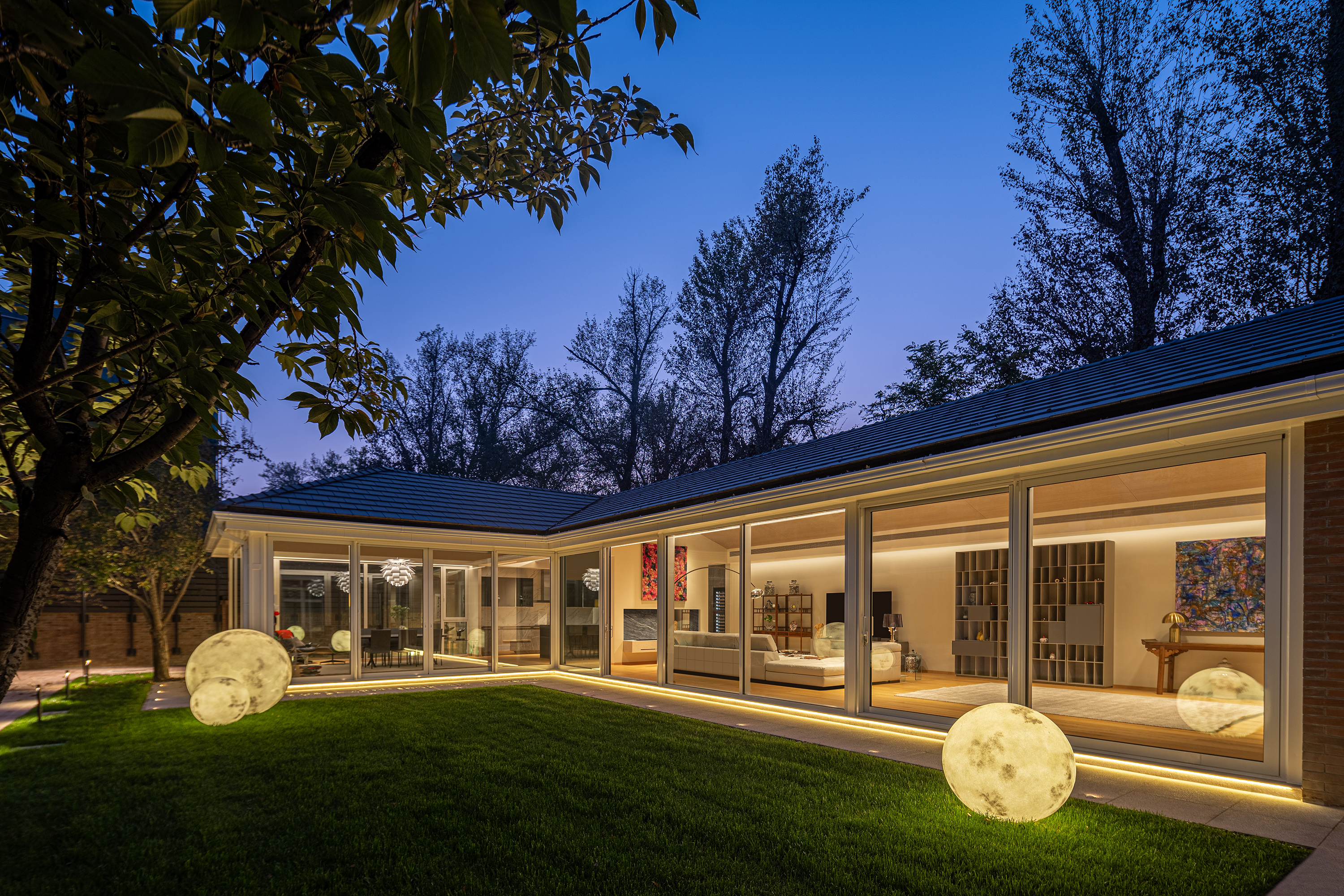 房子原身是个阳光房,是客户主楼别墅的附属空间。设计师巧妙地将自然光与人工照明相结合,白天阳光洒进屋内,为室内带来自然的明亮舒适。夜晚灯光亮起,散发出温暖的光芒,星空的星光与灯光交相辉映,在此静坐,聆听夜的声音,感受风的轻抚,沉浸于如梦如幻的美好之中。 This house was originally a sunroom and was an ancillary space to the client's main villa. The designer cleverly combines natural light with artificial lighting, allowing sunlight to shine into the room during the day, bringing natural brightness and comfort to the interior. At night, the lights light up, emitting a warm glow. The starry sky and the lights complement each other. Sitting here, listening to the sound of the night, feeling the gentle breeze, and immersing oneself in a dreamlike beauty.
