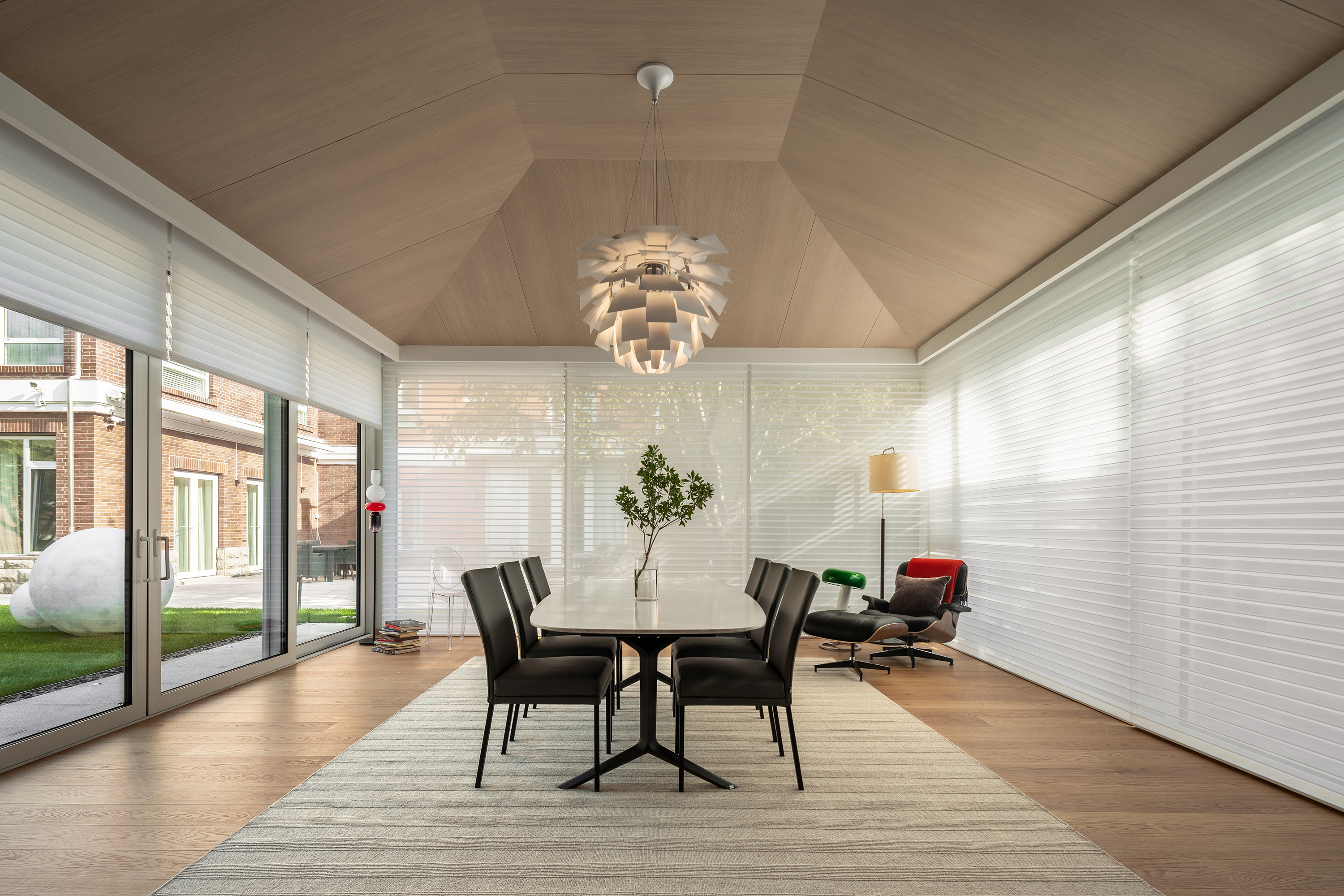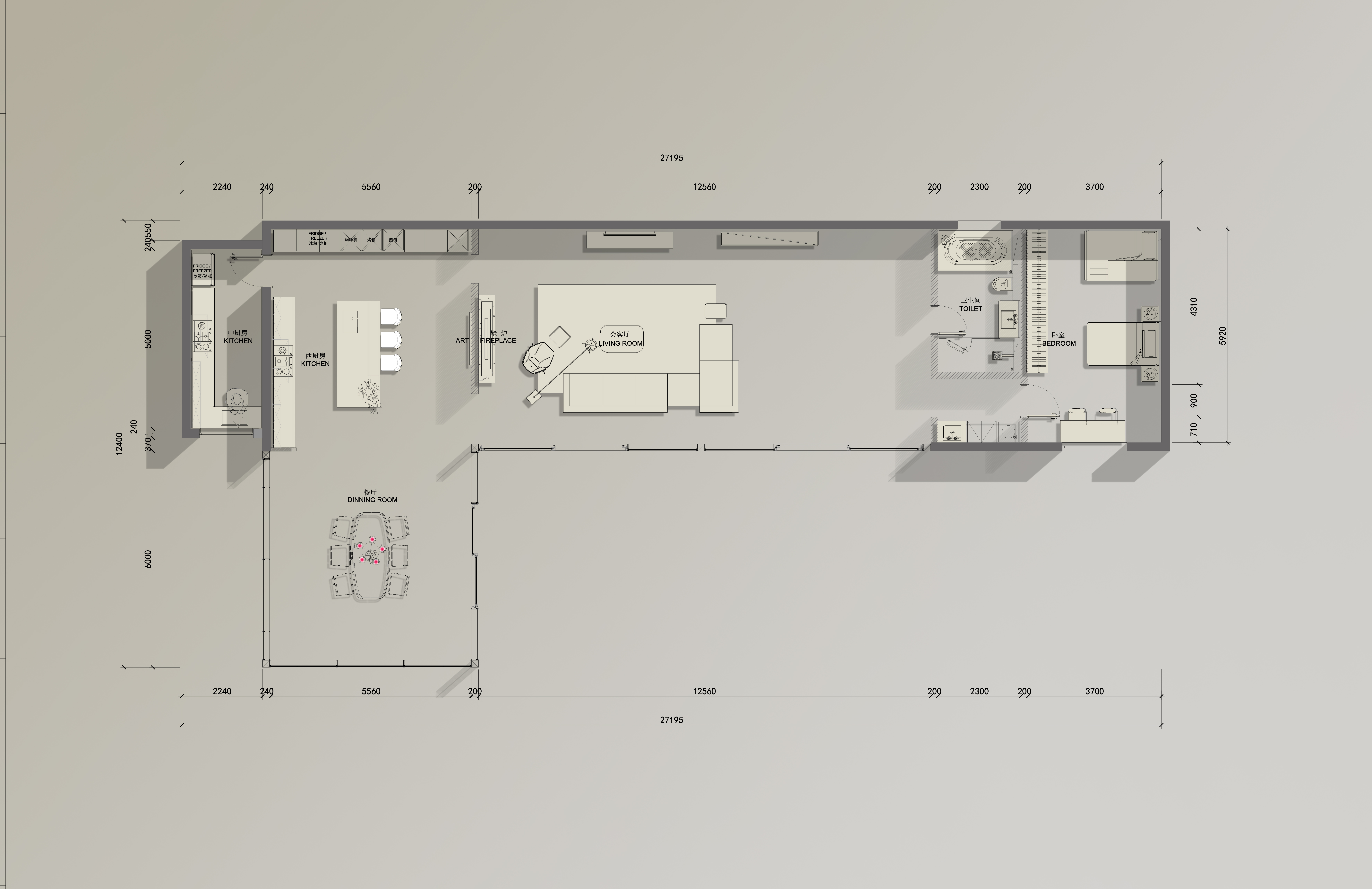 空间布局:考虑到甲方在有主楼别墅空间的提前下,做为甲方与孩子的亲子、会客空间,230平米的阳光房,只做为一居室来设计,长度12.5米的客厅让孩子有充足的空间在里面活动。而西厨和餐厅做为了甲方主要会客的区域。