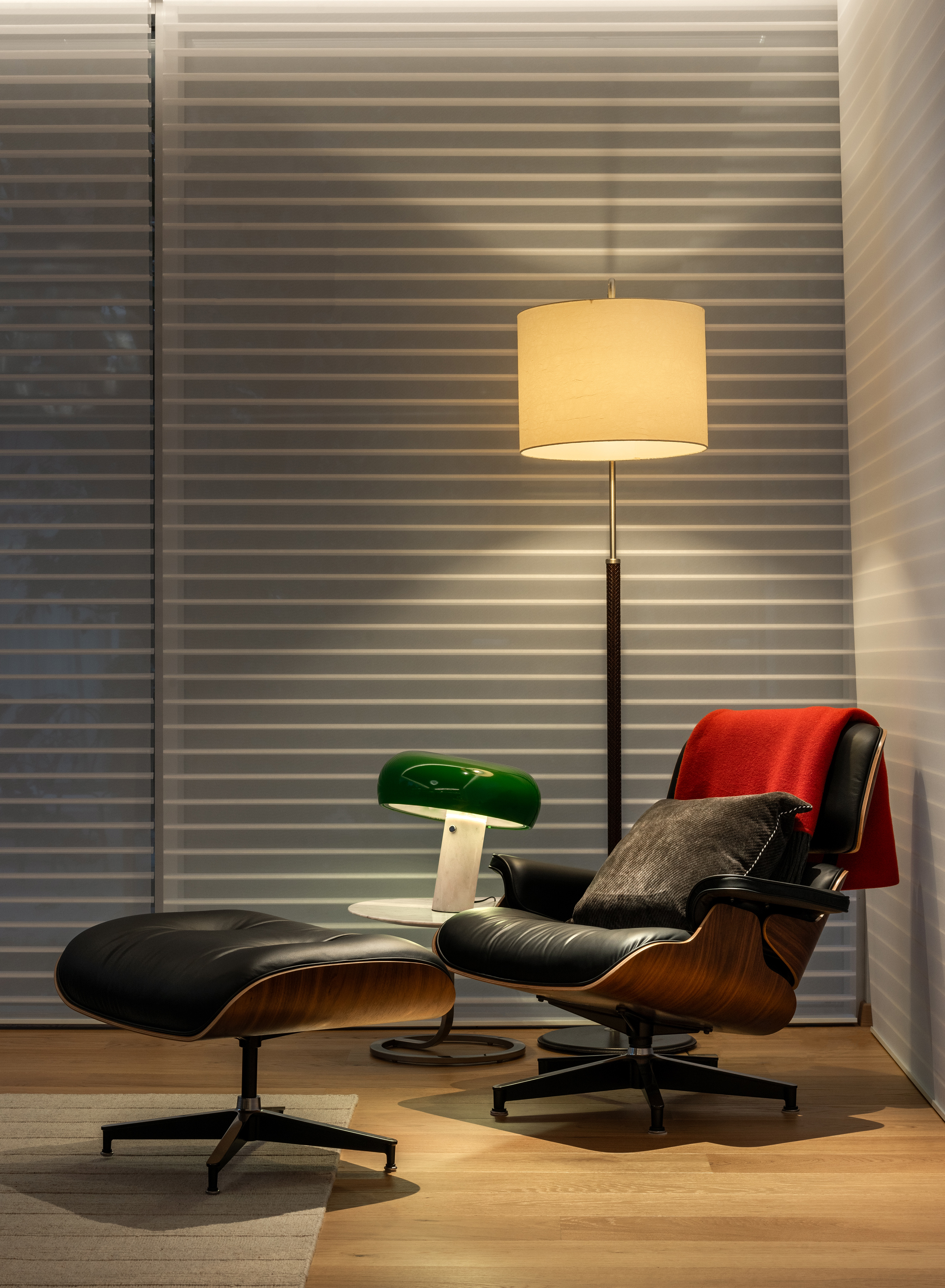 坐在 Eames 躺椅上独享自己的悠闲时光。 Sitting on the Eames lounge chair, enjoying your leisure time alone. 《 Eames Lounge Chair 》的设计起源,来自 Eames 夫妇对于开发『量产家具设计』的追求,并且在当时受到传统英式俱乐部椅( Club Chair )的风格影响。曾经 Charles 在一封信里面提到他的设计理念。信中写道,他所想像中的这把座椅,将如同棒球手套般带给人温暖的包覆。如今《伊姆斯躺椅》成为了舒适的代表,将每一位乘坐的人完整地包覆在里面,『舒适却不刻意』的精神,经过时间的淬链,成为熟悉顺手的存在。