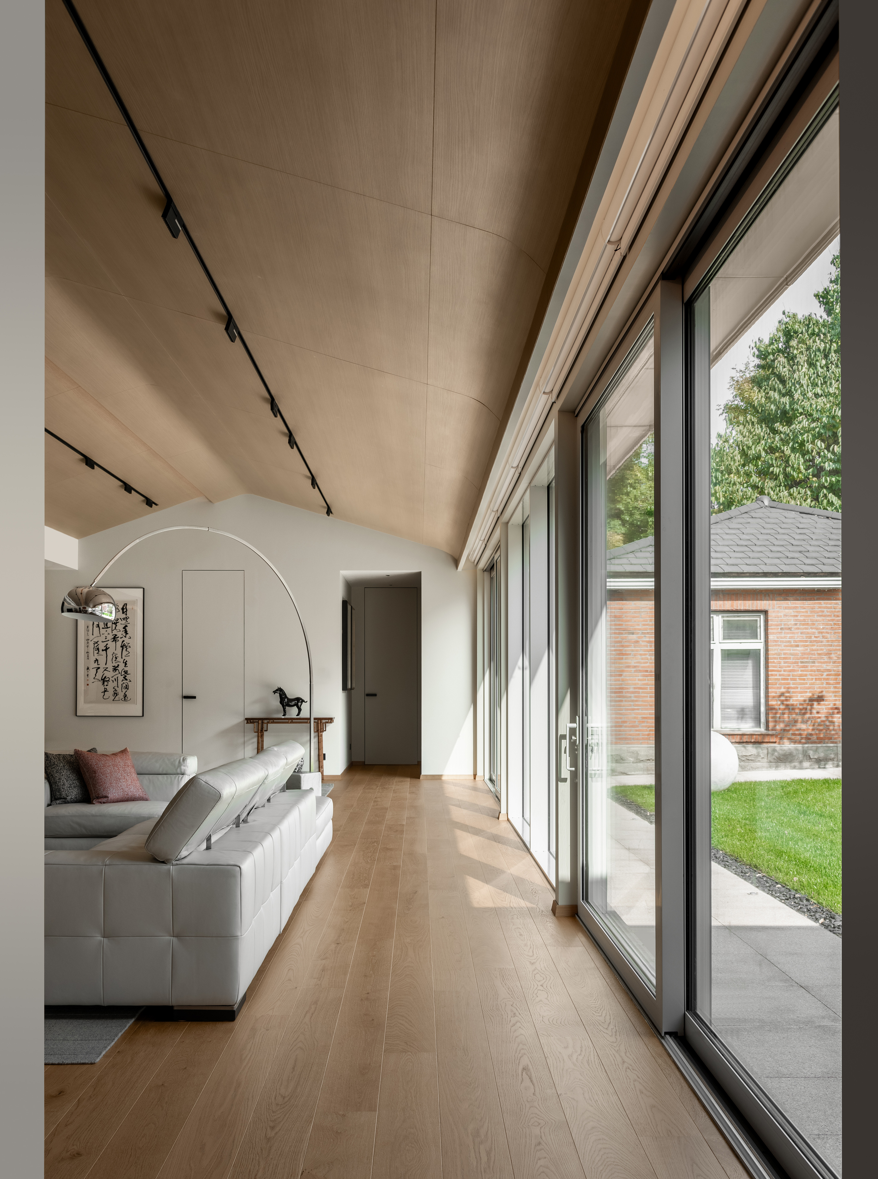 为了使自然巧妙地融入室内的空间之中,设计师建议将原有的窗户尺寸向下延伸,换成支持定制的旭格 ASE 60提升推拉门。这样不仅实现了高达3米的一体化定制,同时兼具安居防盗、防暴雨的稳定性能。40mm极窄面宽,隐藏式五金组件在扩大视野的同时提升了室内的采光面积,让家萦绕在生机盎然的宜人景致之中。 In order to cleverly integrate nature into the indoor space, the designer suggests extending the original window size downwards and replacing it with a customized Xuge ASE 60 raised sliding door. This not only realizes the integrated customization of up to 3 meters, but also has the stability of anti-theft and rainstorm prevention. 40mm extremely narrow and wide, the hidden hardware components not only expand the view but also enhance the indoor lighting area, making the home linger in a vibrant and pleasant scenery.