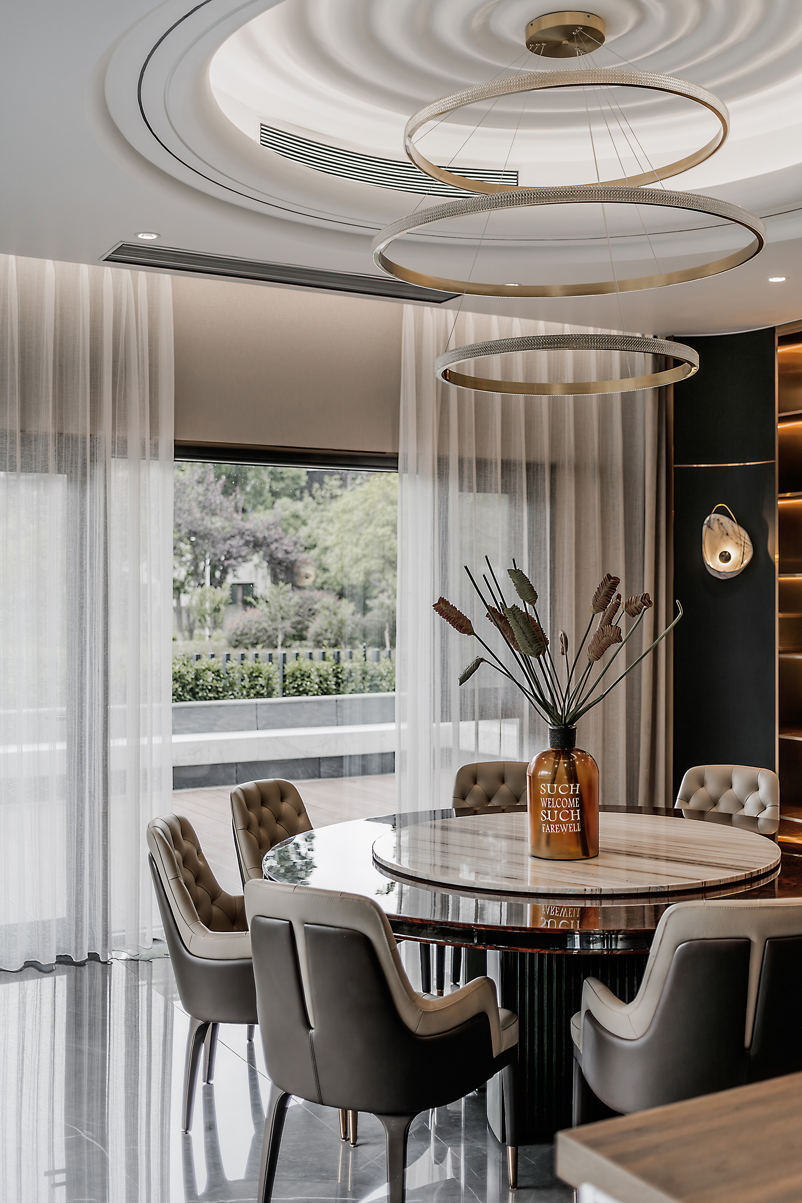 一层作为家庭多功能的开放空间,开放、自由、社交,给生活更多可能,融合了车库、玄关收纳、会客、餐厨互动、书房、园林等区域,满足了家庭人车入户、聚餐、会客、露天休闲和动态收纳等多种需求。