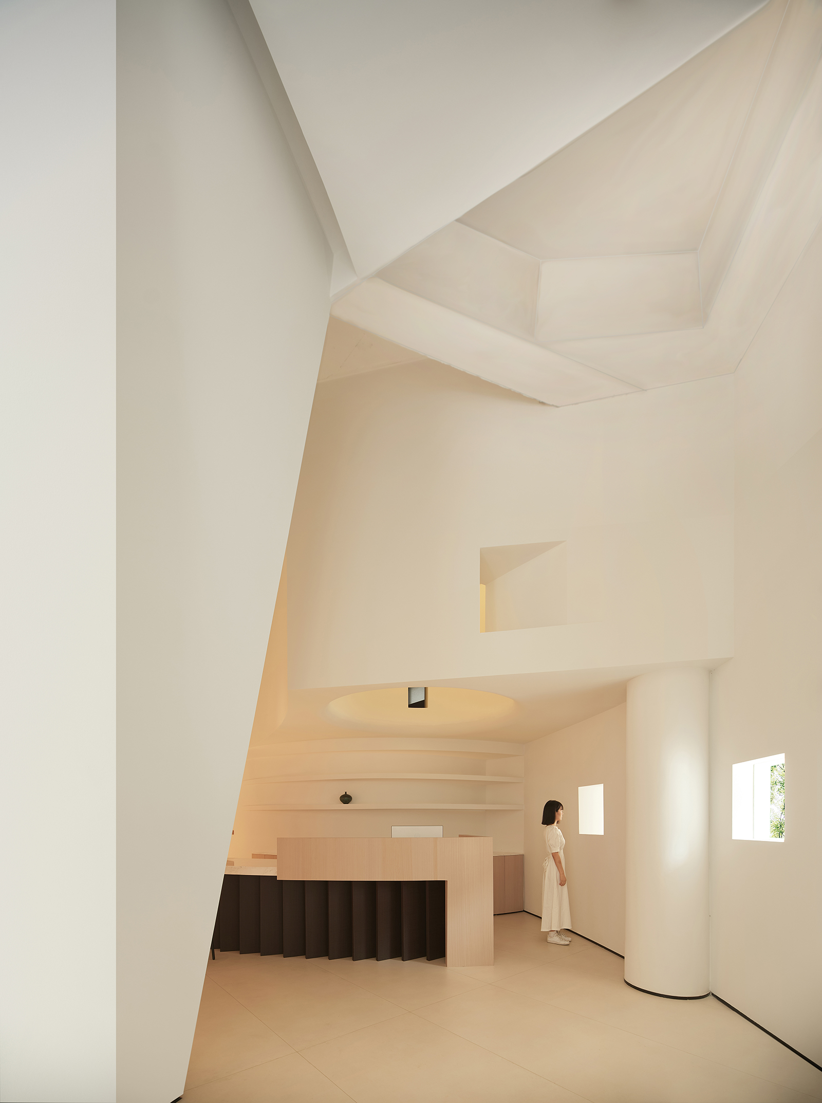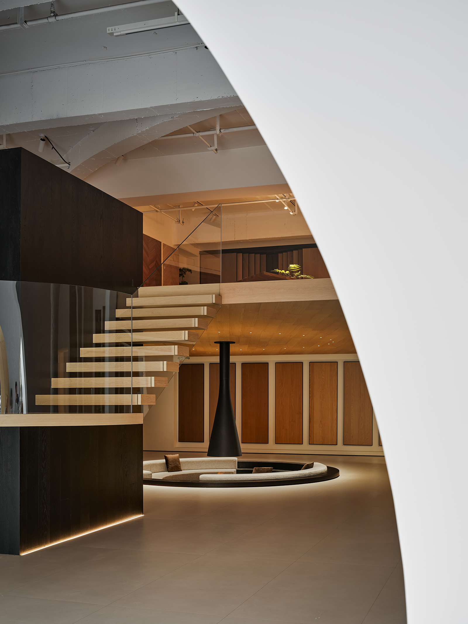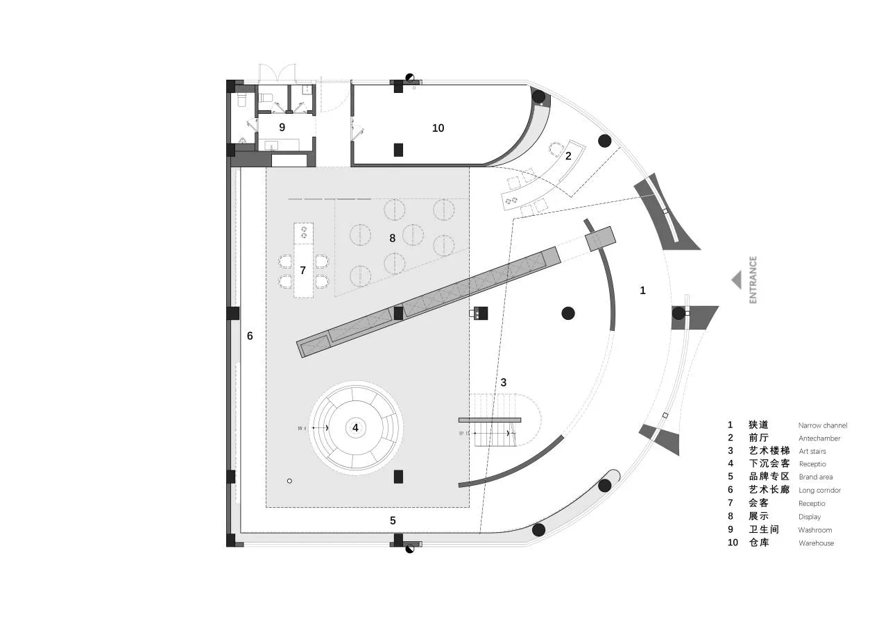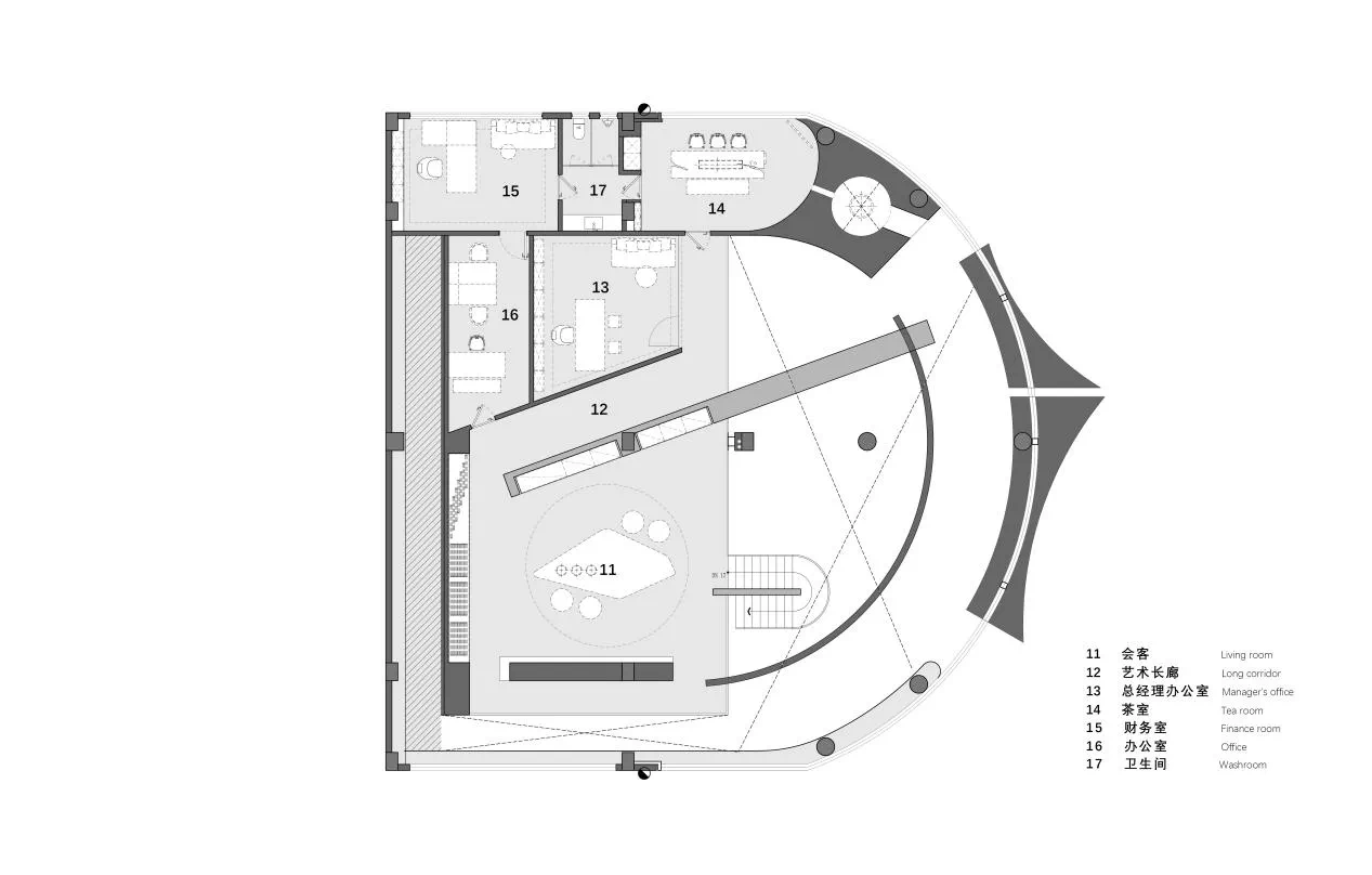 弧形是富有艺术气韵的设计语汇,纵横相交的形态完美地诠释了“重叠建构”的本意,两个相互呼应的弧形面隔出一条艺术性的展示长廊,垂直的楼梯与水平面穿插交错,通过顶面的塑造将三维之间相互作用。正中间的下沉式休闲区别具一格,旋转展厅让空间显得更有趣味,线条与图形的交汇共同构建了空间叙事与氛围的营造,共生多元的场域油然而生。
