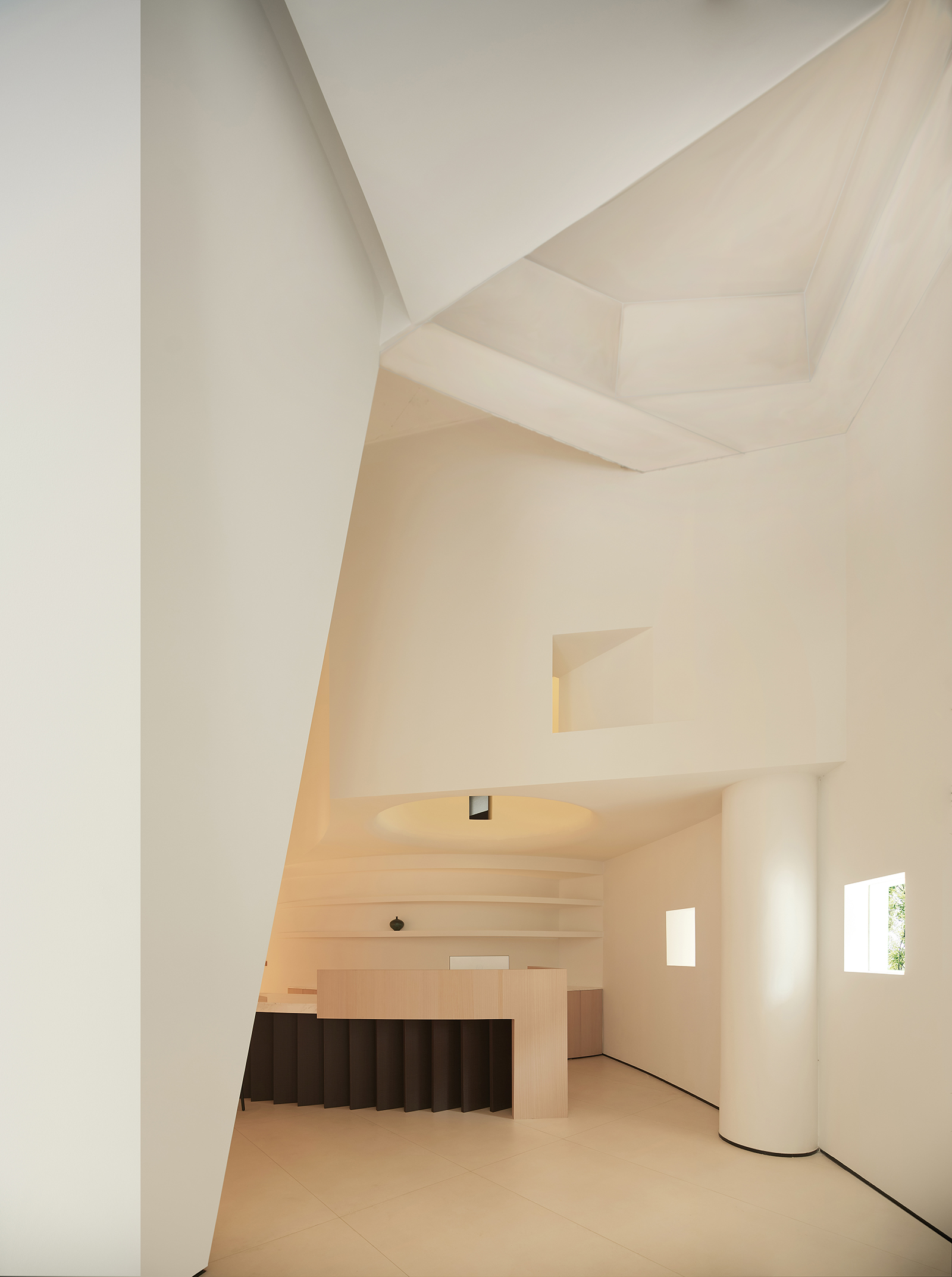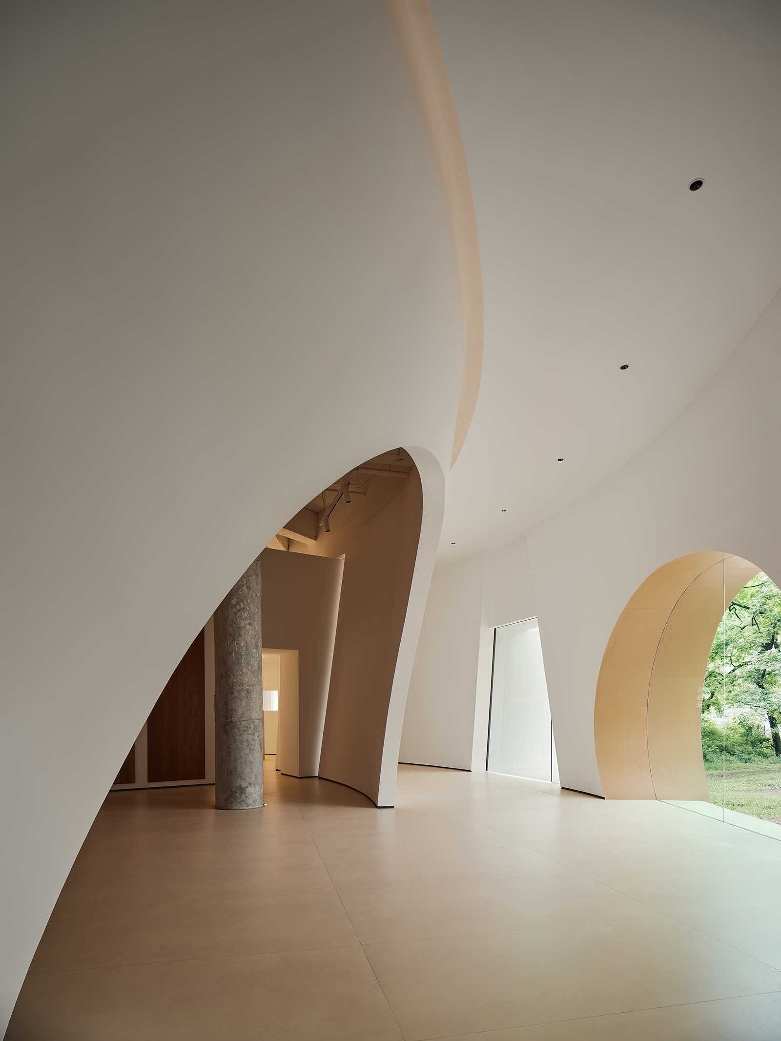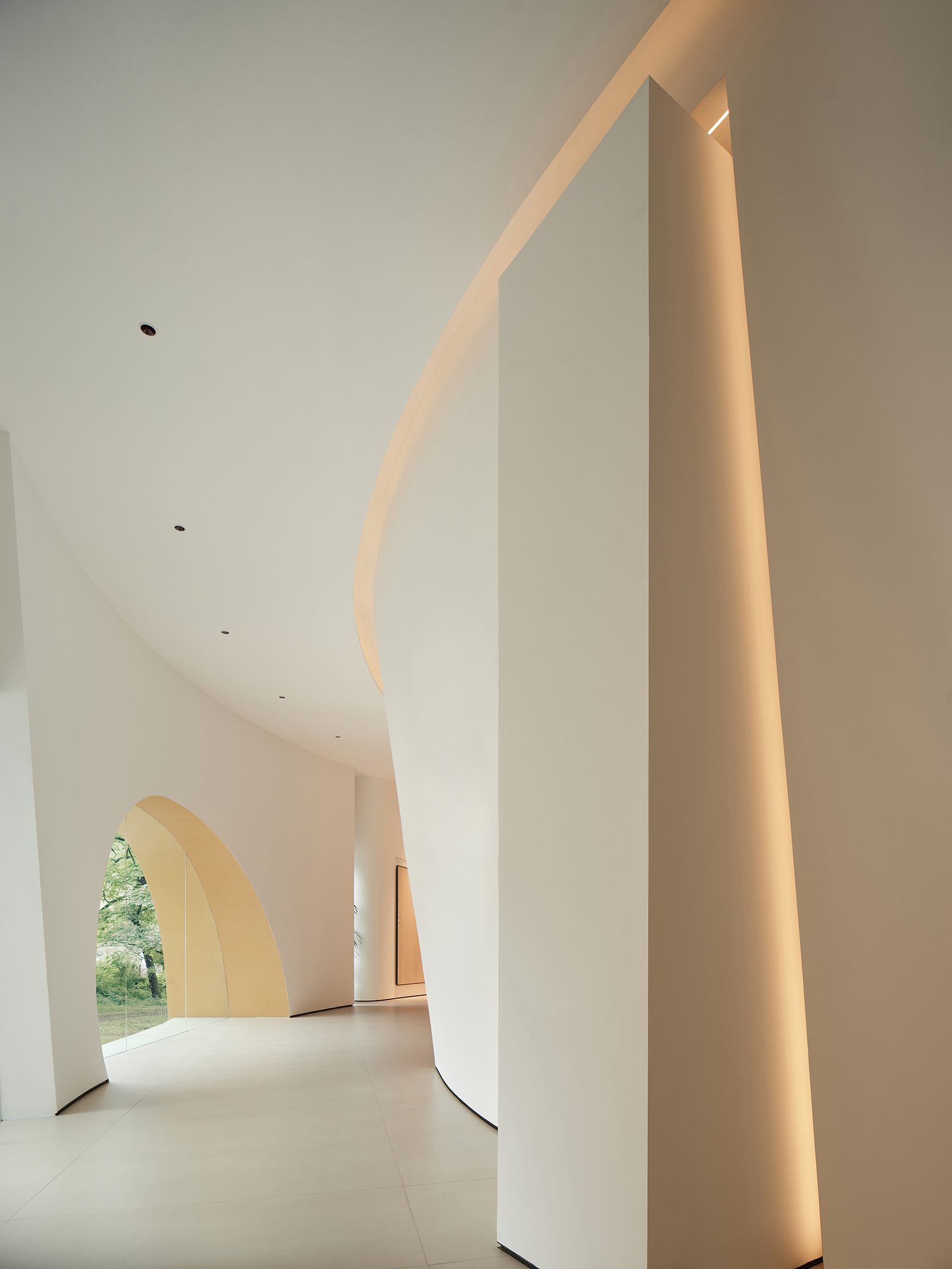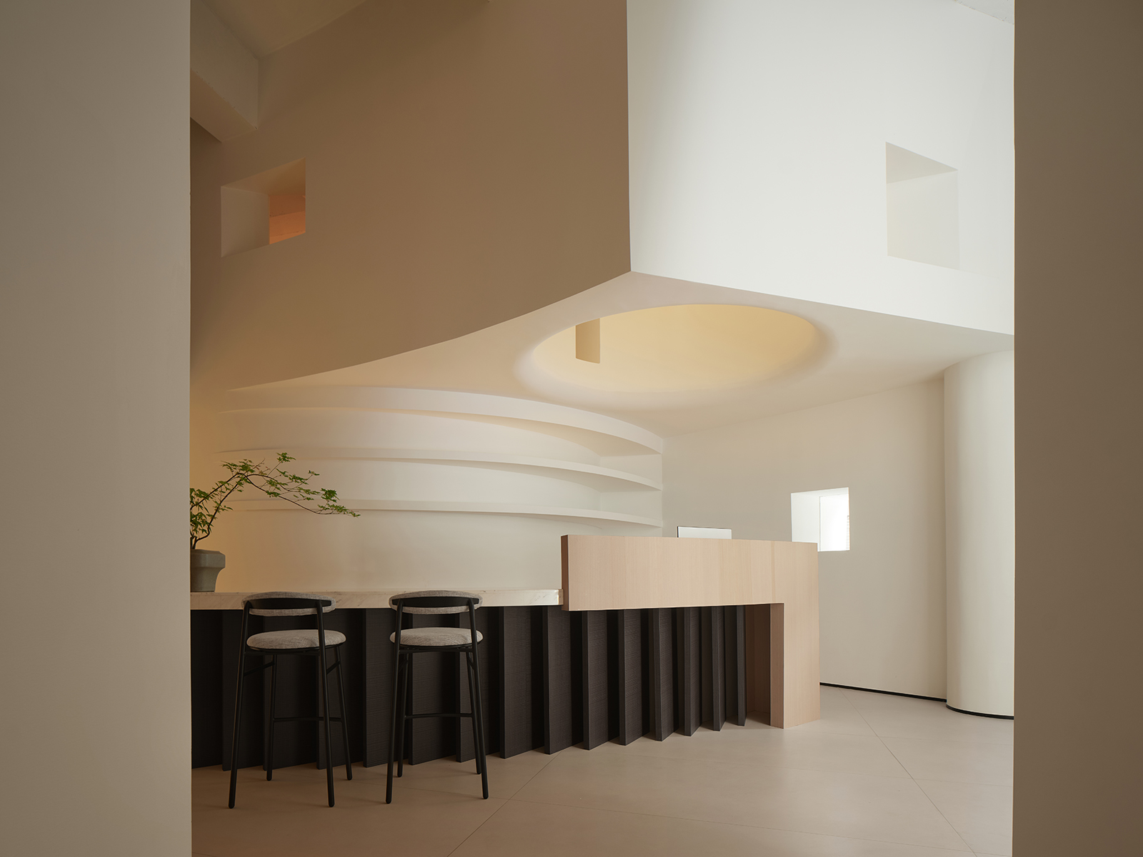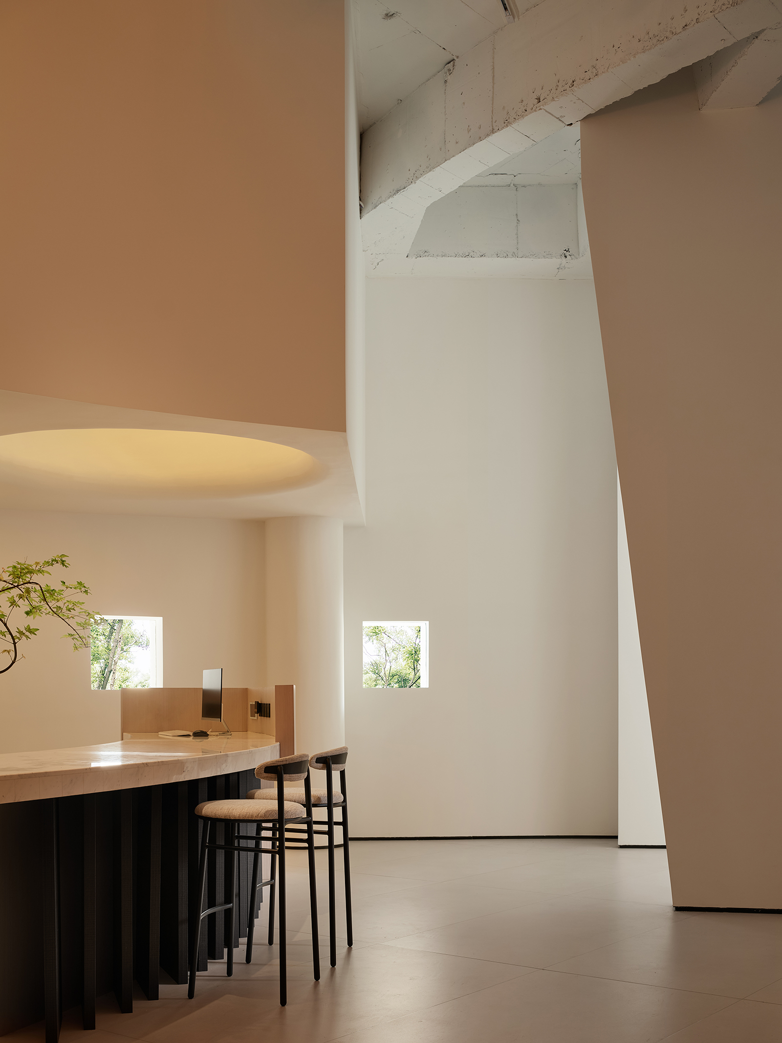 弧形是富有艺术气韵的设计语汇,纵横相交的形态完美地诠释了“重叠建构”的本意,两个相互呼应的弧形面隔出一条艺术性的展示长廊,垂直的楼梯与水平面穿插交错,通过顶面的塑造将三维之间相互作用。正中间的下沉式休闲区别具一格,旋转展厅让空间显得更有趣味,线条与图形的交汇共同构建了空间叙事与氛围的营造,共生多元的场域油然而生。