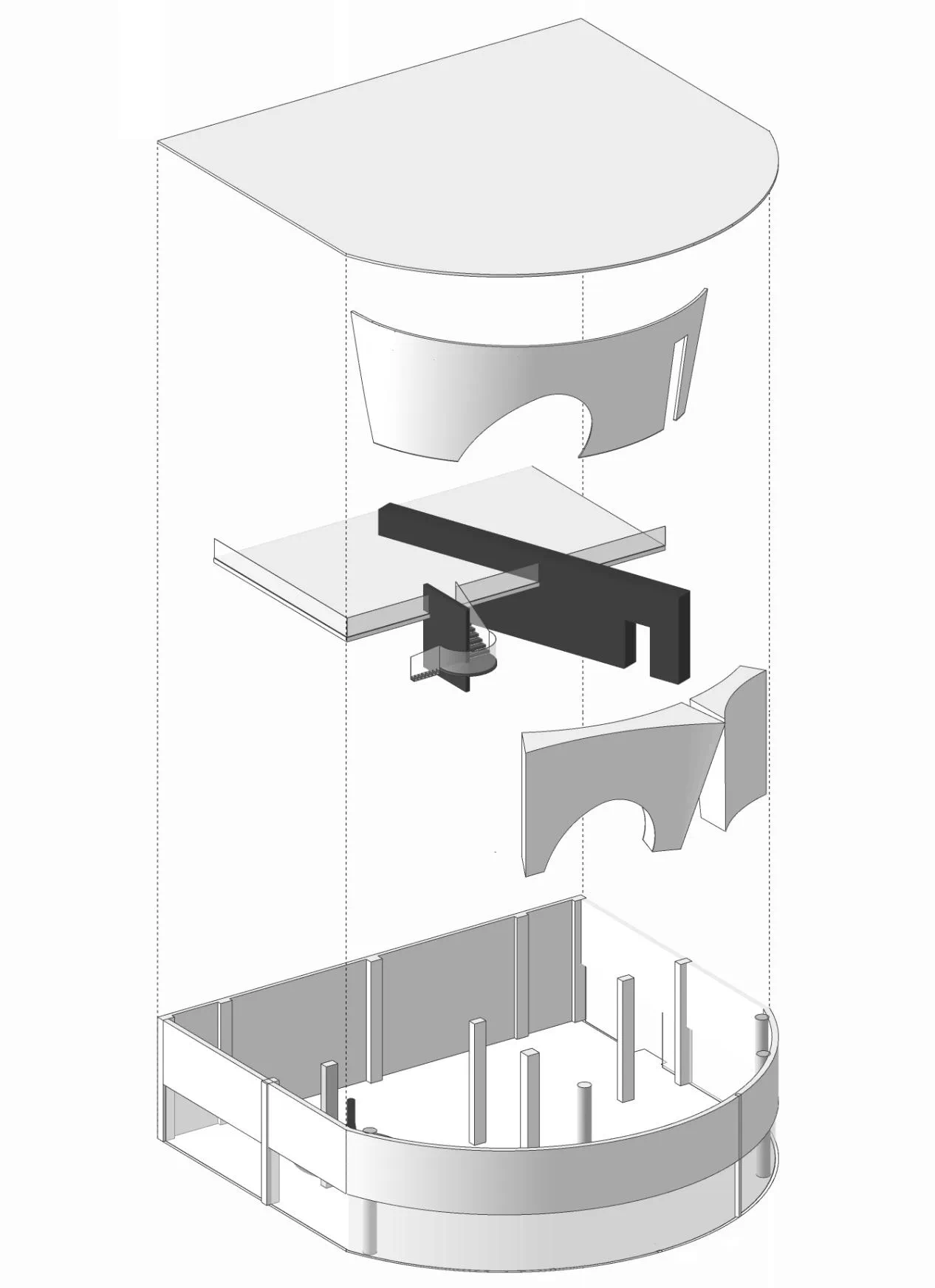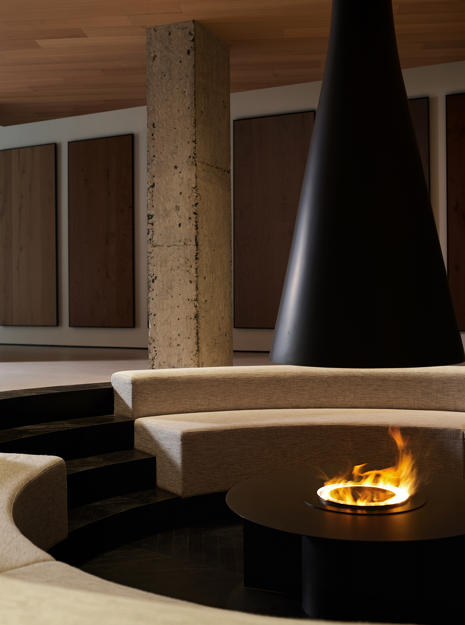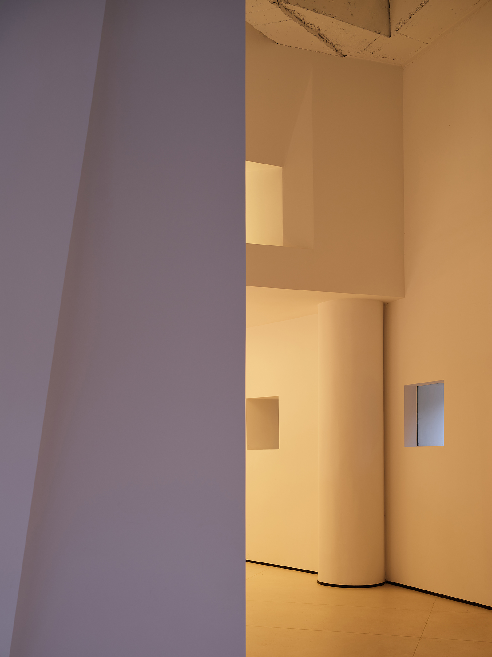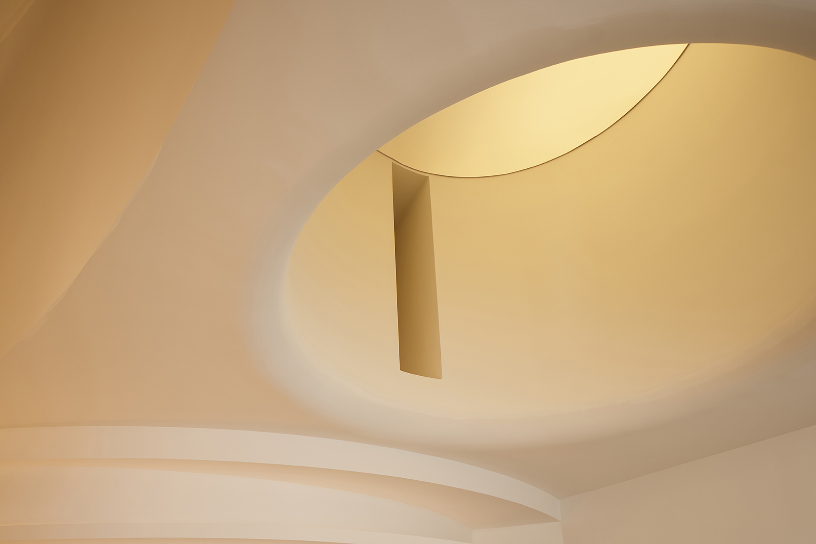 弧形是富有艺术气韵的设计语汇,纵横相交的形态完美地诠释了“重叠建构”的本意,两个相互呼应的弧形面隔出一条艺术性的展示长廊,垂直的楼梯与水平面穿插交错,通过顶面的塑造将三维之间相互作用。正中间的下沉式休闲区别具一格,旋转展厅让空间显得更有趣味,线条与图形的交汇共同构建了空间叙事与氛围的营造,共生多元的场域油然而生。