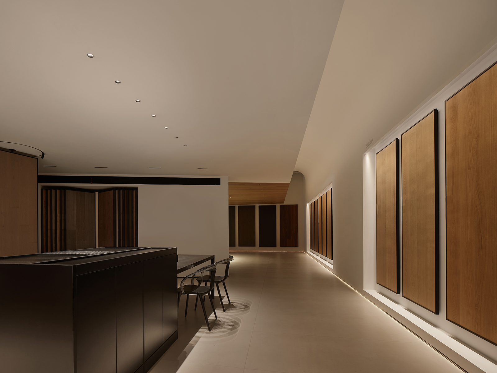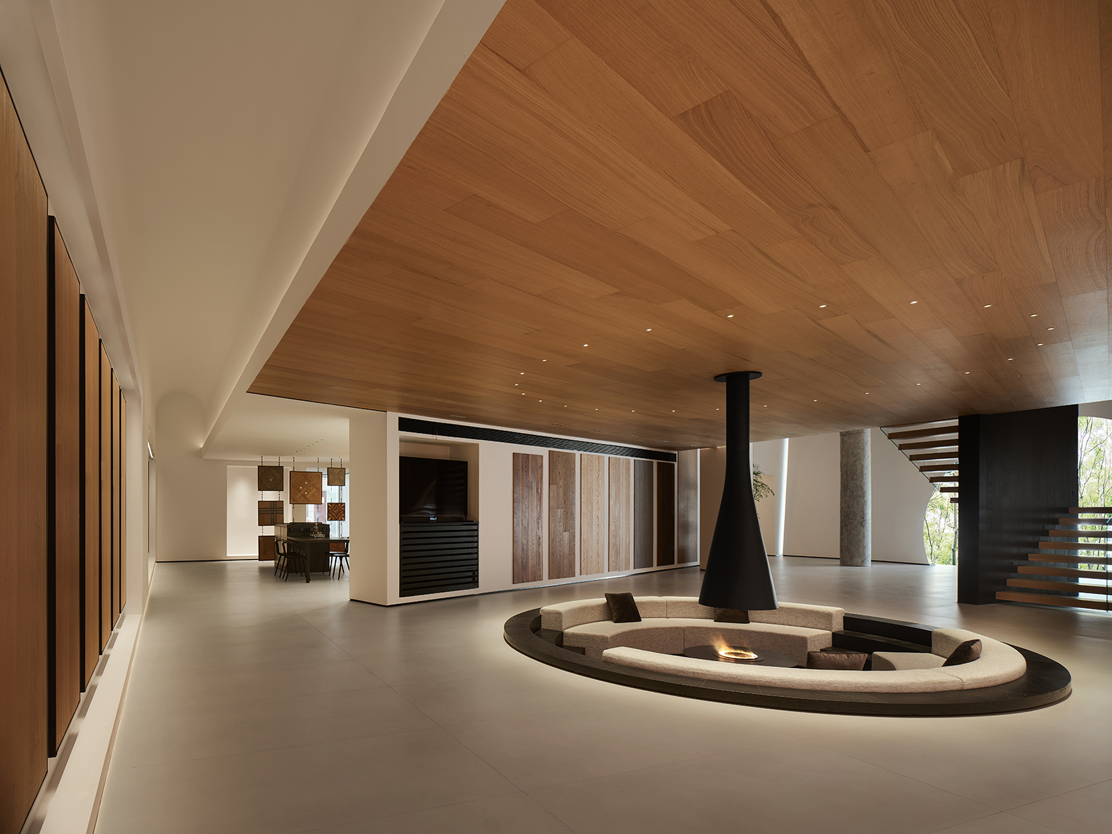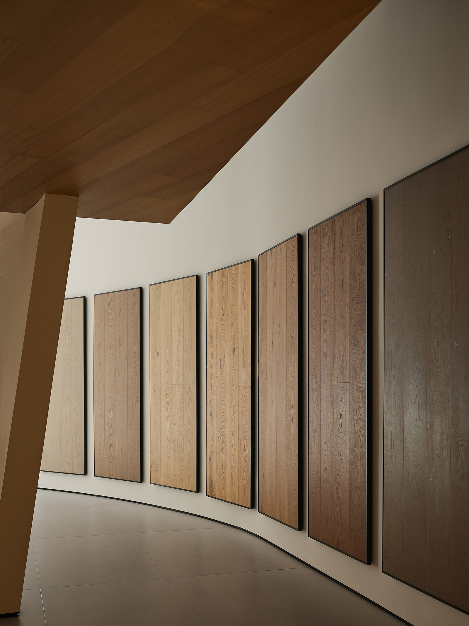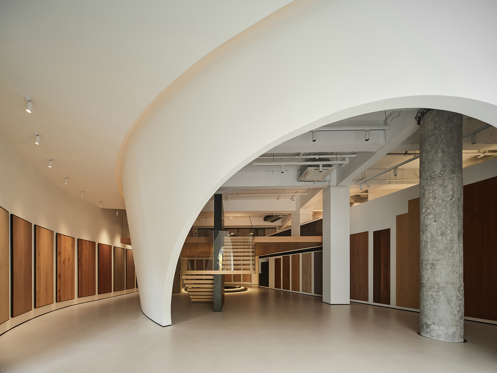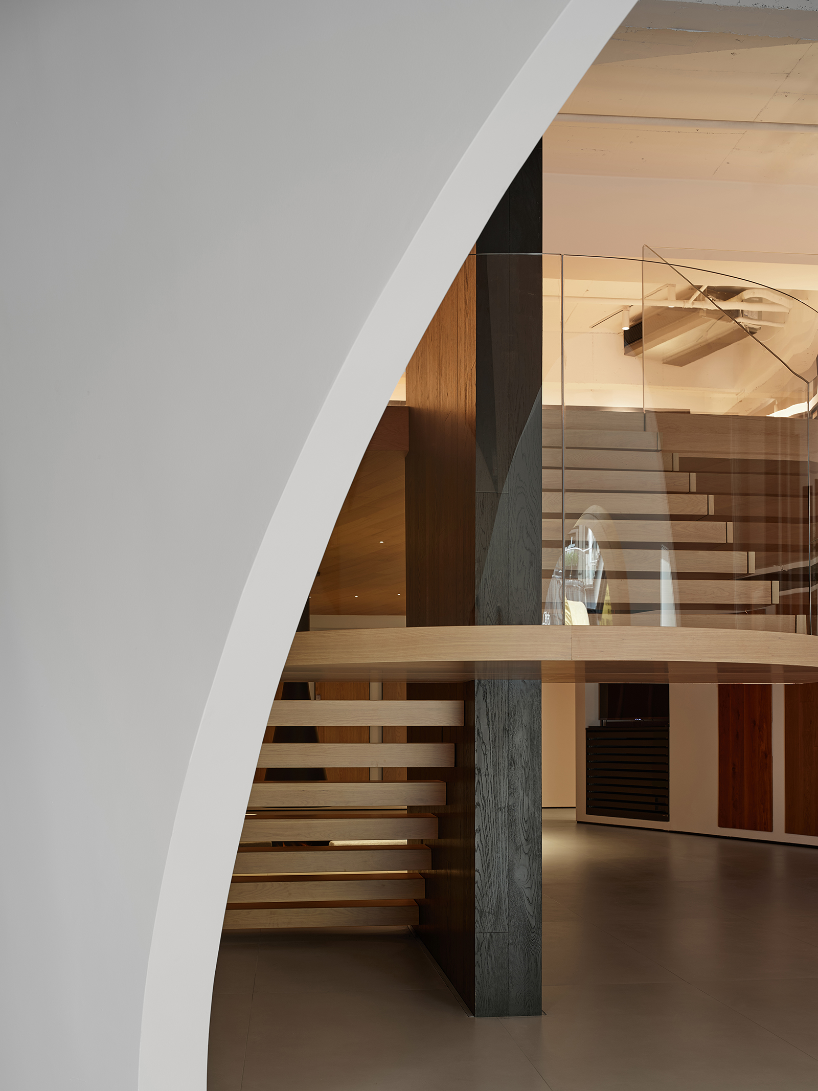 空间的整体色调是黑白与木质调的交融,以错叠穿插的弧线与几何图形,交汇出相互通达的空间。关于这个展厅所有的设计灵感都与地板这个产品的本质息息相关,门口交相呼应的两个大大的弧形,以森林为灵感的旋转展示区,与地板拼接相契合的桌子,从大的结构到小的细节,都是从根源出发诞生的灵感,善用材质与比例创造现代意境,营造出精致而简约的美感。
