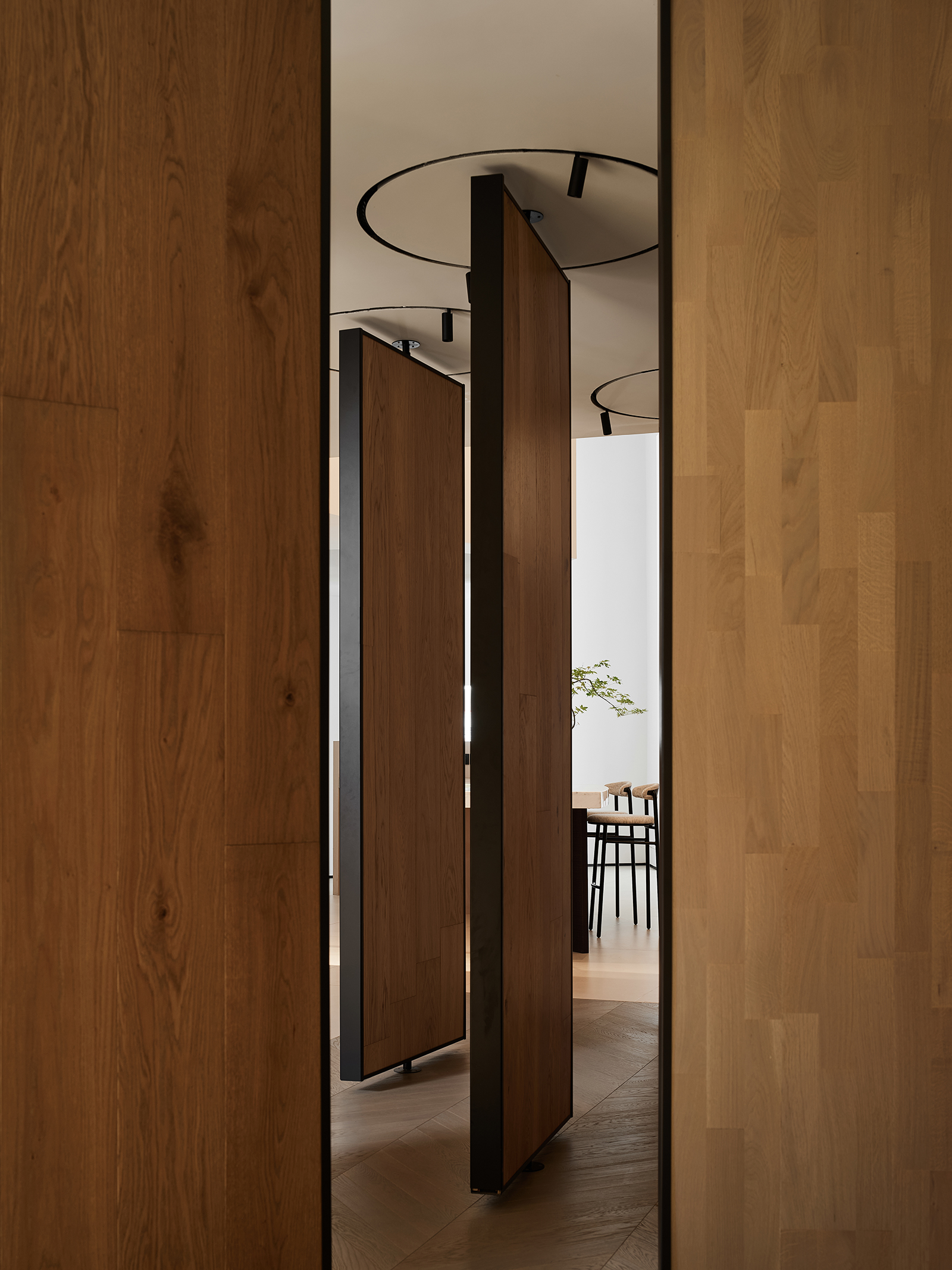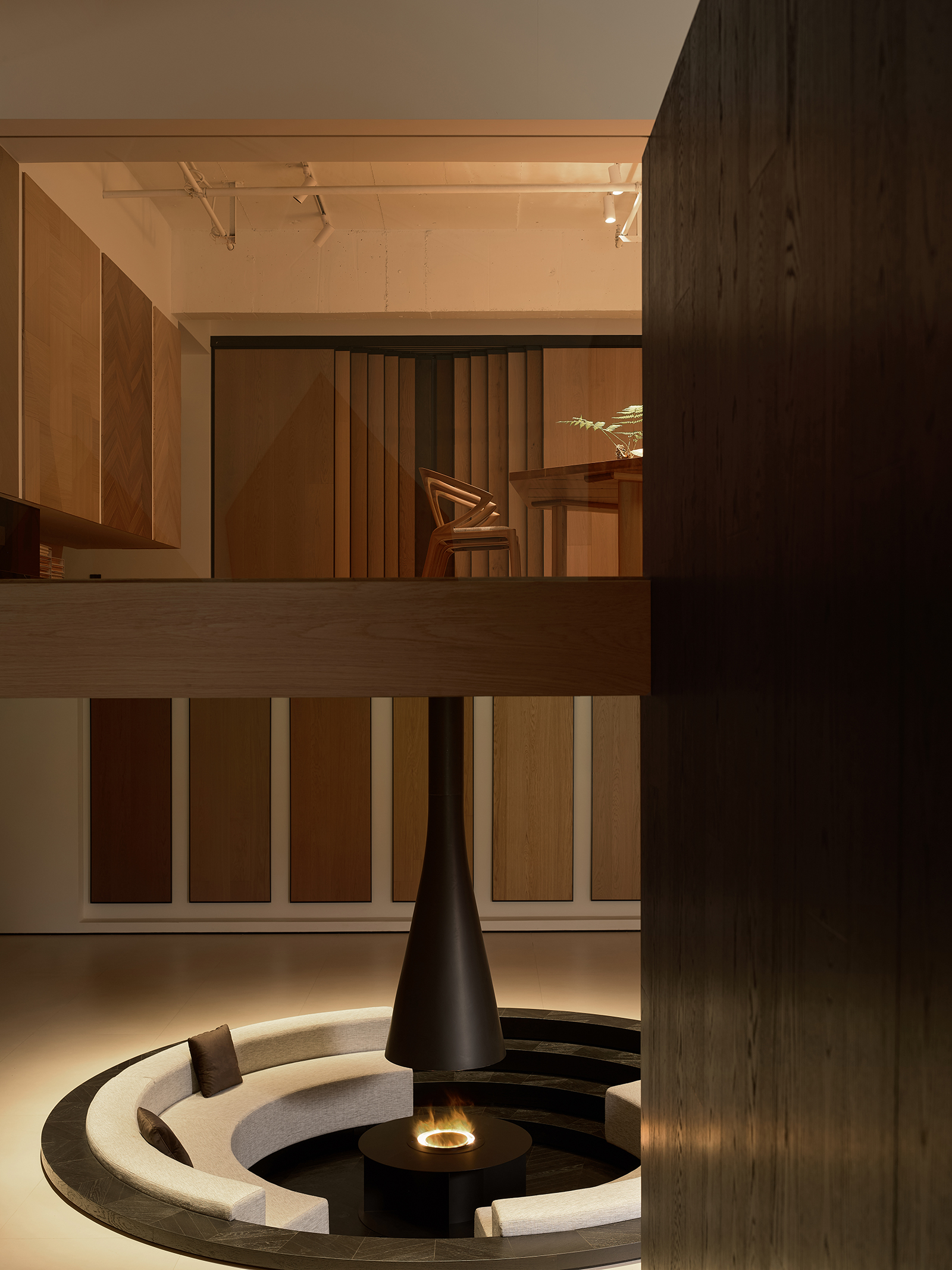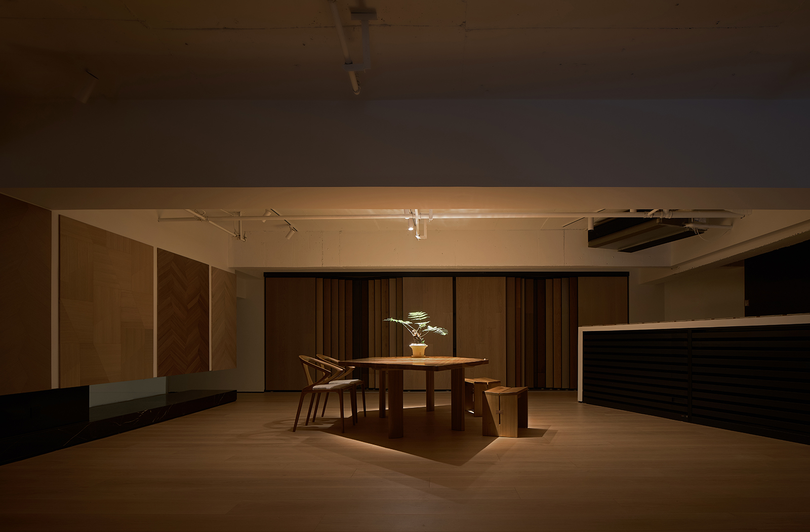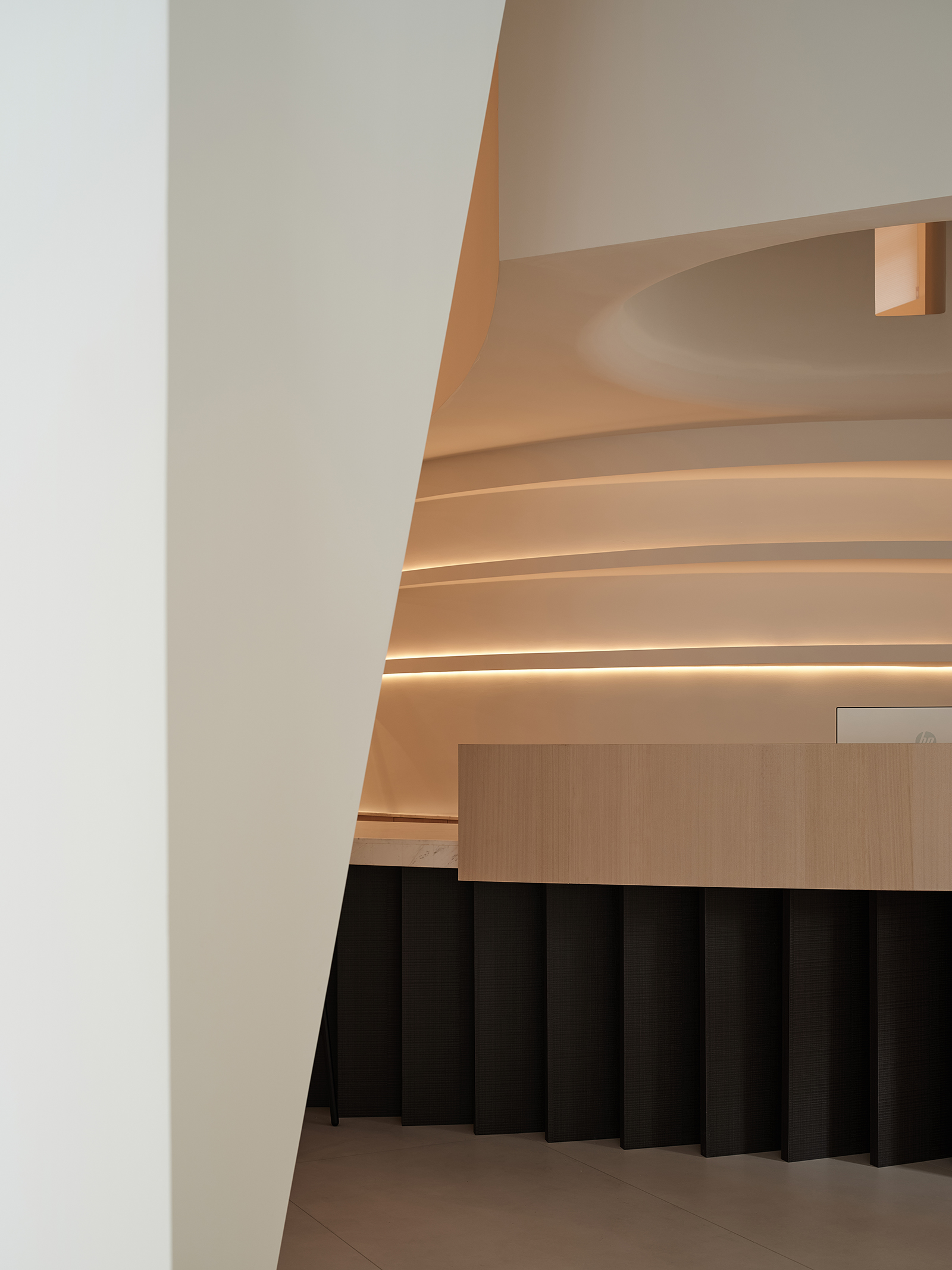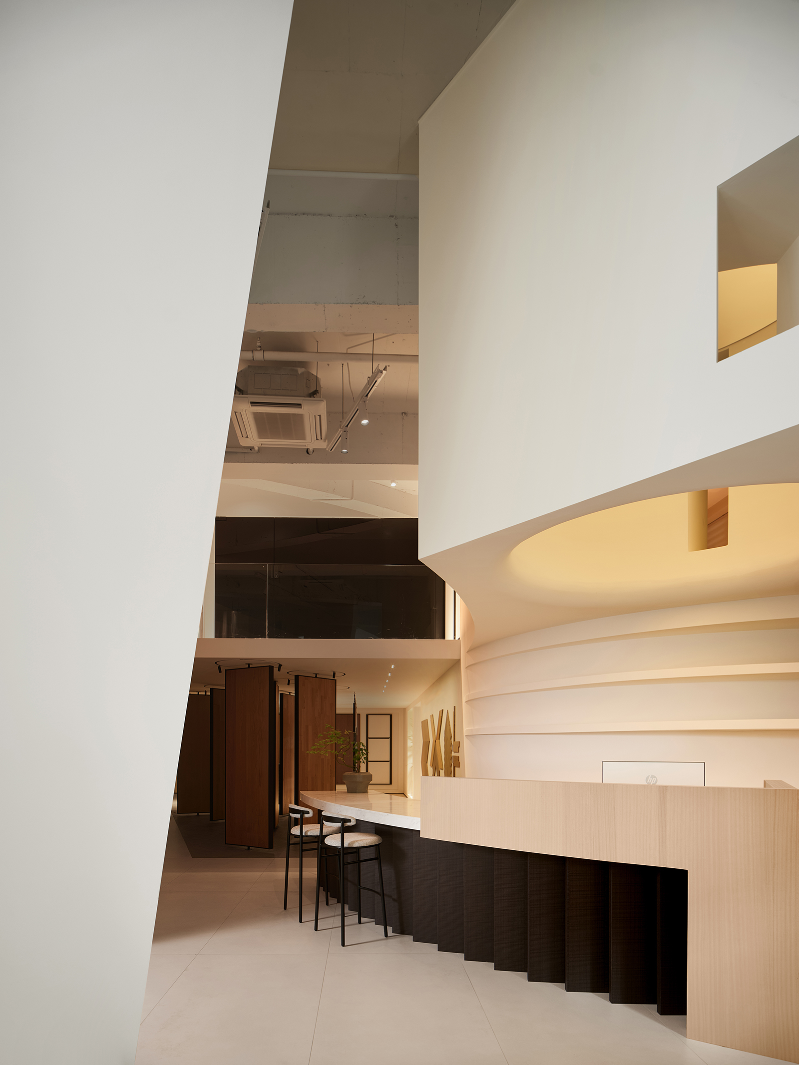 空间的整体色调是黑白与木质调的交融,以错叠穿插的弧线与几何图形,交汇出相互通达的空间。关于这个展厅所有的设计灵感都与地板这个产品的本质息息相关,门口交相呼应的两个大大的弧形,以森林为灵感的旋转展示区,与地板拼接相契合的桌子,从大的结构到小的细节,都是从根源出发诞生的灵感,善用材质与比例创造现代意境,营造出精致而简约的美感。