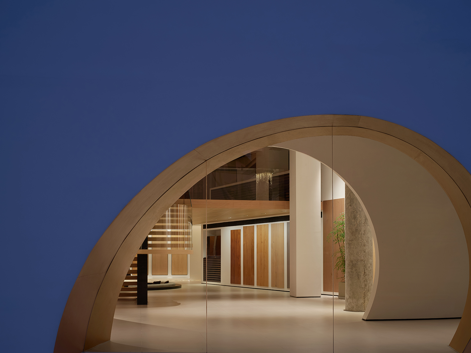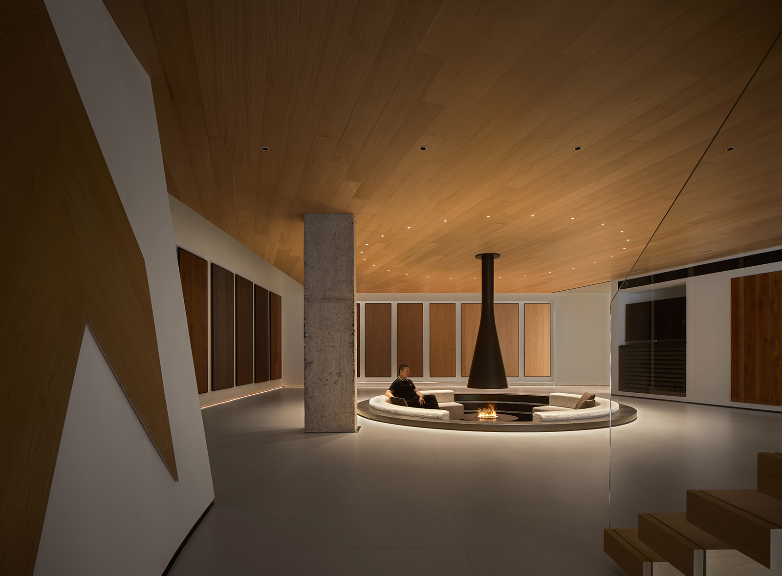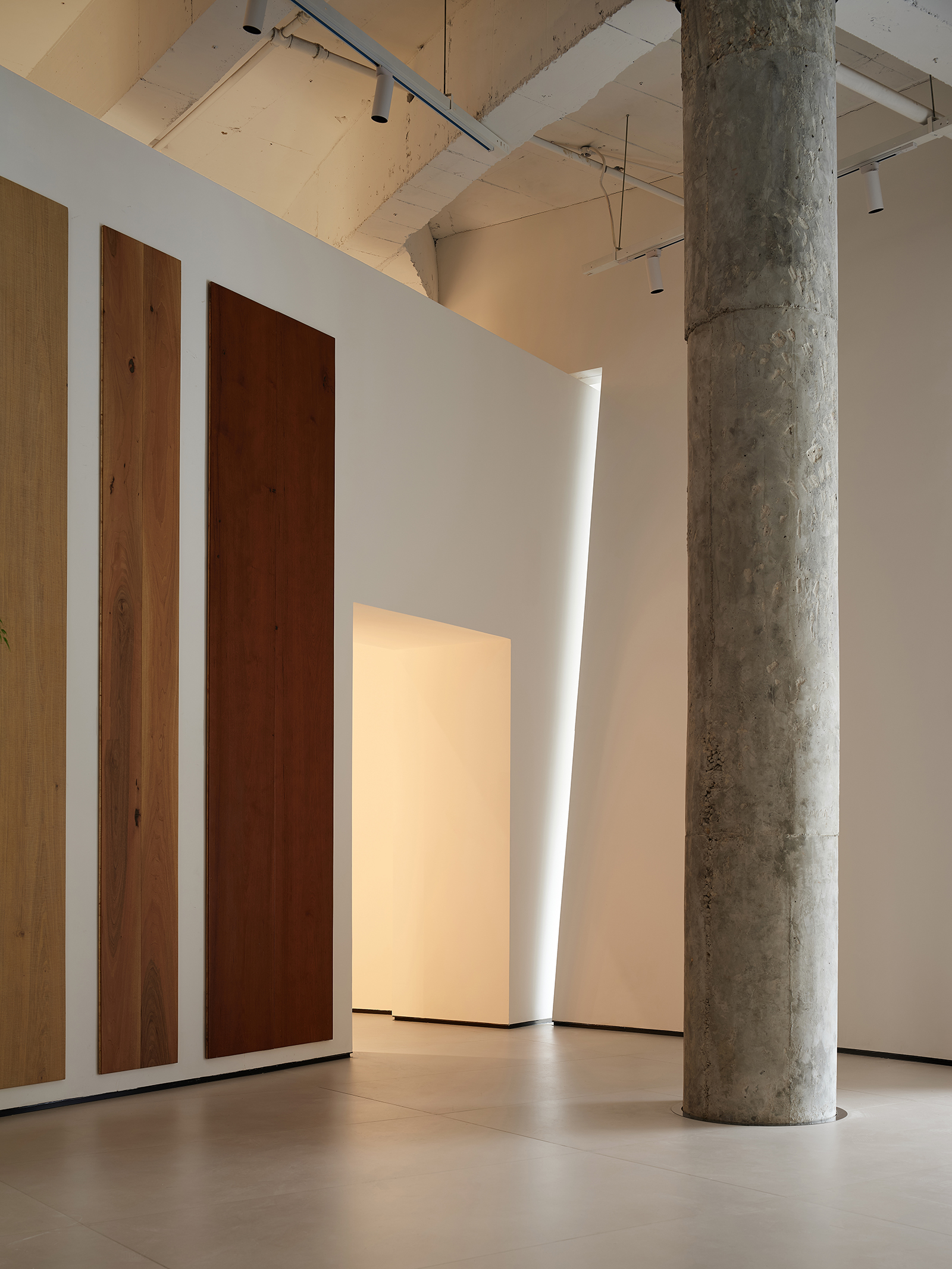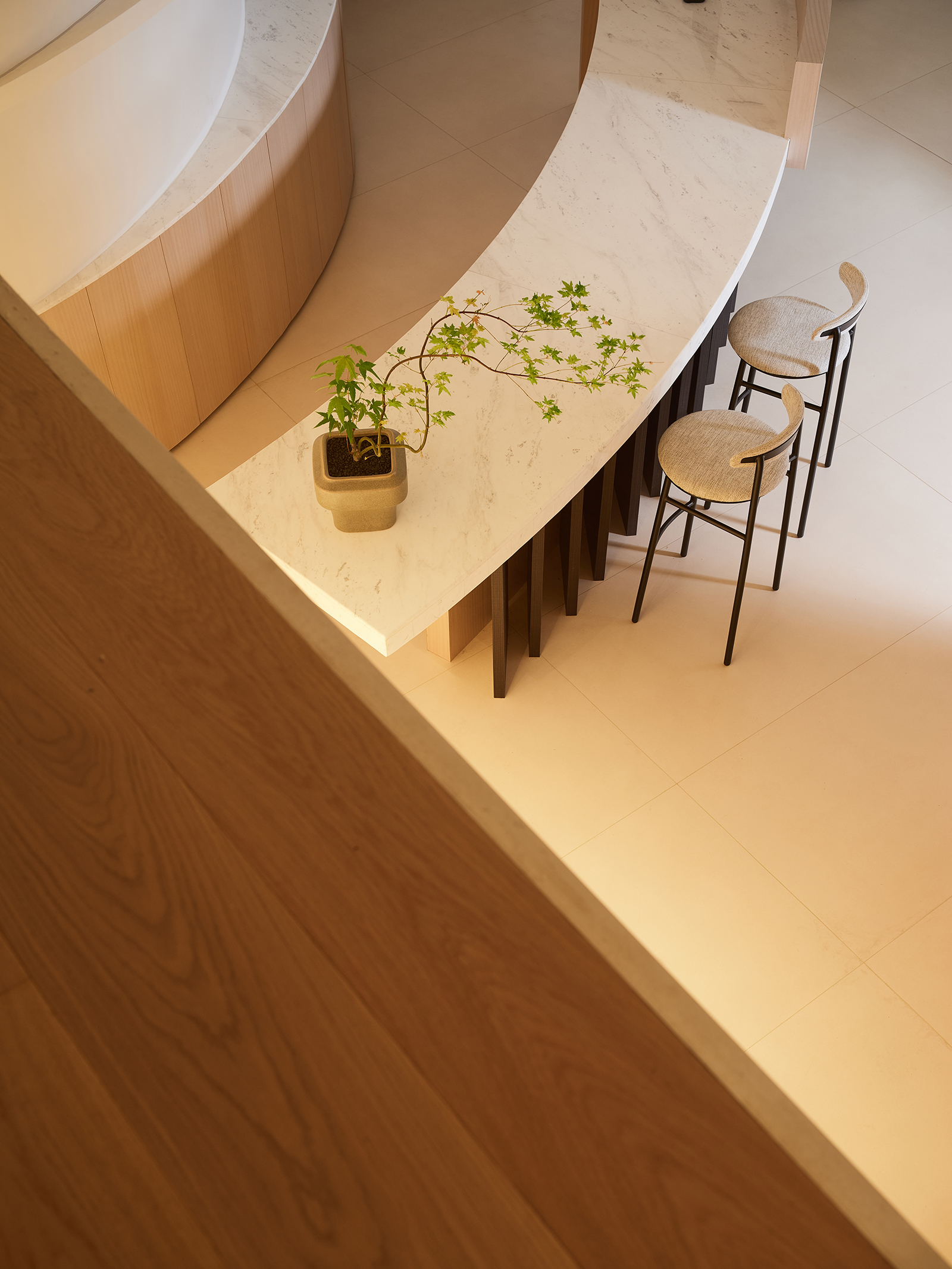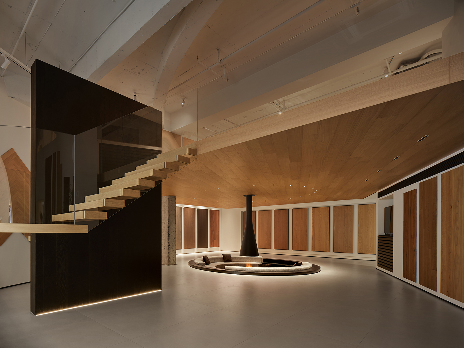 空间的整体色调是黑白与木质调的交融,以错叠穿插的弧线与几何图形,交汇出相互通达的空间。关于这个展厅所有的设计灵感都与地板这个产品的本质息息相关,门口交相呼应的两个大大的弧形,以森林为灵感的旋转展示区,与地板拼接相契合的桌子,从大的结构到小的细节,都是从根源出发诞生的灵感,善用材质与比例创造现代意境,营造出精致而简约的美感。