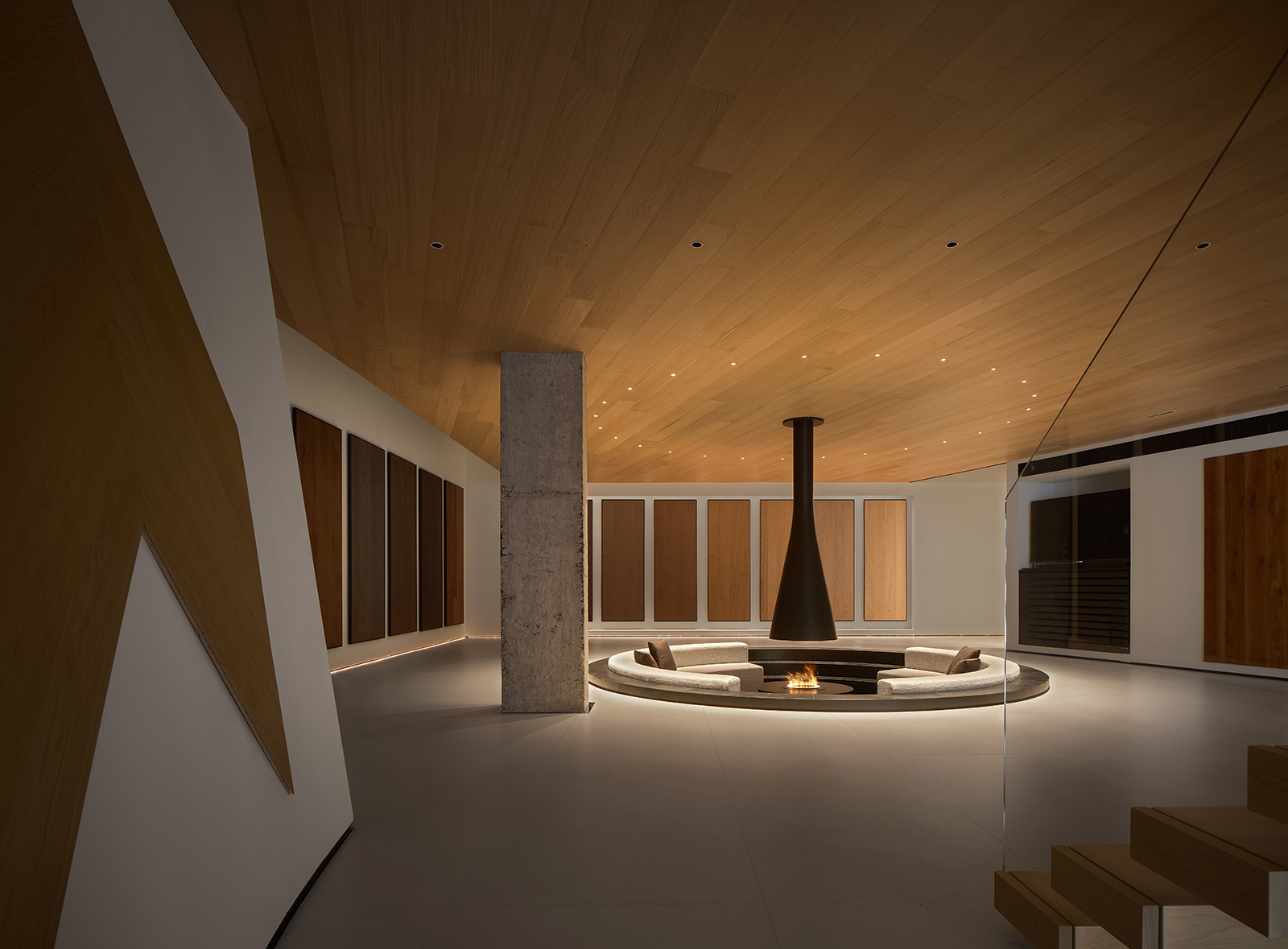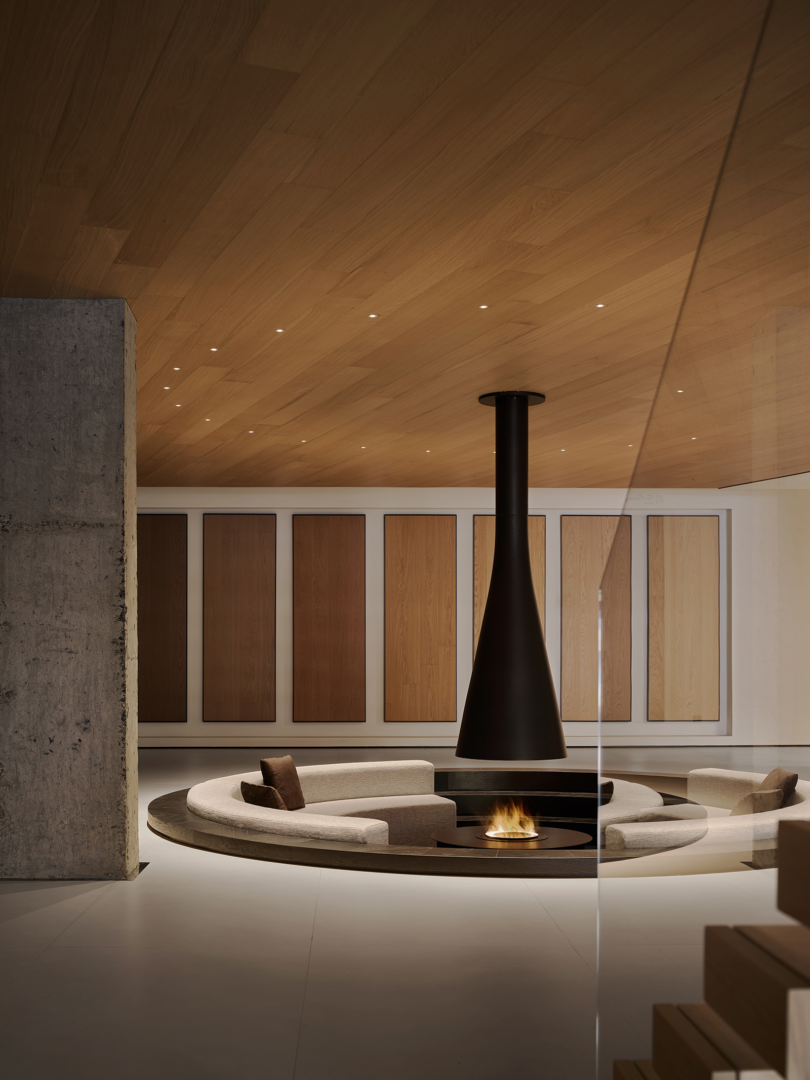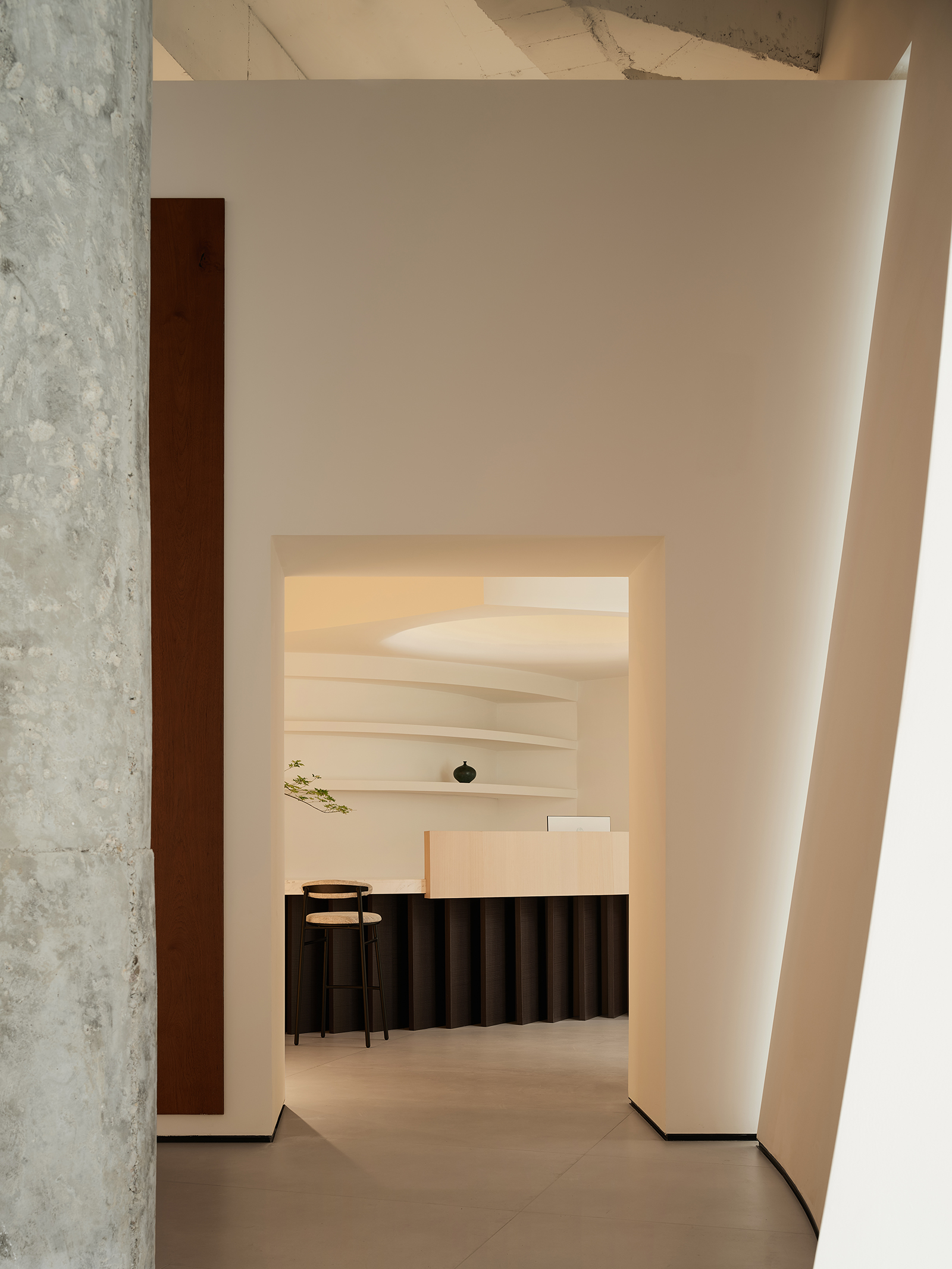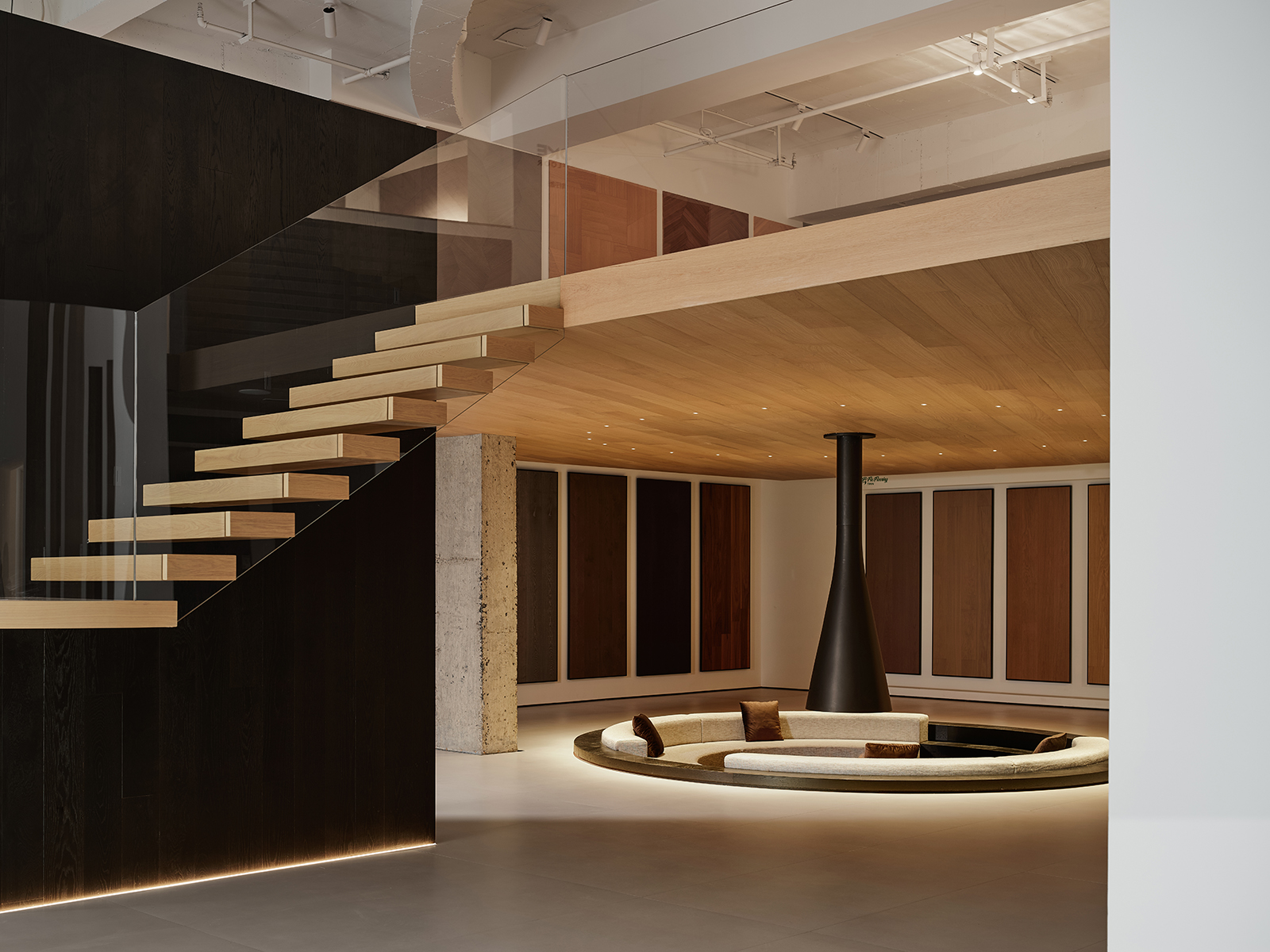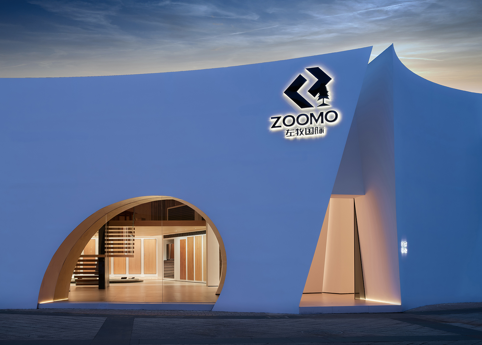 空间的整体色调是黑白与木质调的交融,以错叠穿插的弧线与几何图形,交汇出相互通达的空间。关于这个展厅所有的设计灵感都与地板这个产品的本质息息相关,门口交相呼应的两个大大的弧形,以森林为灵感的旋转展示区,与地板拼接相契合的桌子,从大的结构到小的细节,都是从根源出发诞生的灵感,善用材质与比例创造现代意境,营造出精致而简约的美感。
