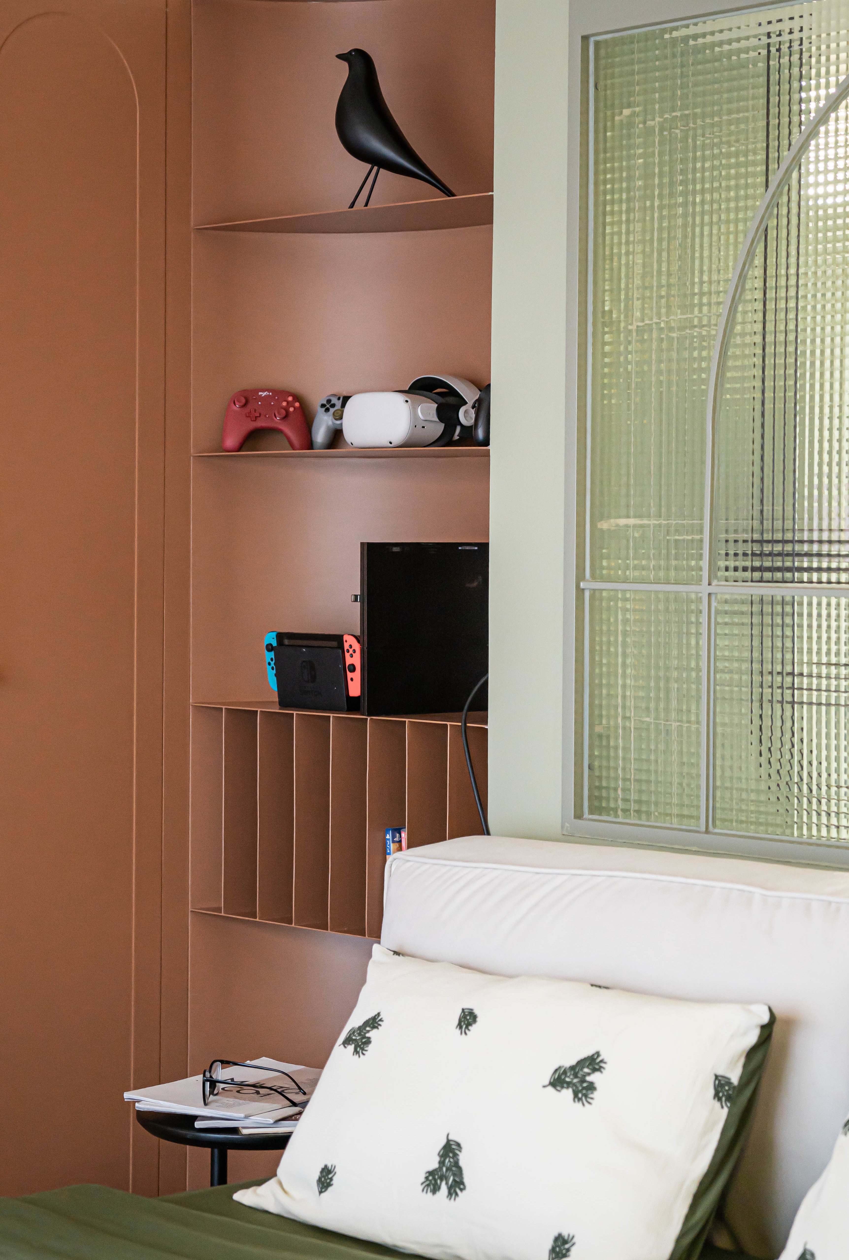 屋主是主机游戏爱好者,床头的开放格量身定制规划,可以满足PS4、PS5、switch、手柄以及游戏光碟的展示收纳,也方便操作使用。