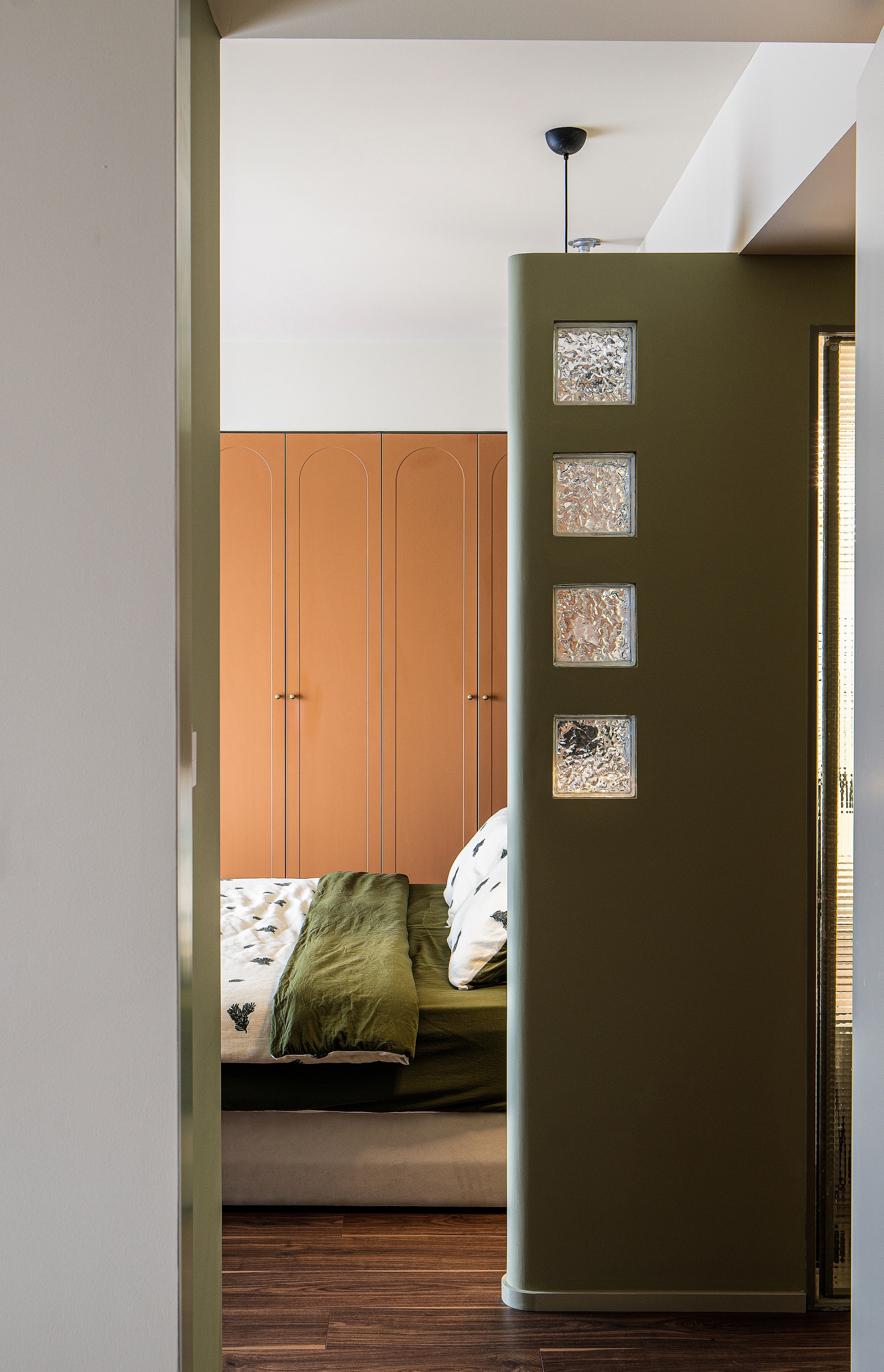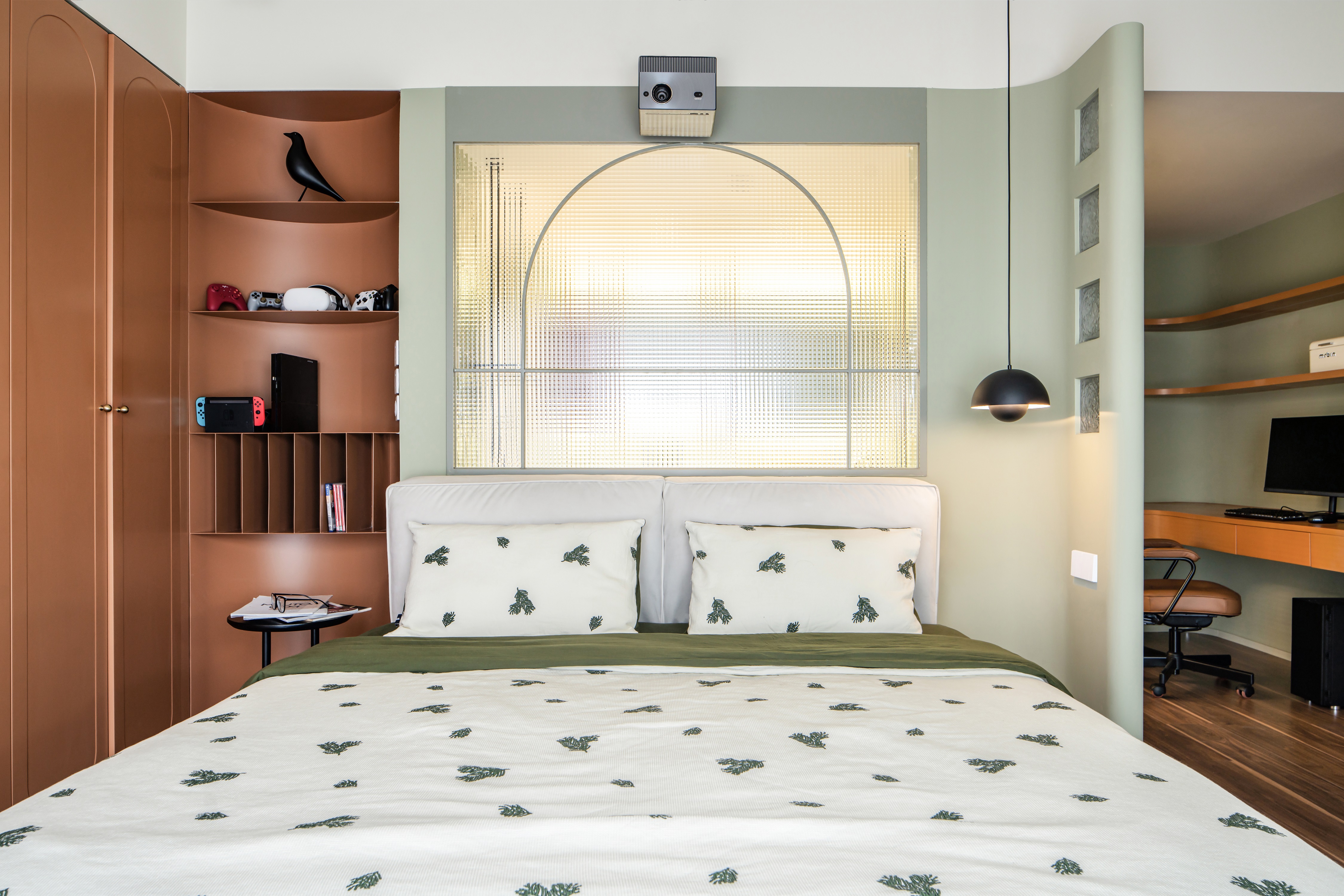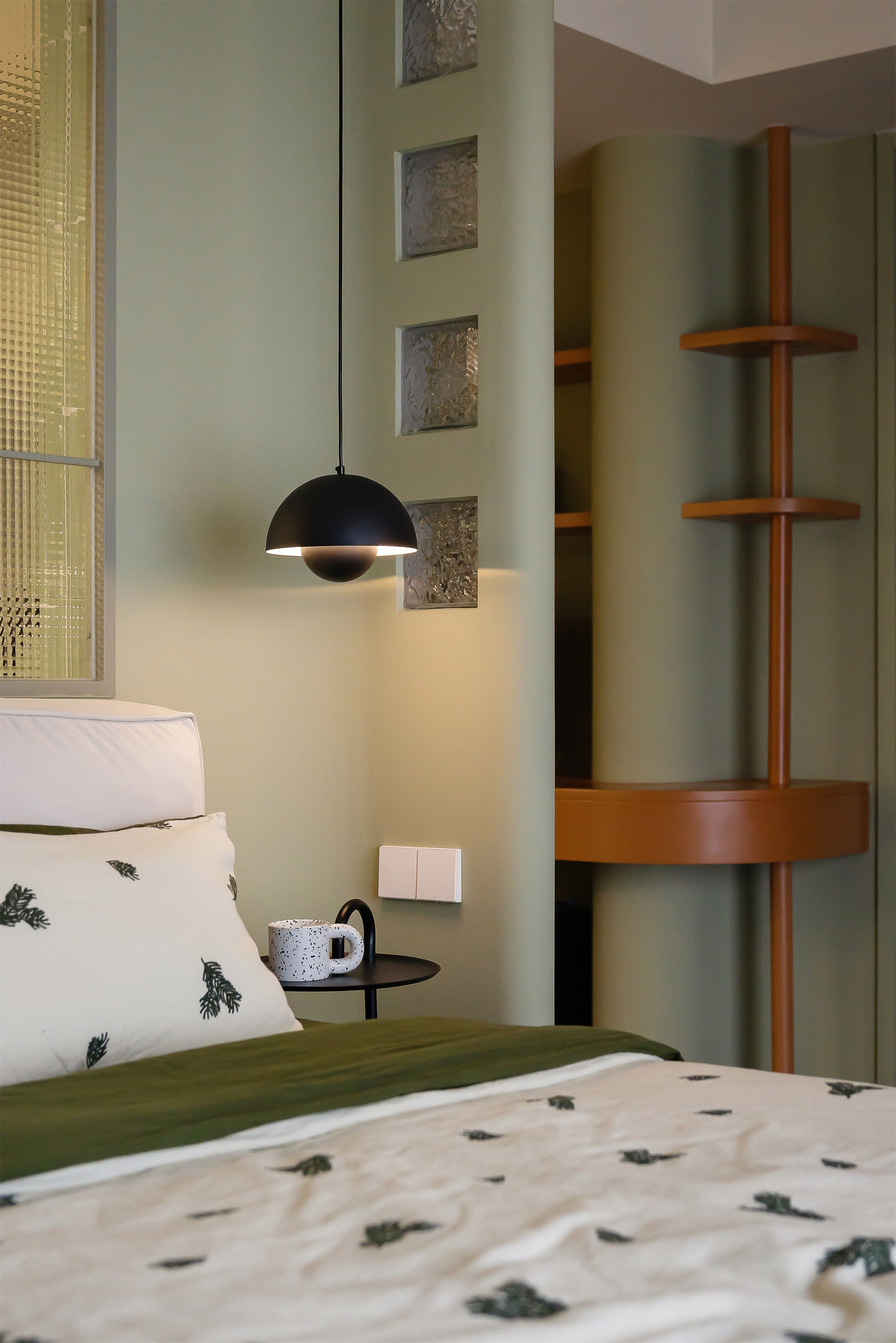 床头隔断将主卧功能划分开来,玻璃砖既能保证隐私性,也能保证进入卧室后的视线延伸,形成一个隔而不断的卧室小玄关增加入室的仪式感。衣柜门型与餐区墙面的装置挂画相互呼应,空间既独立又相互关联。主卧选用了屋主喜爱的陶红+豆绿,与胡桃木地板搭配,营造出馥郁的复古氛围。