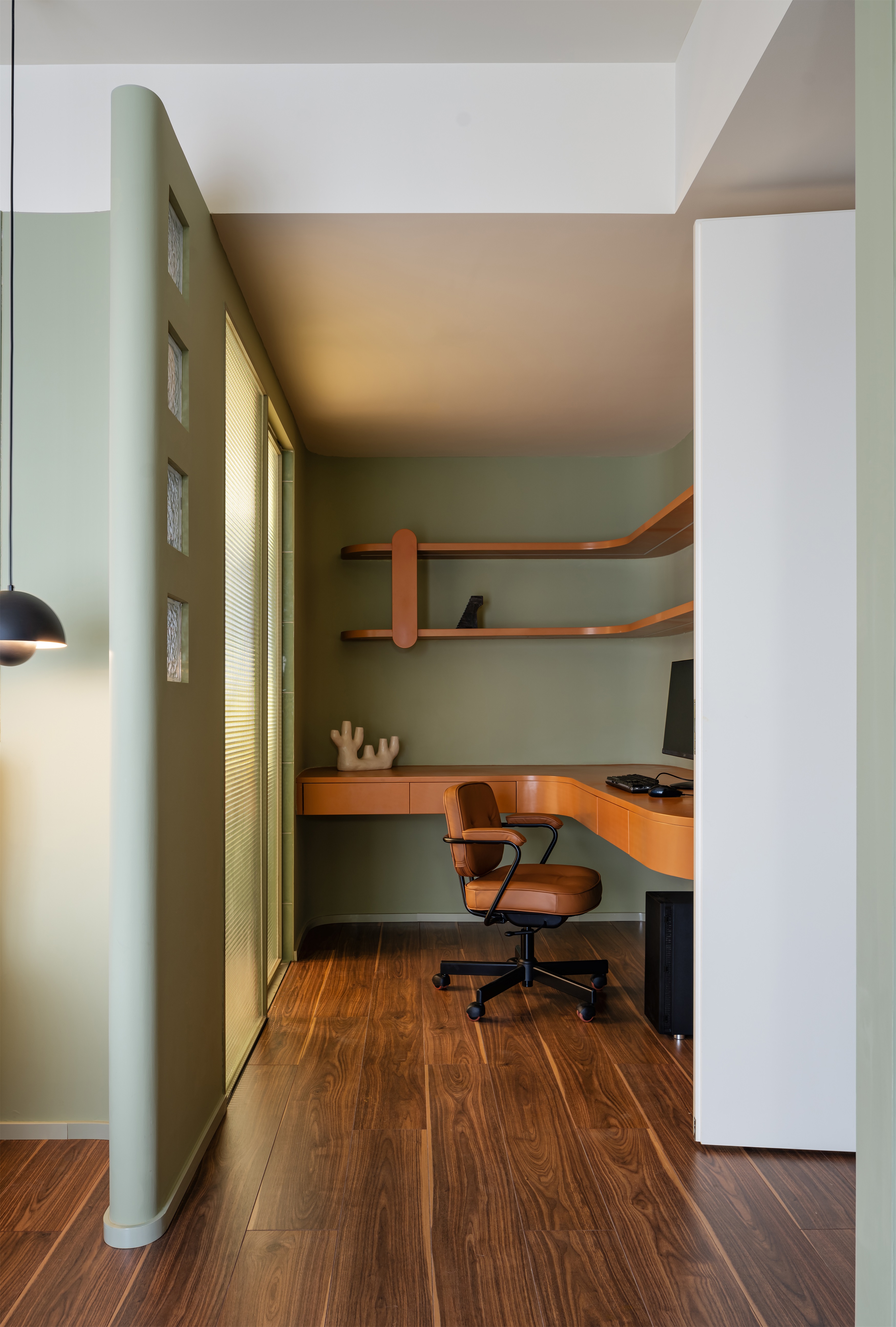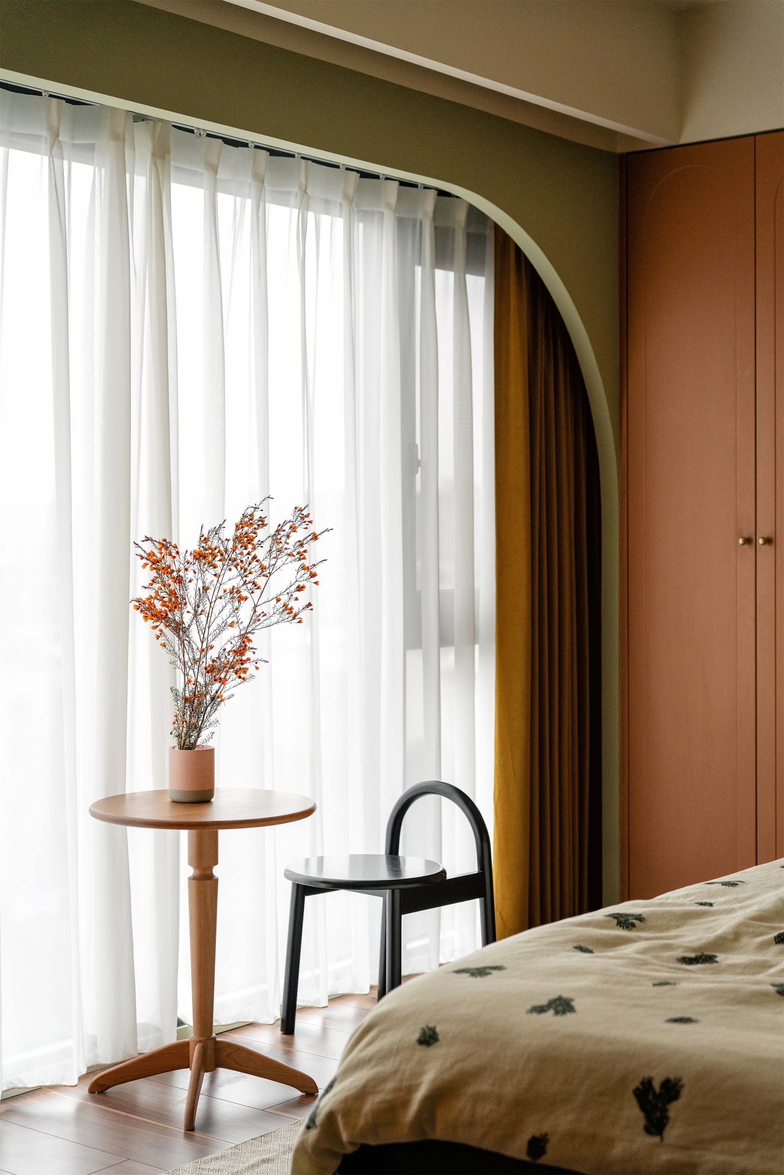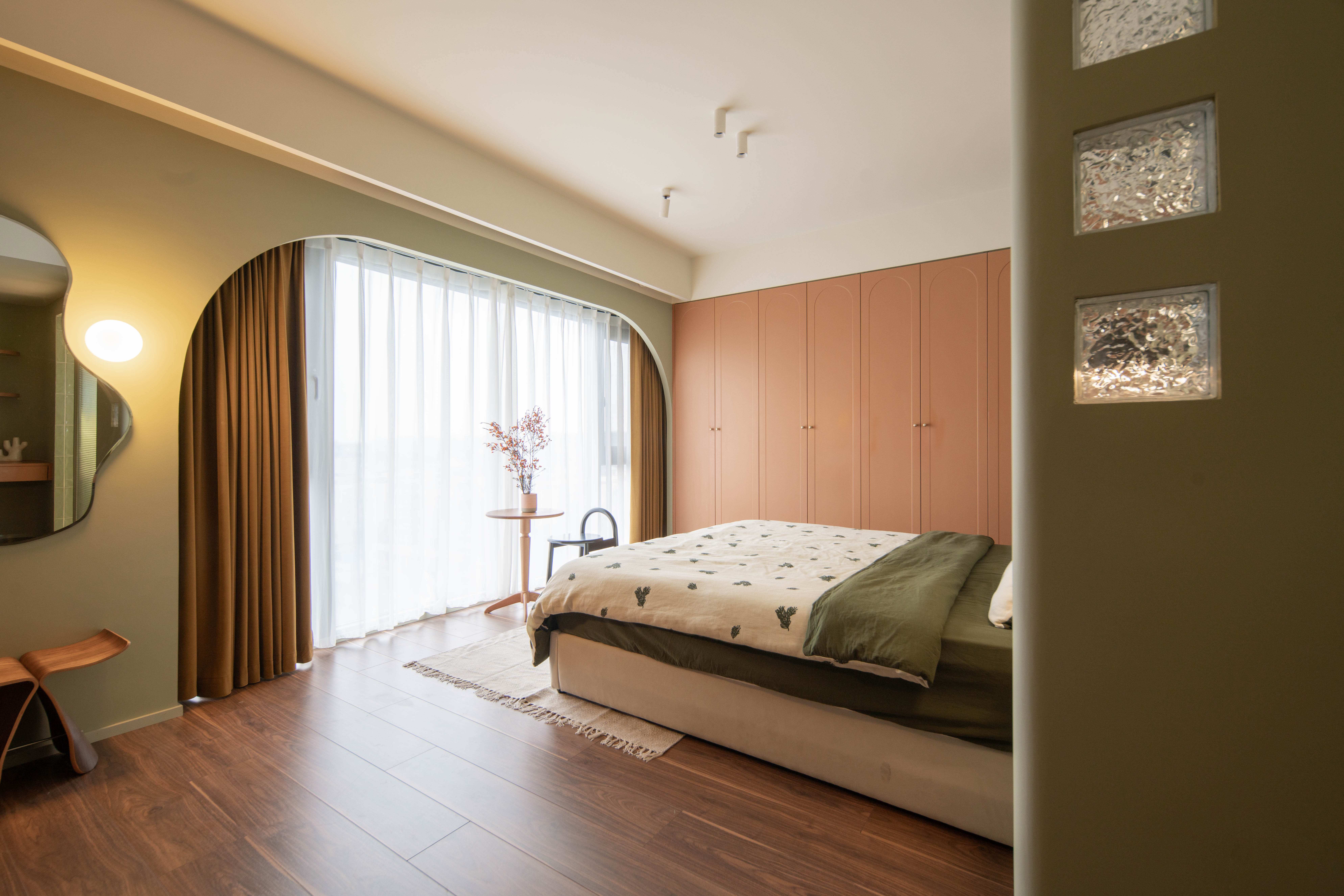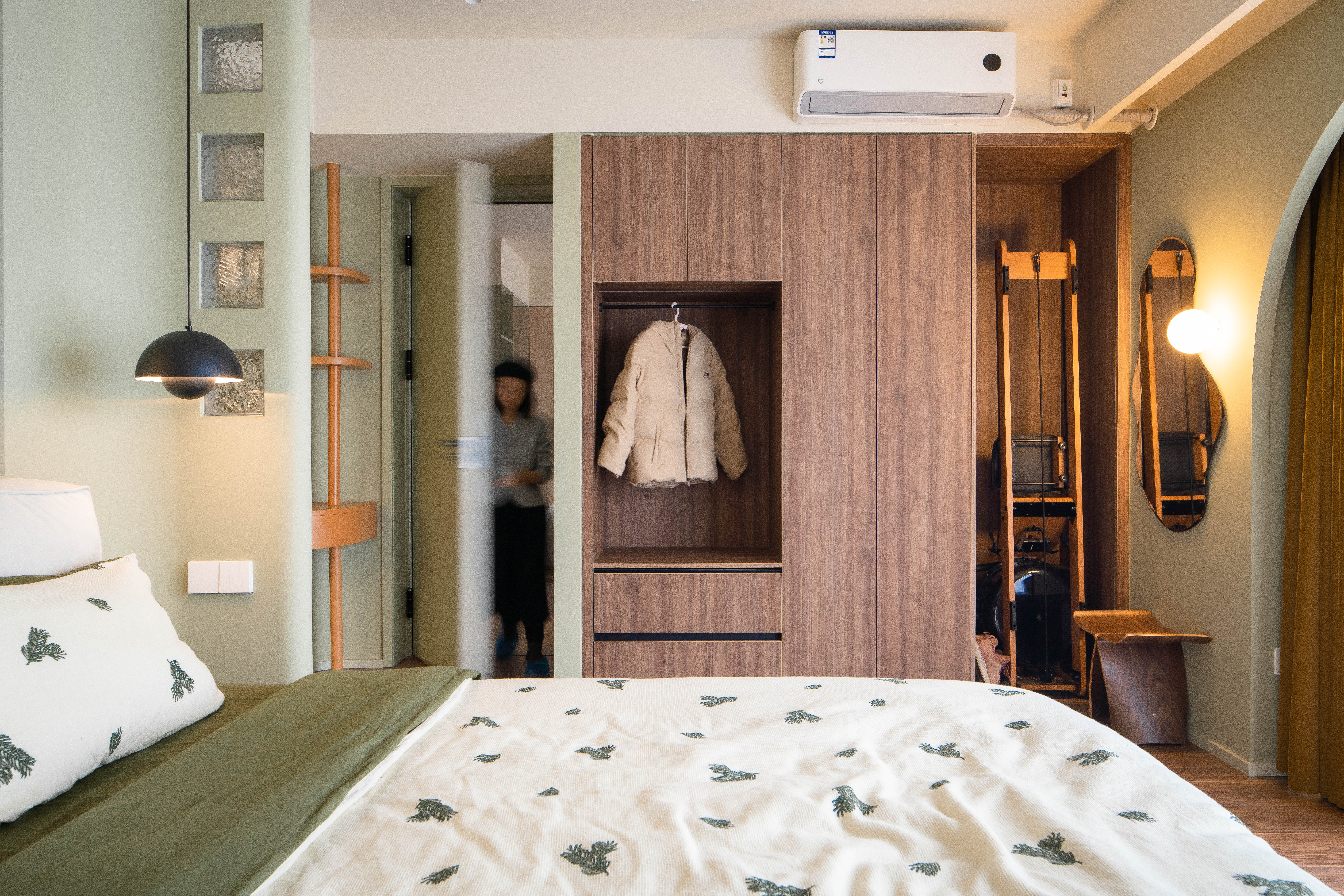 床头隔断将主卧功能划分开来,玻璃砖既能保证隐私性,也能保证进入卧室后的视线延伸,形成一个隔而不断的卧室小玄关增加入室的仪式感。衣柜门型与餐区墙面的装置挂画相互呼应,空间既独立又相互关联。主卧选用了屋主喜爱的陶红+豆绿,与胡桃木地板搭配,营造出馥郁的复古氛围。