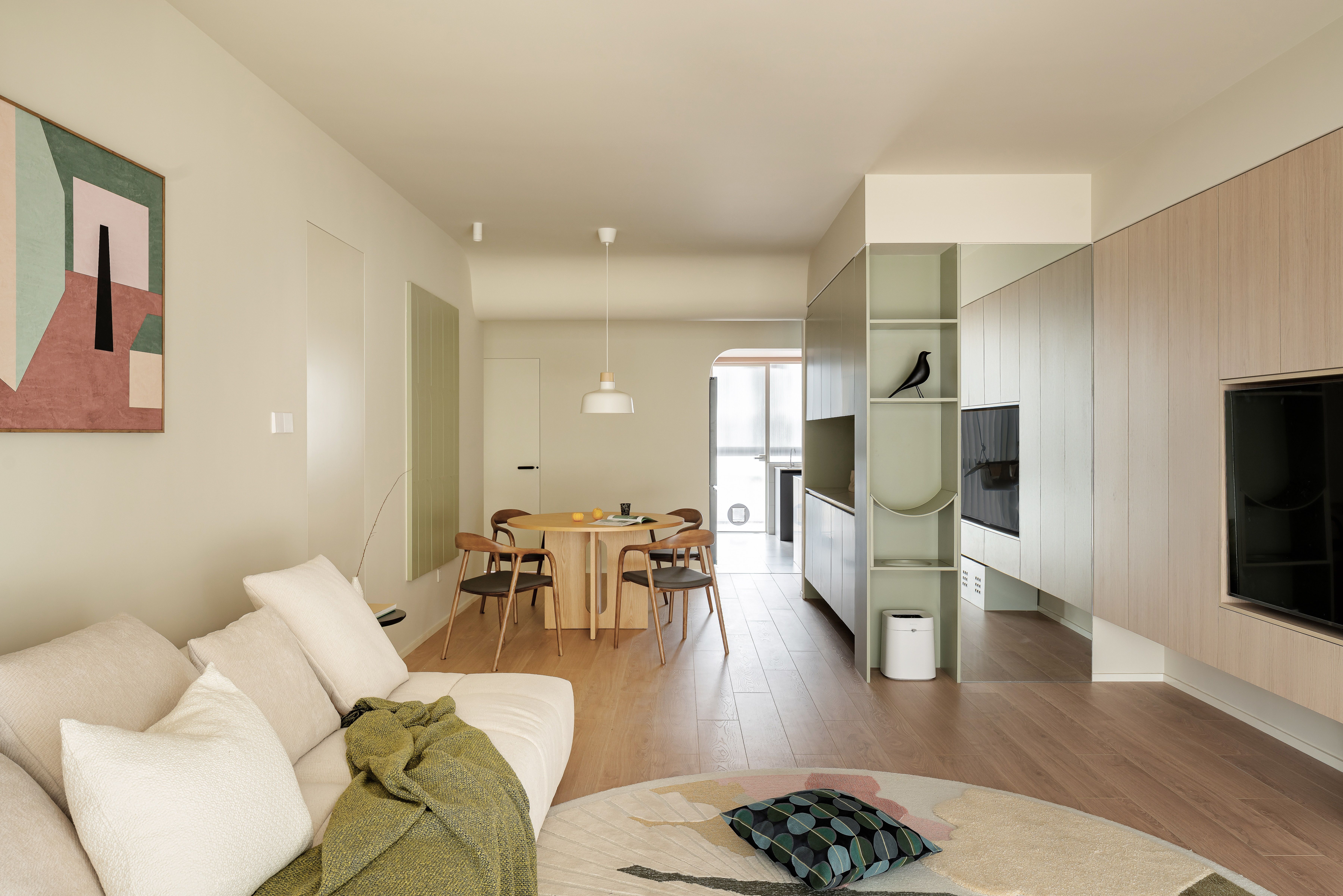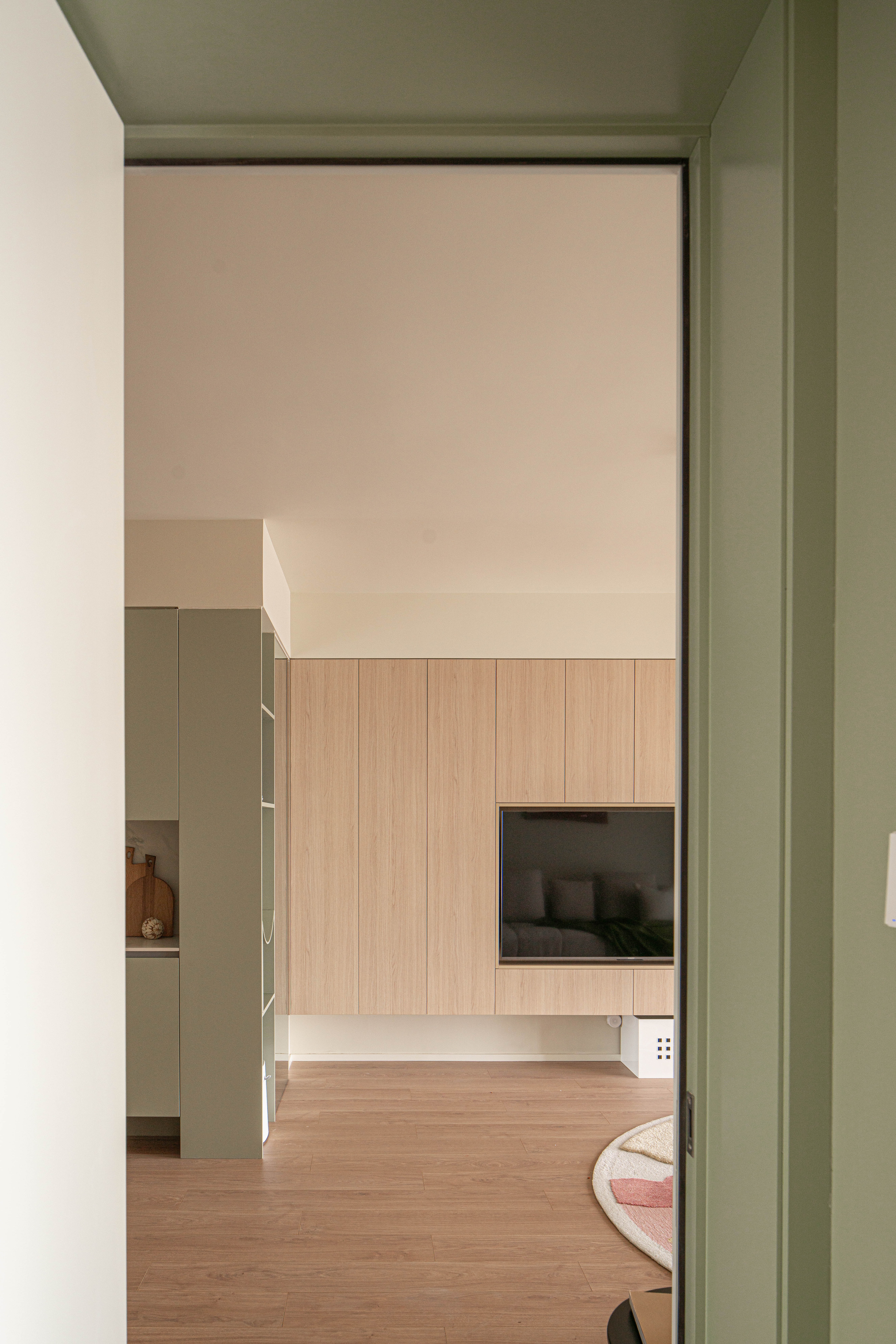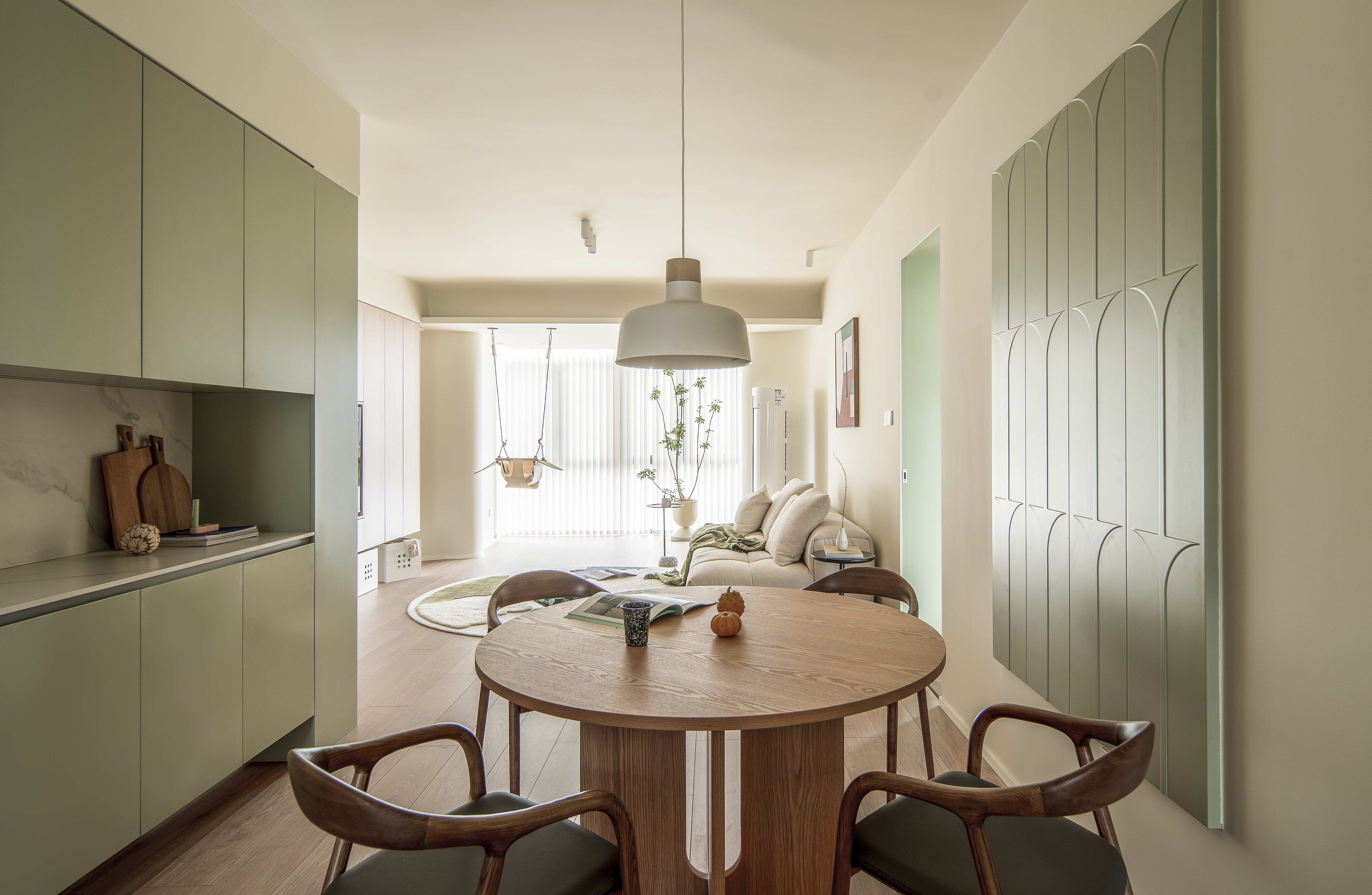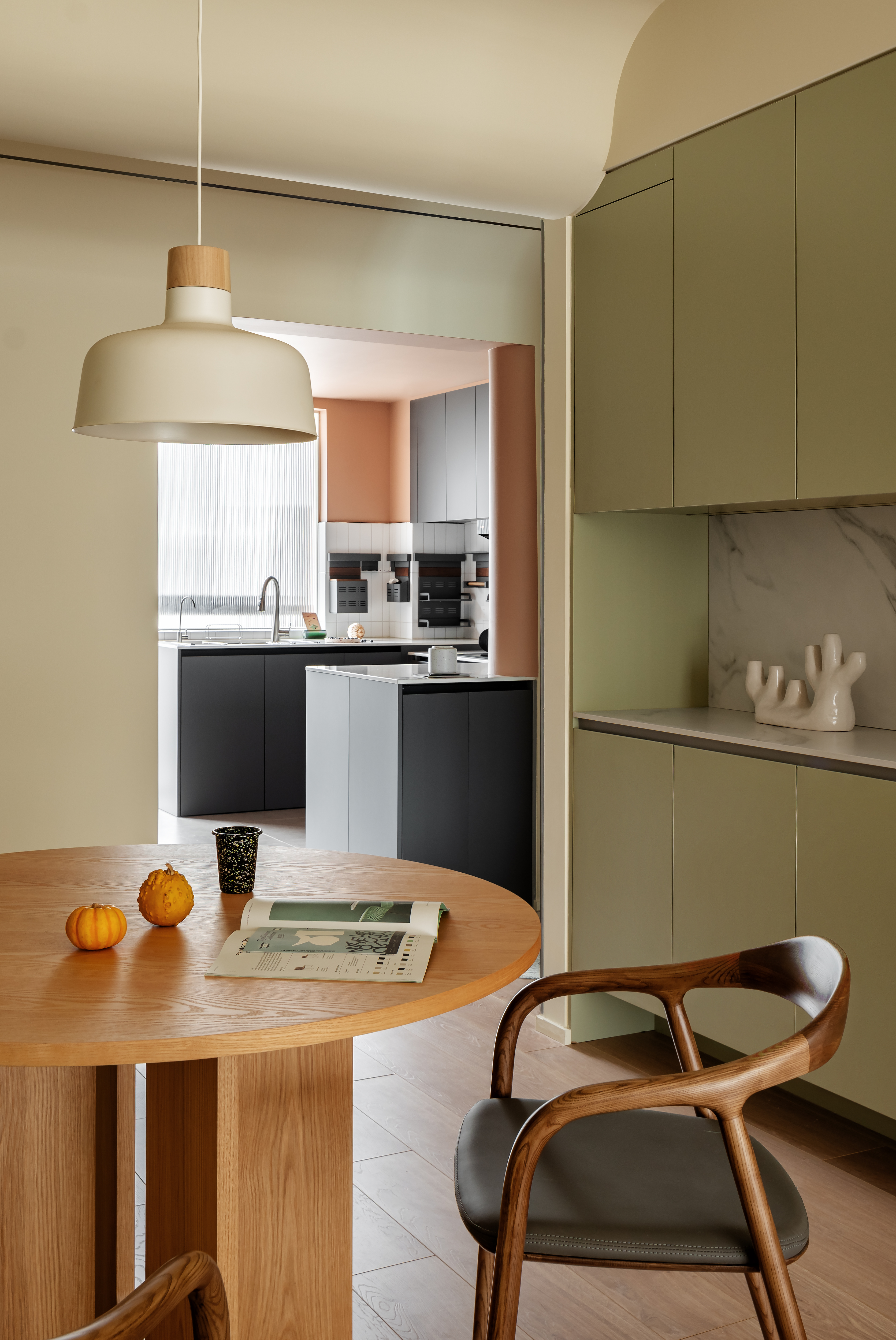 餐桌旁是在行走的动线上,餐边柜采用了暗拉手的形式,避免磕碰。在这里可以放置屋主与家人常用的茶杯、水壶、咖啡机等,内嵌灯带补充台面照明,柜体上区可以收纳囤积的生活用品,下区是鞋柜区。木质的纹理,浅杏色与豆绿色的搭配,赋予空间自然清新感。