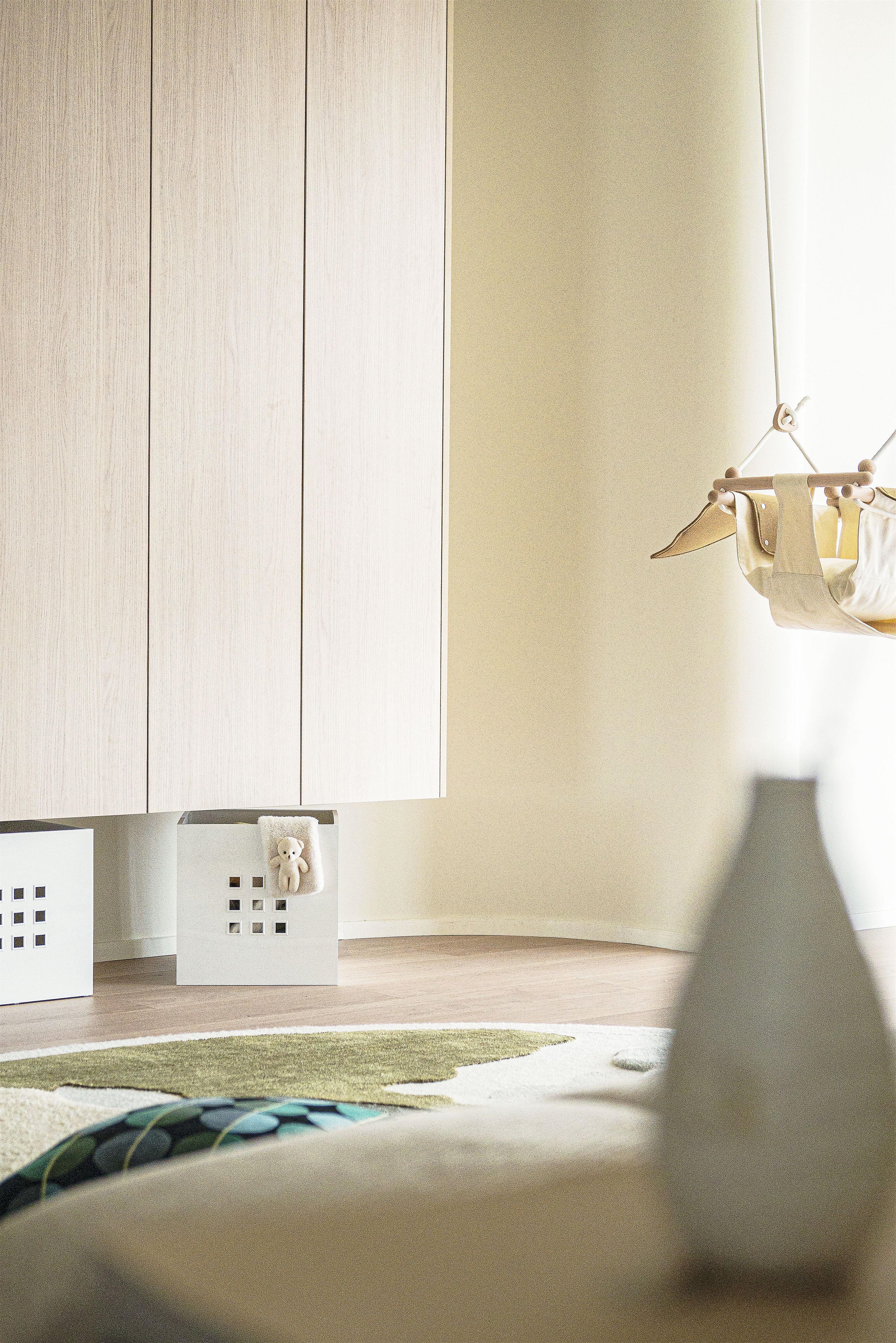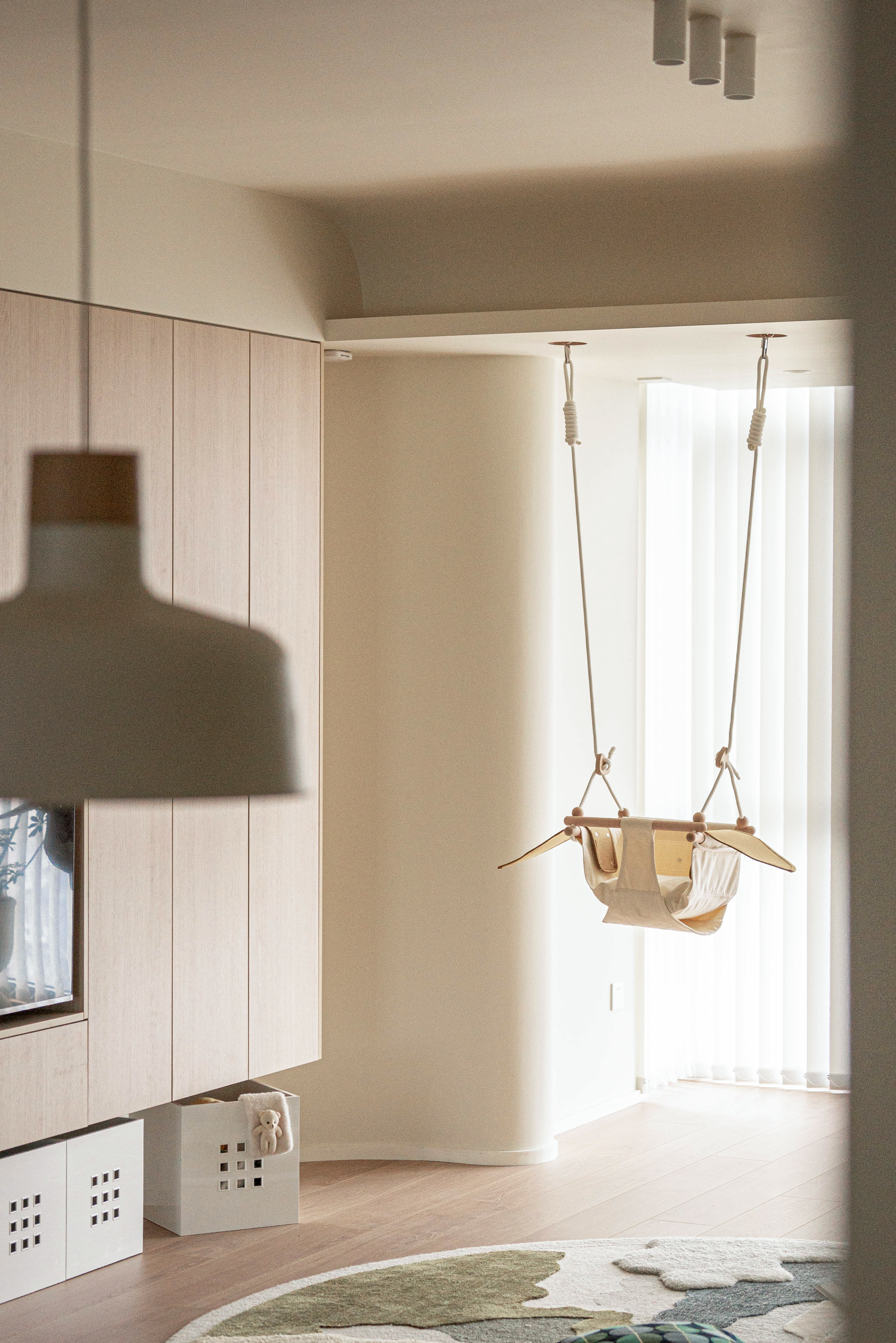 空间意境:这次我们的设计重点集中在如何融合实用和趣味性,创造一个相互陪伴成长的家,带娃时其乐融融,独处时放松自由。厨房墙顶采用不同颜色的涂料,通过色彩来界定空间的功能关系,增加玄关区域的视觉层次。我们将客厅与阳台连接的转角,考虑了弧形墙面柔和过渡,运动玩耍更加安全。阳台顶部的挂钩不仅可以用于安装秋千,还可以在小朋友长大后作为健身器材的固定点,不用时也可以轻松取下,发挥多重功能。