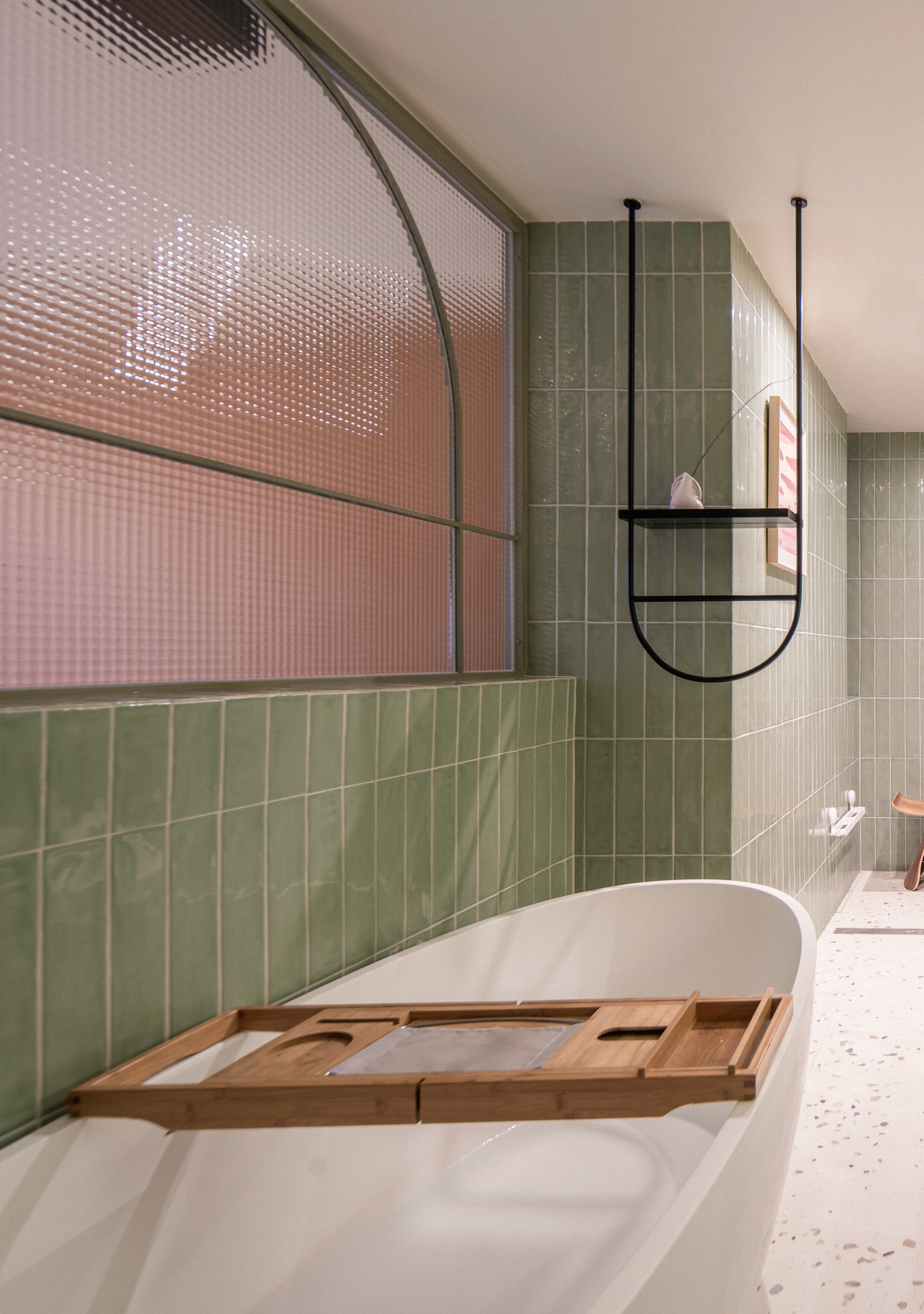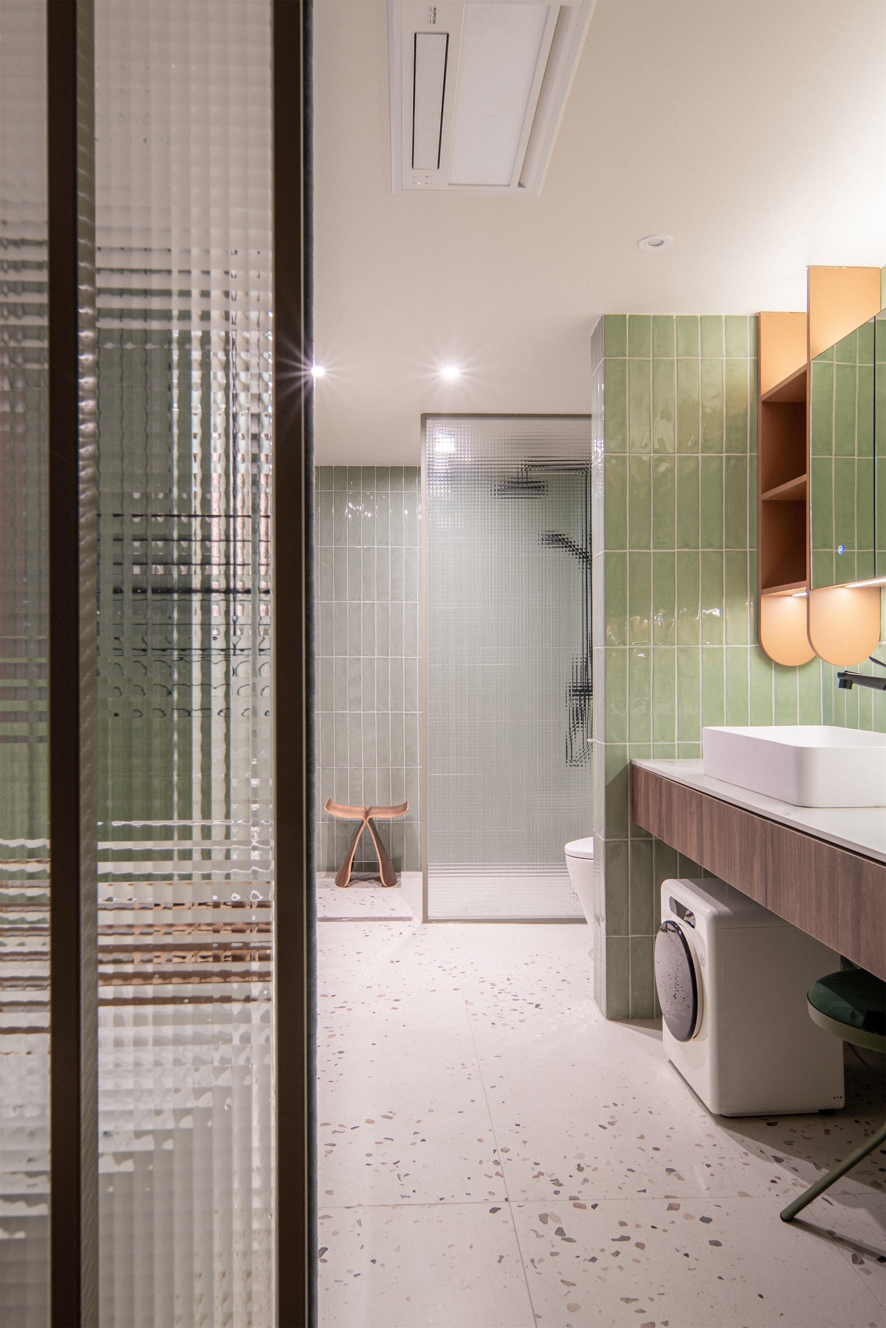 卫生间选用了和墙面同色的绿色波浪纹釉面砖,仿佛水波般起伏流动,走进浴室的一瞬间身心都放松下来。