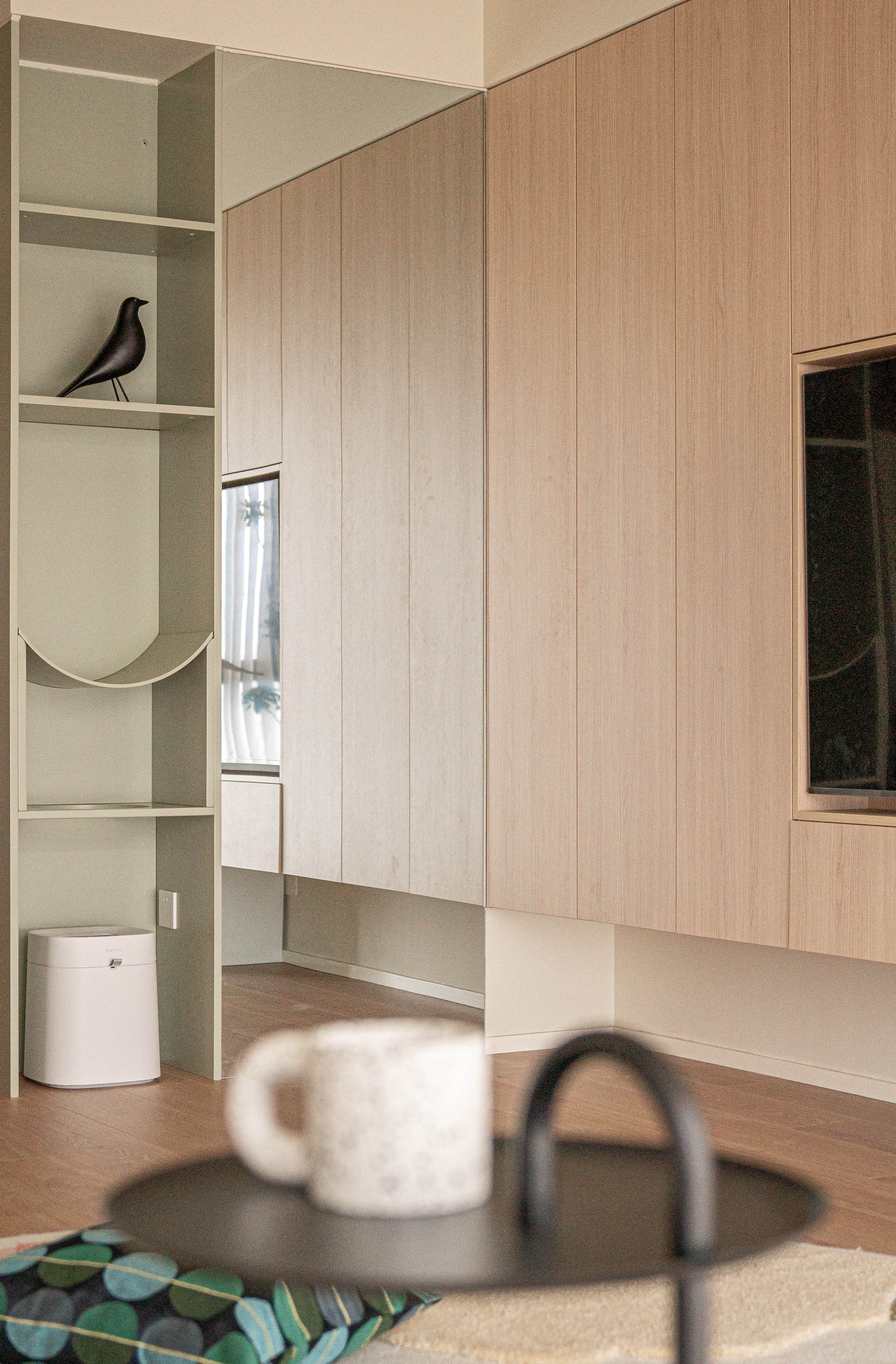 利用墙角与电视柜的垂直关系设置了一面银镜,能反射照进客厅阳台的光线,增加采光的同时延伸空间的视觉感受。镜子旁的开架区域,最上方的两层可以根据屋主的喜好摆放装饰品或绿植,下方的弧形隔板则是给猫猫提供了一个休息的平台,最下方预留给了垃圾桶,我们把垃圾桶上方的隔板开了一个圆洞,小朋友丢垃圾时可以模仿投篮动作,培养垃圾入桶的好习惯,增添生活中的小趣味。