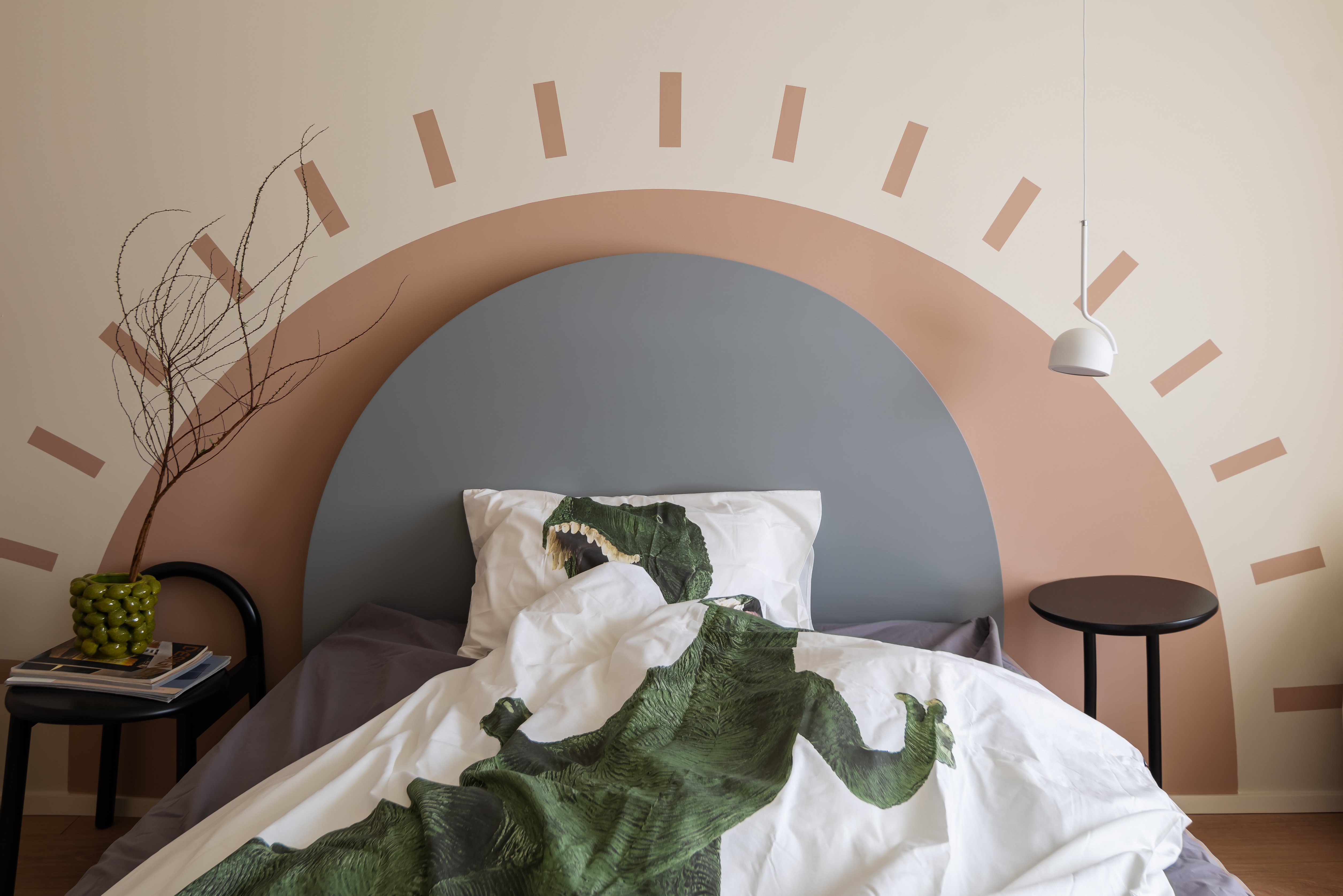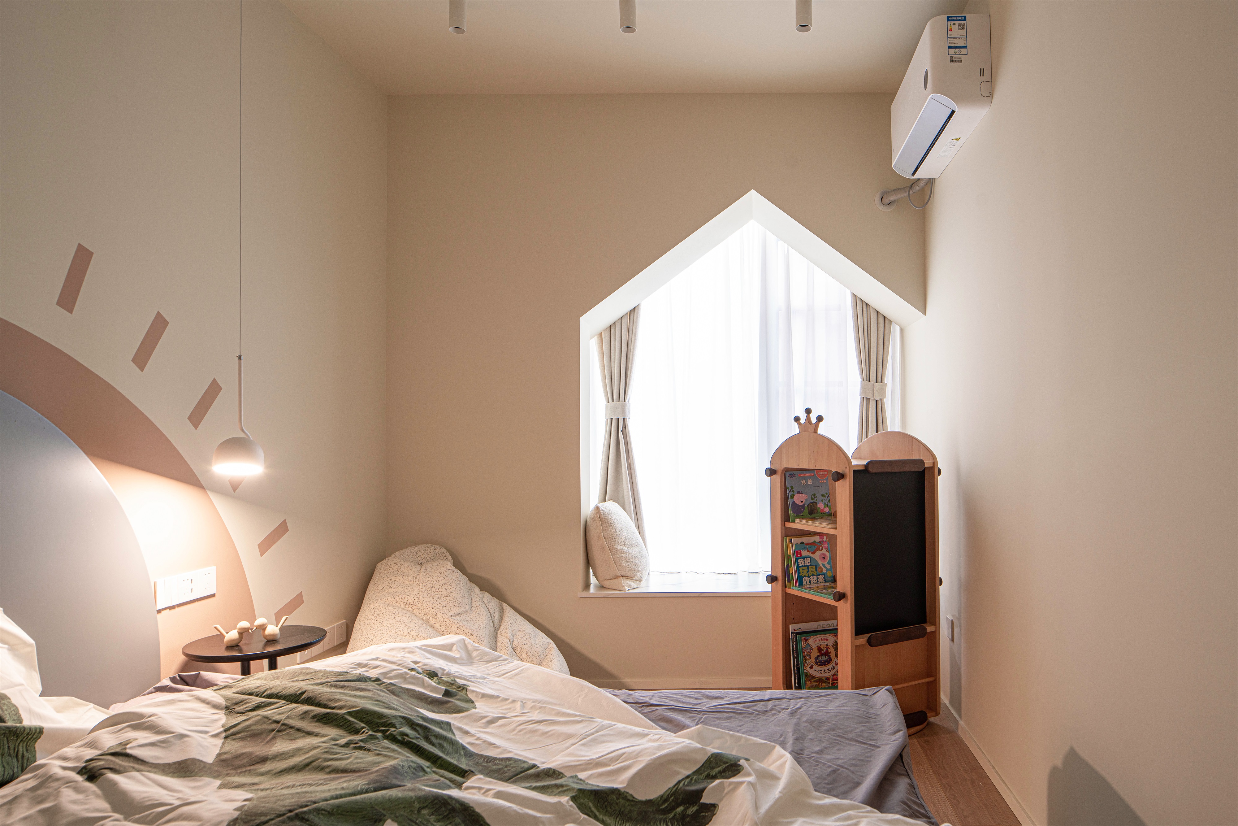 床头背景使用孩子喜好的图形和色彩用乳胶漆做了一面简单墙画,与飘窗的小房子造型搭配,空间充满了童真趣味。