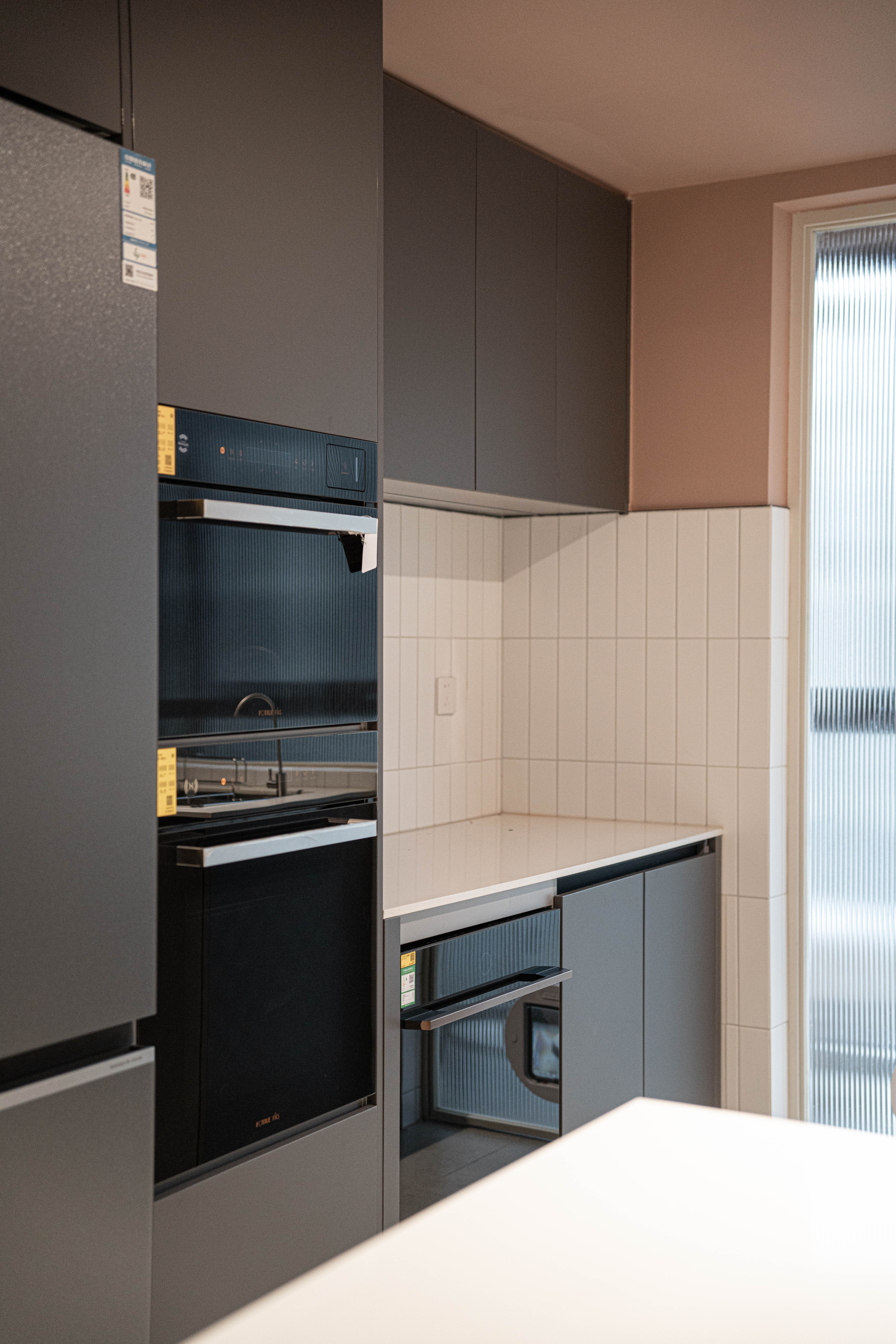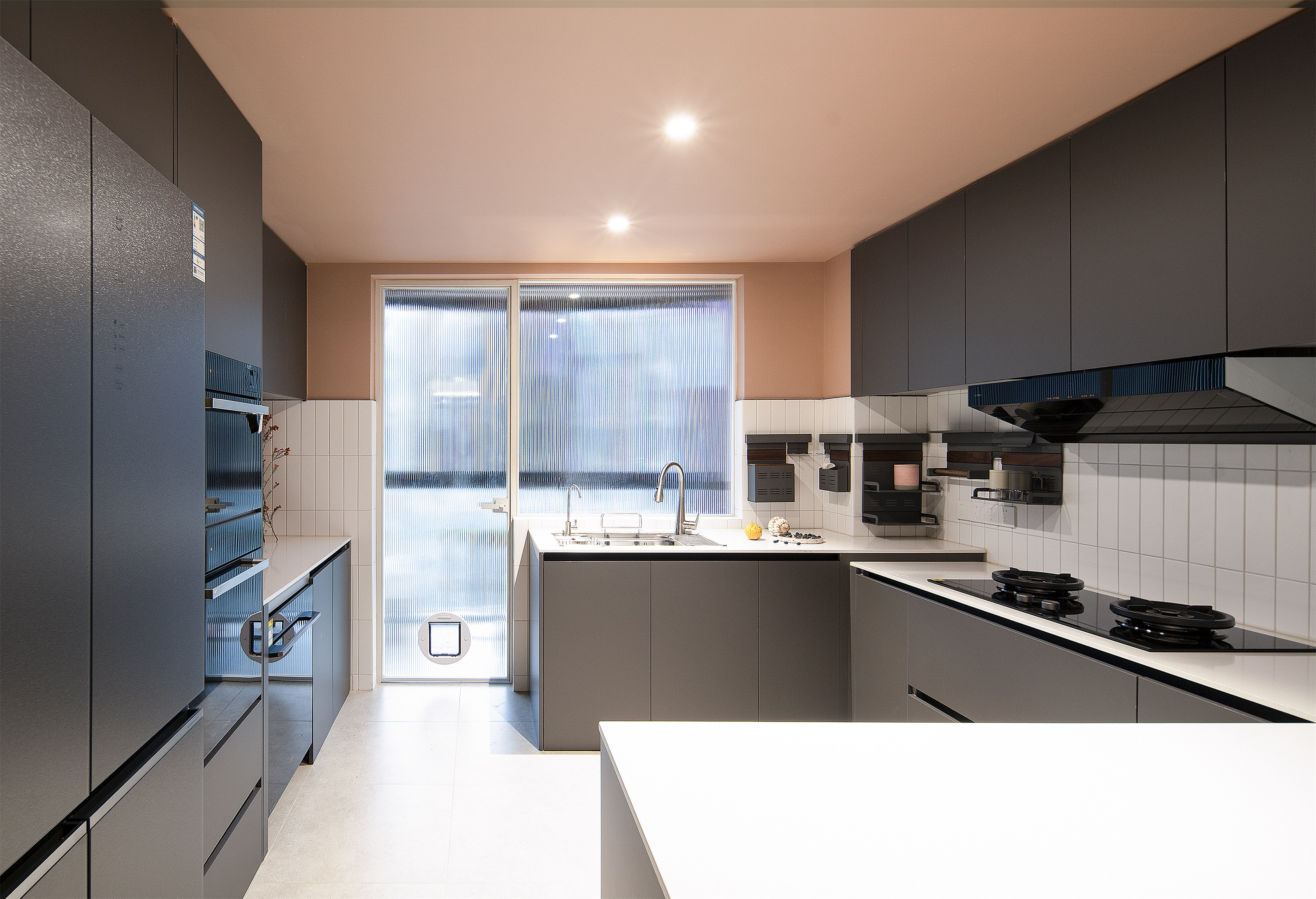 新梳理后的厨房布局为“U”字型和“一”字型相结合的形式:放菜台-冰箱-蒸烤箱-洗碗机-水槽-备菜台-烹饪-传菜台,无论是切配还是烹饪,都可以和家人从容应对,宽敞明亮、动线流畅的厨房满足屋主对各式烹饪料理的需求。利用透光不透明的长虹玻璃隔断+门的组合增加厨房的采光,玻璃门上的猫洞连接厨房与生活阳台,方便猫咪自由出入,有效隔绝异味的传播,同时也保证美观性。