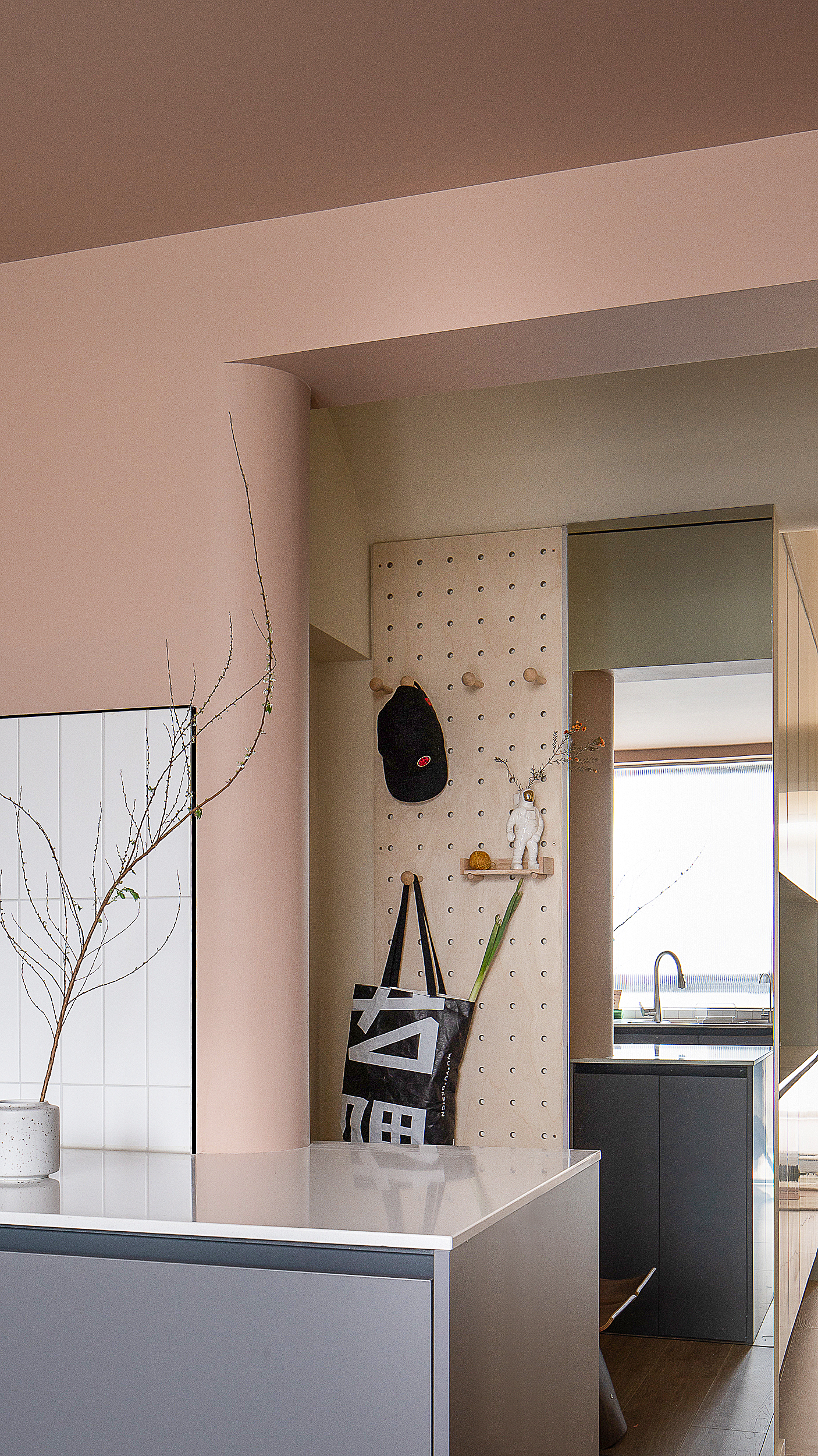 厨房门洞扩大后增加了玄关的采光,墙面安装洞洞板搭配隔板与圆球挂钩,组合成多样的收纳场景,使玄关收纳更加有条不紊。定制的到顶衣帽镜安装在洞洞板旁边,可以将厨房和生活阳台的光线反射到玄关区域,两者之间有一个1cm宽的线灯,可以补充正面照明,方便屋主在出门前进行妆容整理。