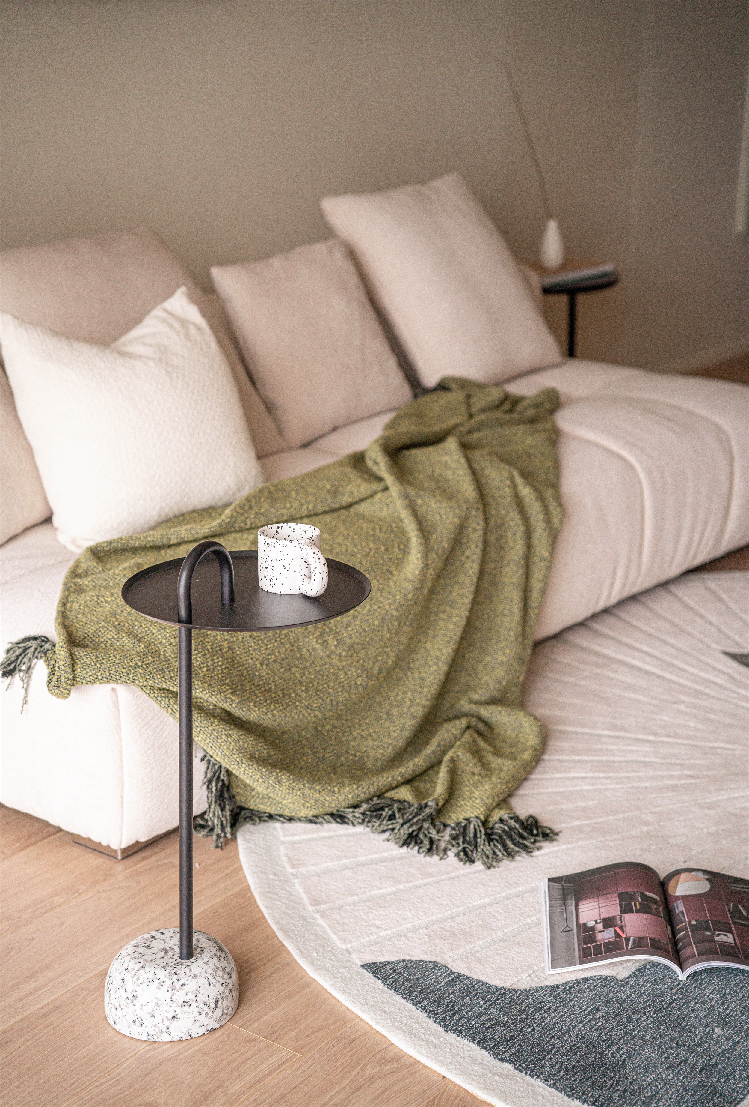 用方便移动的小边几来替代客厅中心的茶几,圆形羊毛地毯亲肤柔软,小朋友最爱在上面玩耍