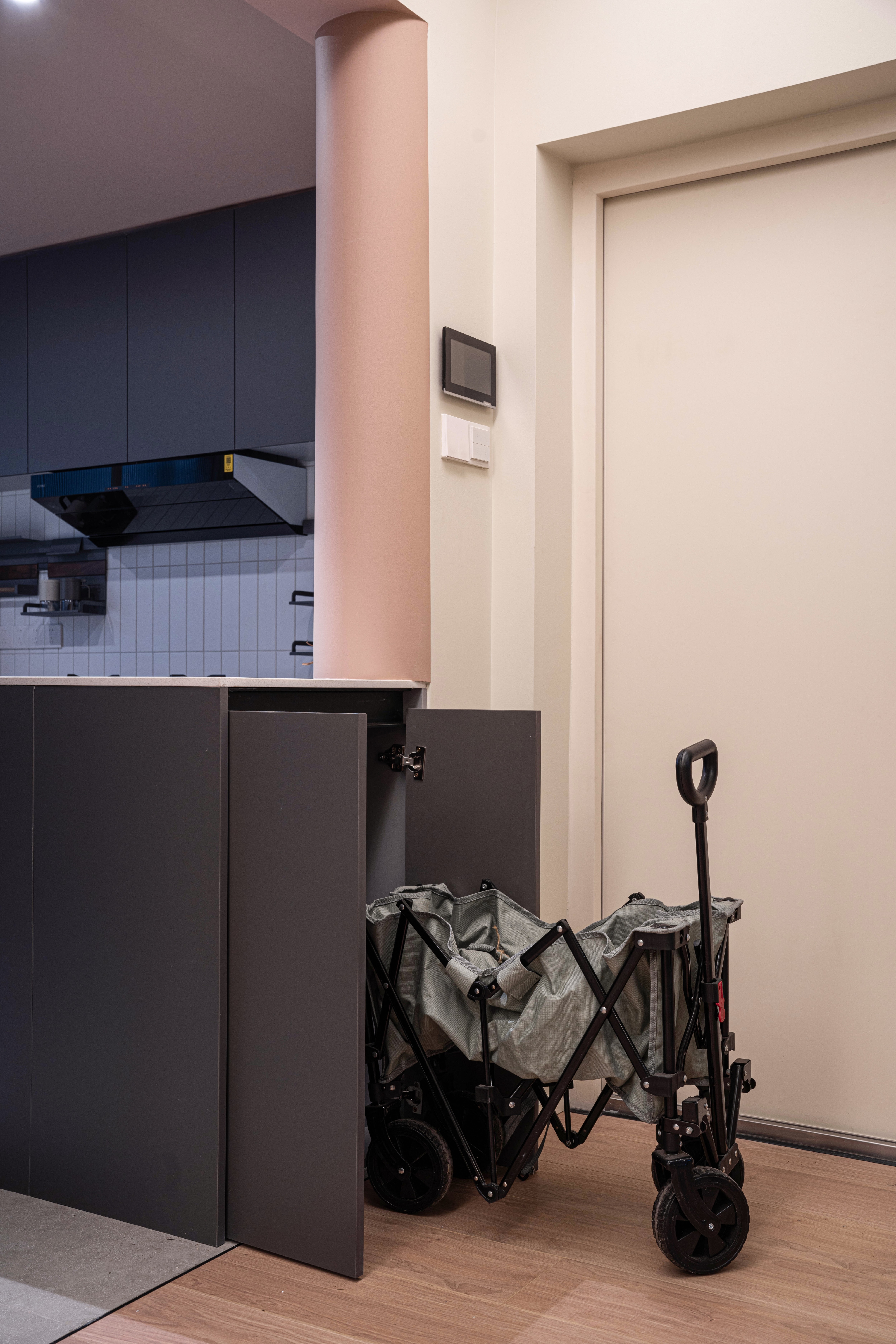 靠近厨房一侧的玄关矮柜,预留给露营车/婴儿车,方便进出门随时收纳。