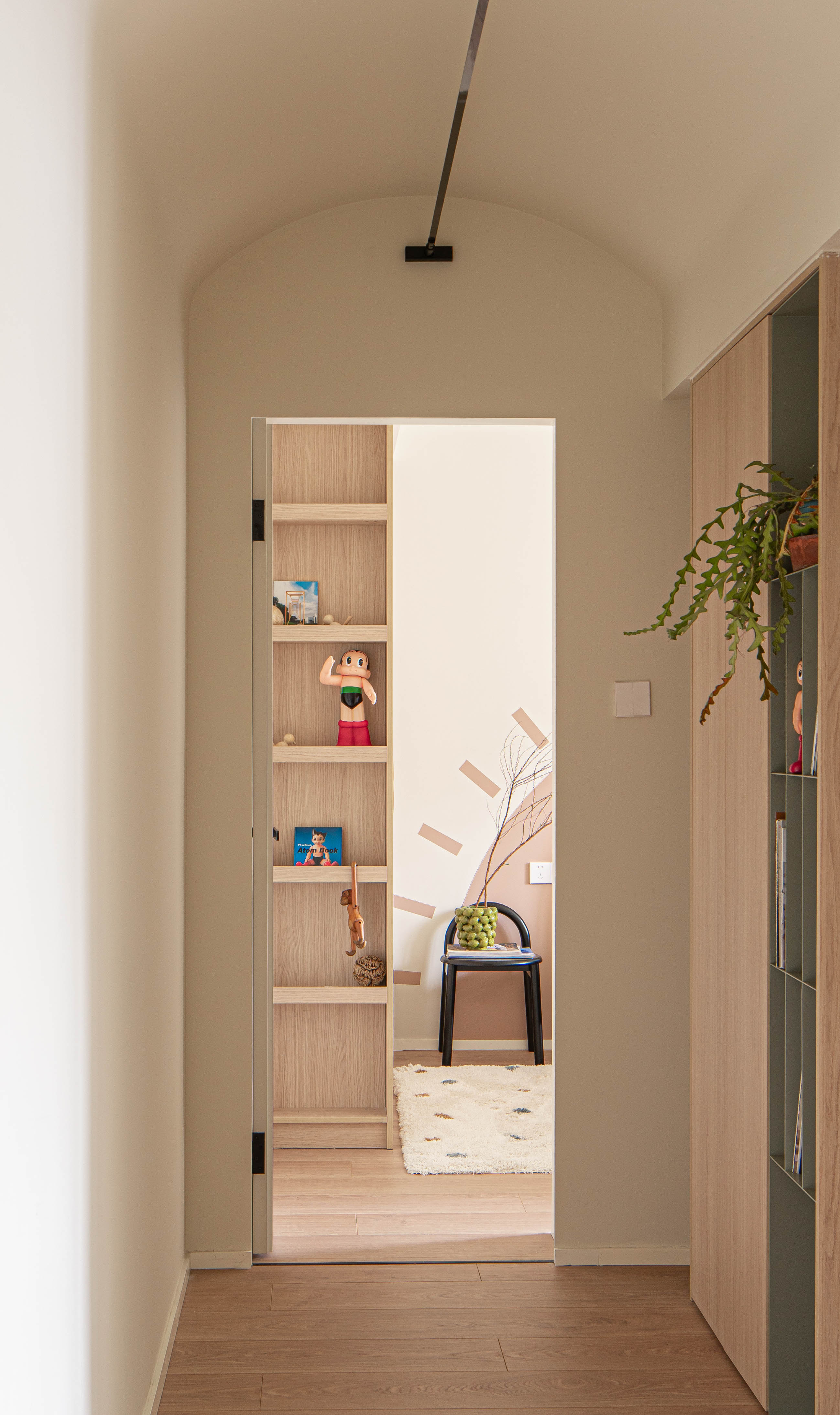 走廊靠近儿童房的墙壁做了内退的书柜+储物空间,弱化了过廊的夯长感同时也为我们进入儿童房的动线增加了实用性。