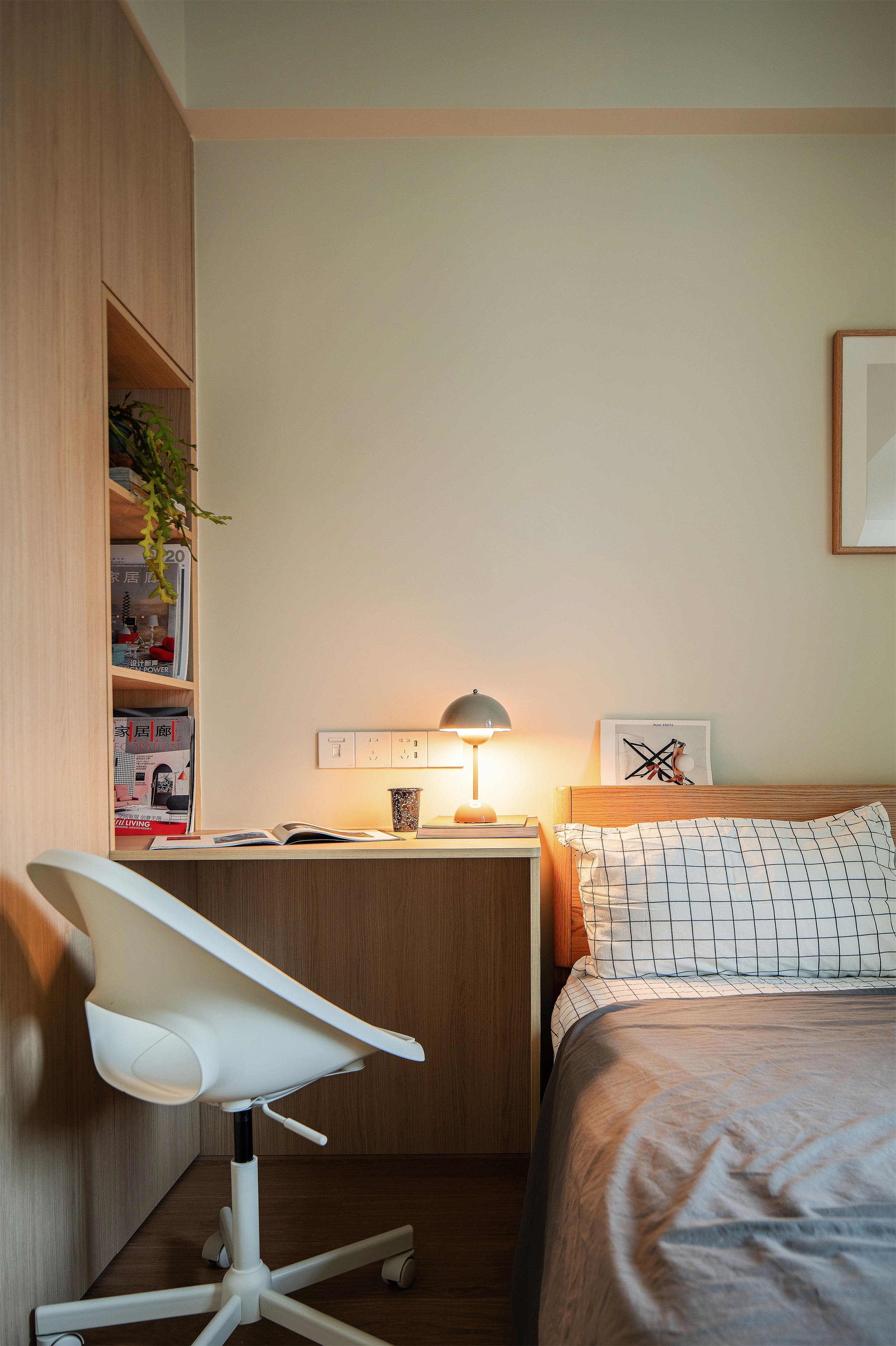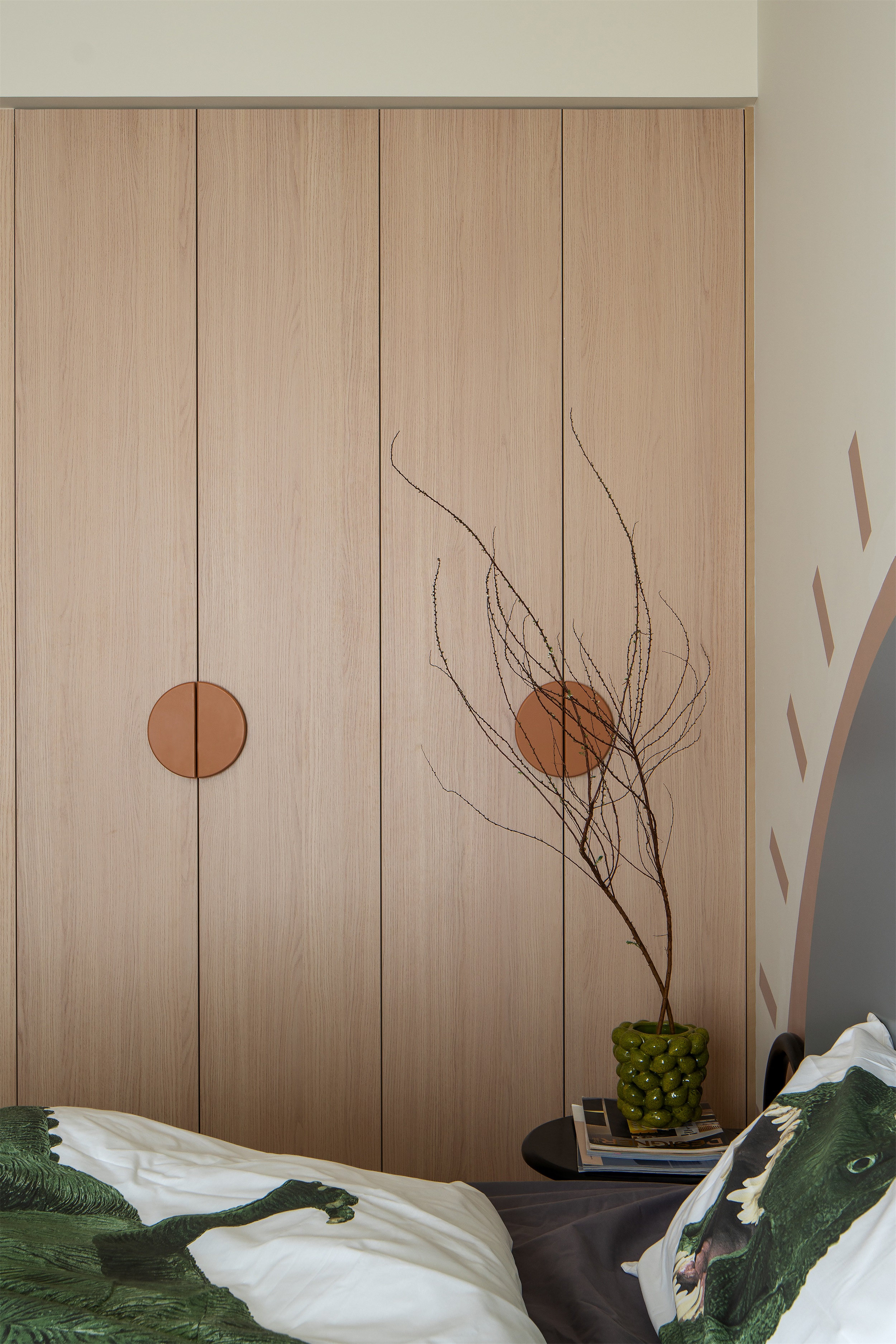 没有繁复的装饰,更多考虑到他们生活习惯的实用性,梳妆台和衣柜采用了一体设计,整洁美观