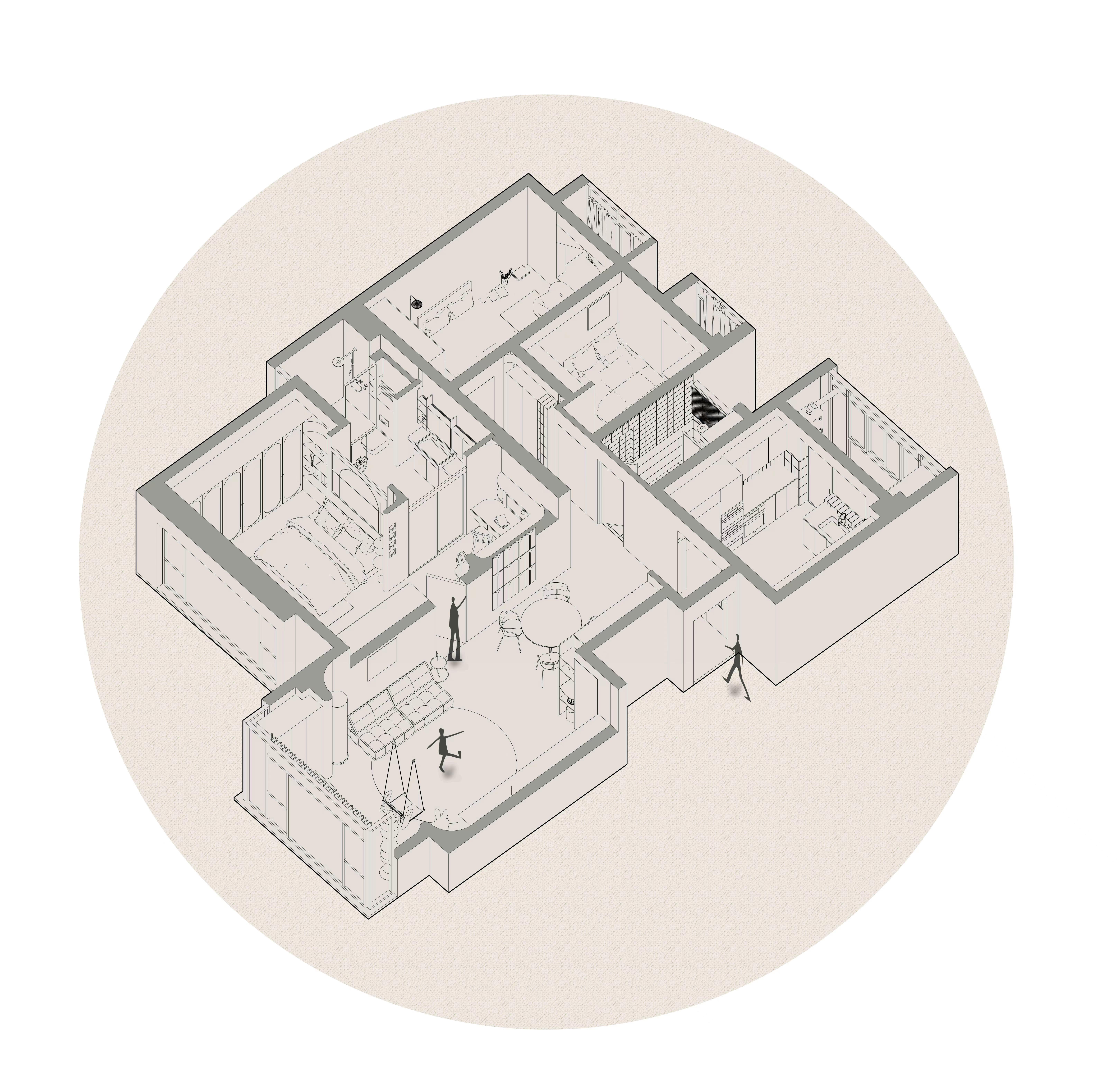 空间布局:我们将过道靠近次卧的墙体做了后退,设置出了一个阅读区域,可以放上小朋友喜欢的手办玩具;拆除原生活阳台与厨房之间的墙体后,把它们梳理为竖向的关系,这样得到了两个方正的空间,使得厨房的操作台区域由原来的4.7米增加为7.8米,将厨房从传统的孤立工作区域转变为一个可以多人协同的开放式空间;并把阳台内拓进客厅,延伸了客厅空间功能,光线充沛适合作为大人和小朋友的互动区域,亦可是一人阅读、喝下午茶的舒适一隅;整合了原主卧空间,通过对动线的梳理,规划出了办公区以及较为舒适尺度的卫浴功能,并调整了入口位置,设置在了靠近客厅的区域,缩短回房间路线距离的同时,也与次卧有效区分,互不打扰。