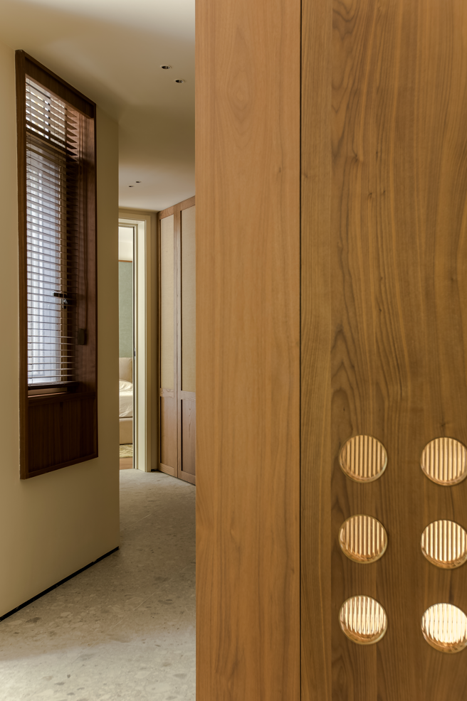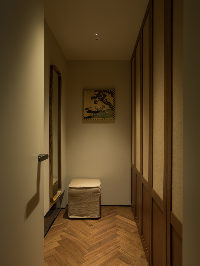 书房与衣帽间的隔墙底端设置了挑空,用玻璃作为隔断,把书房良好的光线延伸到衣帽间地面,衣柜采用胡桃木+麻织的搭配,营造出舒适而又松弛的更衣场景,柜内都设置有灯带,便于衣物日常挑选和取放。