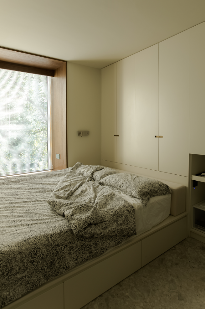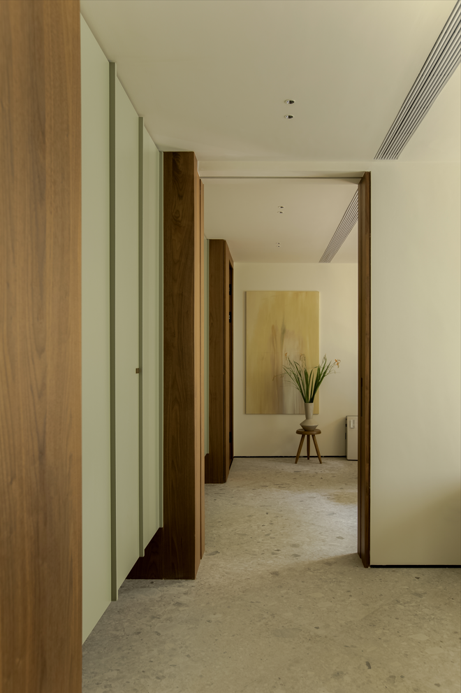 经过餐厨往里走就来到了书房,在走道左侧的一排挑空设计的柜体承担了这个空间相对的壁橱功能,也是为这个空间在不同模式下切换做准备,这里动线也不再只是走道,也可以回归到使用性上来,是走道亦是空间。次卧和书房准确说是由两个房间组合在一起的弹性空间,在平时只有屋主夫妇两人在家的话,这个空间书房+休闲空间模式,走道的口袋门都是藏在墙里面,如果孩子回来了需要卧室,可以通过口袋门的隔断来重组空间,切换成卧室+书房的小套间模式。