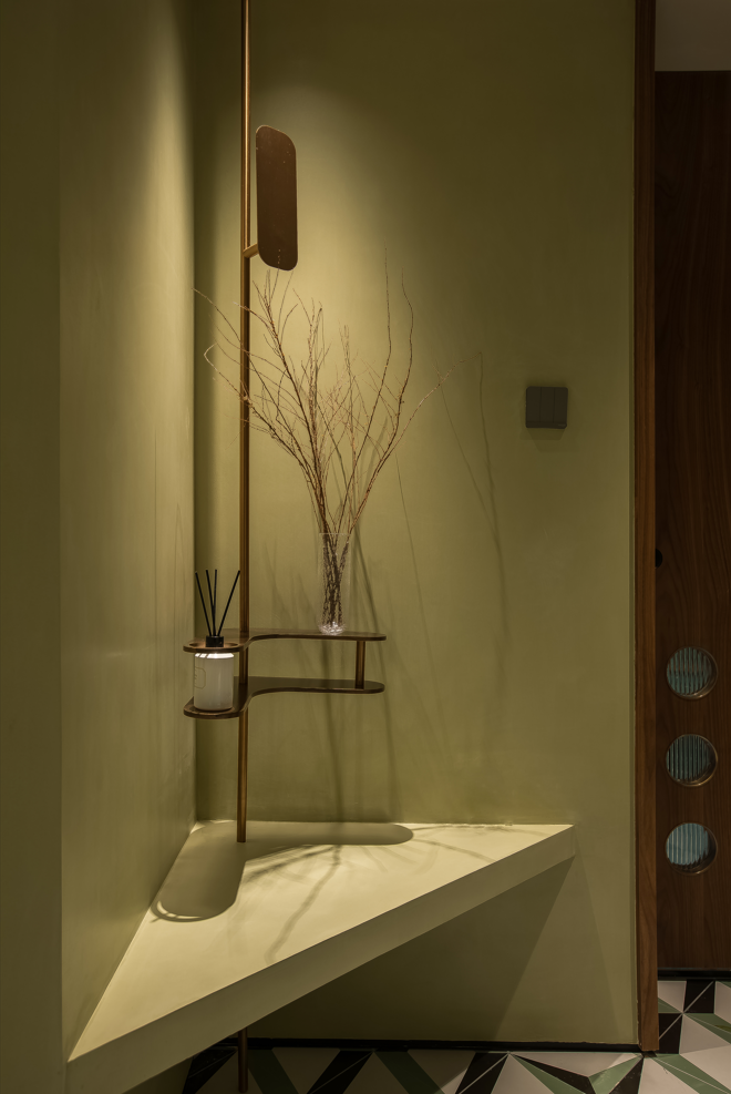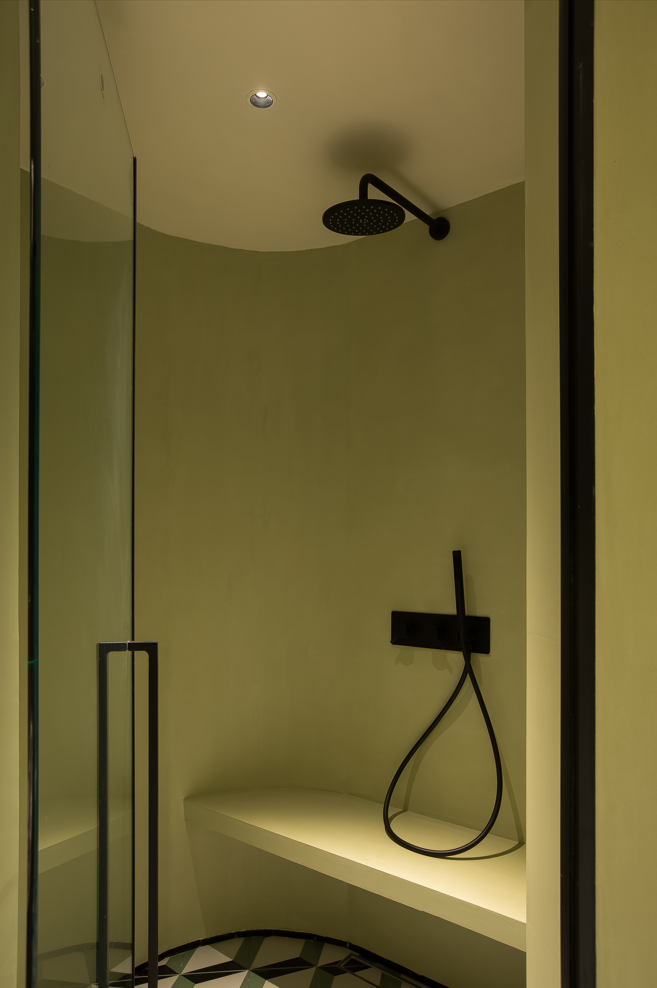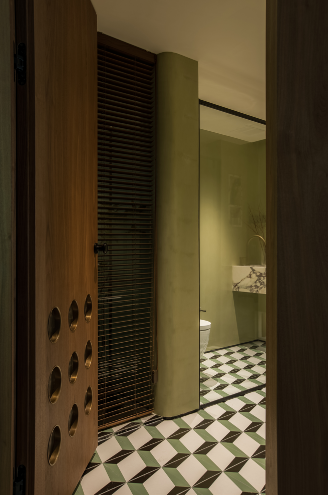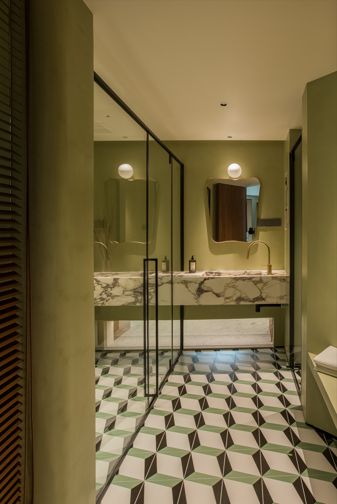 为了延续公区空间自然放松的基调,我们用橄榄绿的微水泥作为盥洗间的背景,搭配略带deco风的地砖让沐浴时光变得宁静、安心。