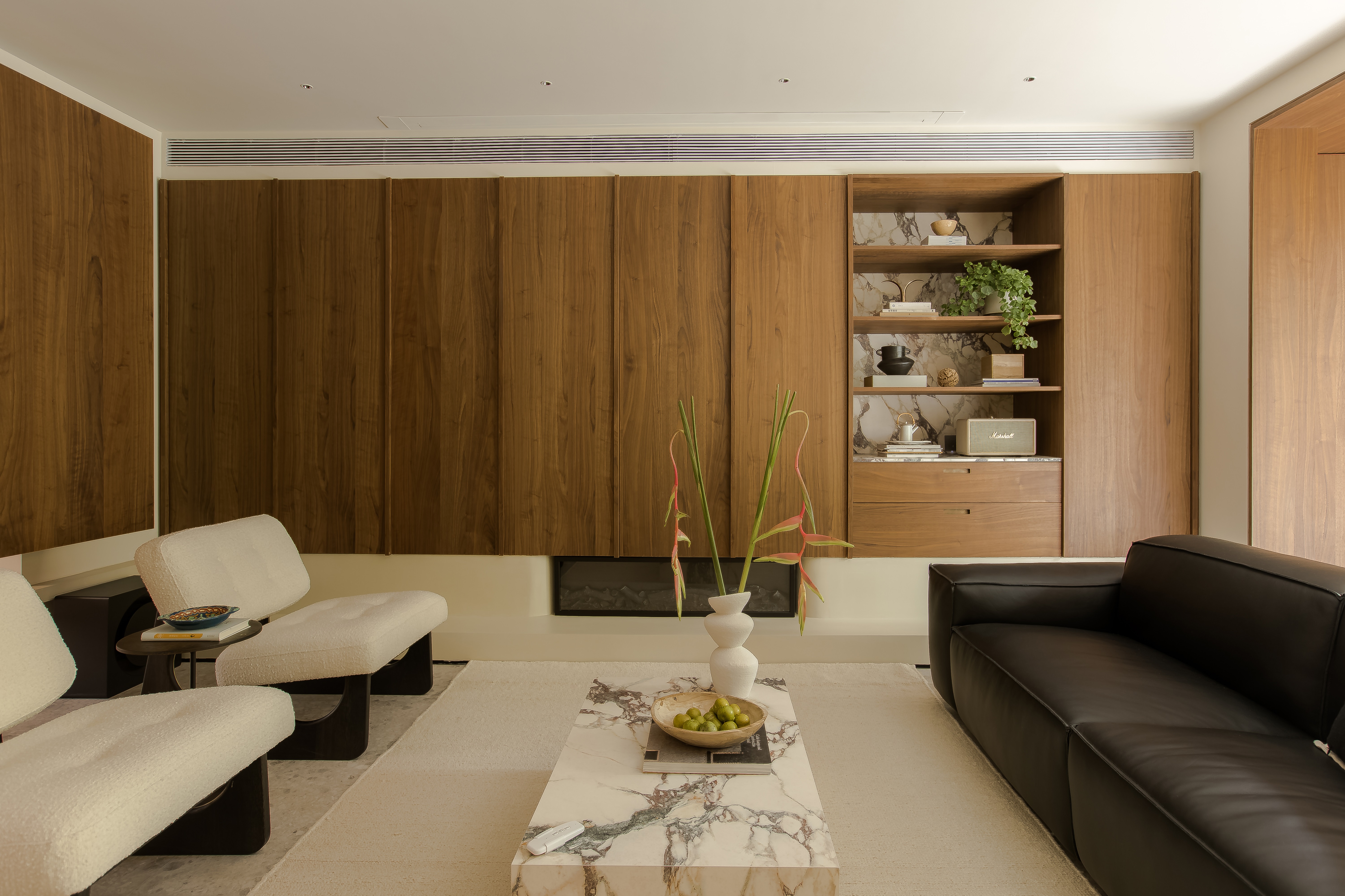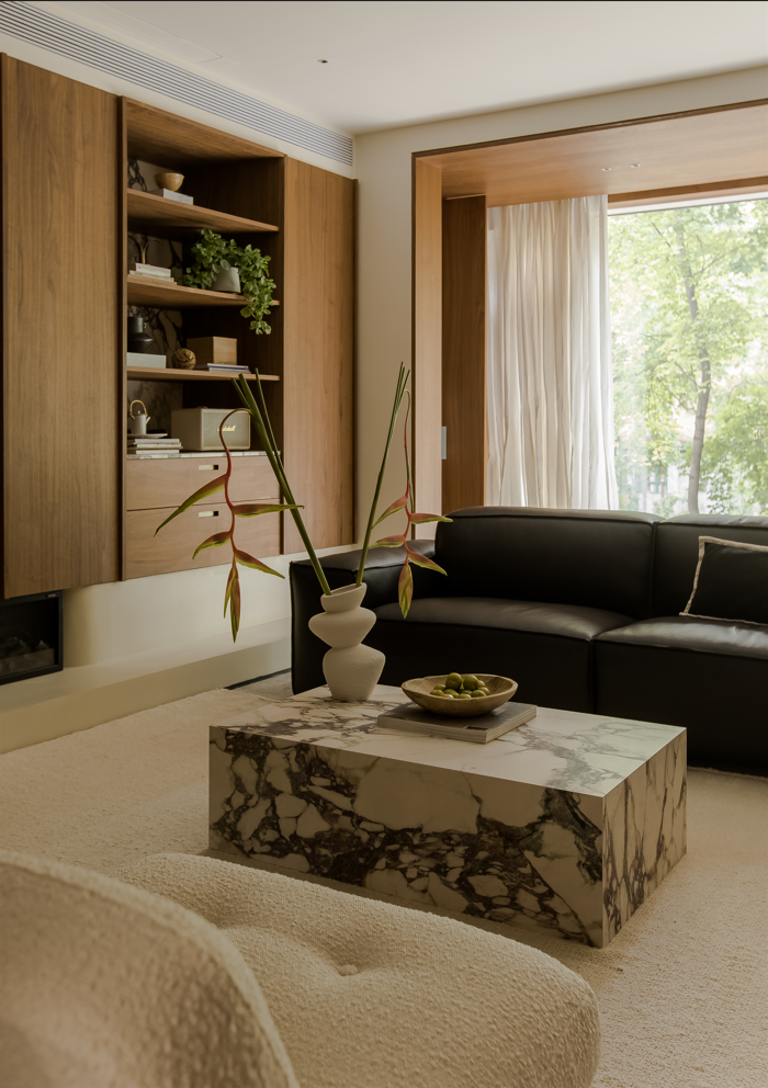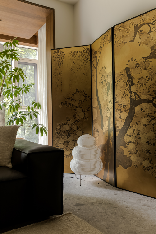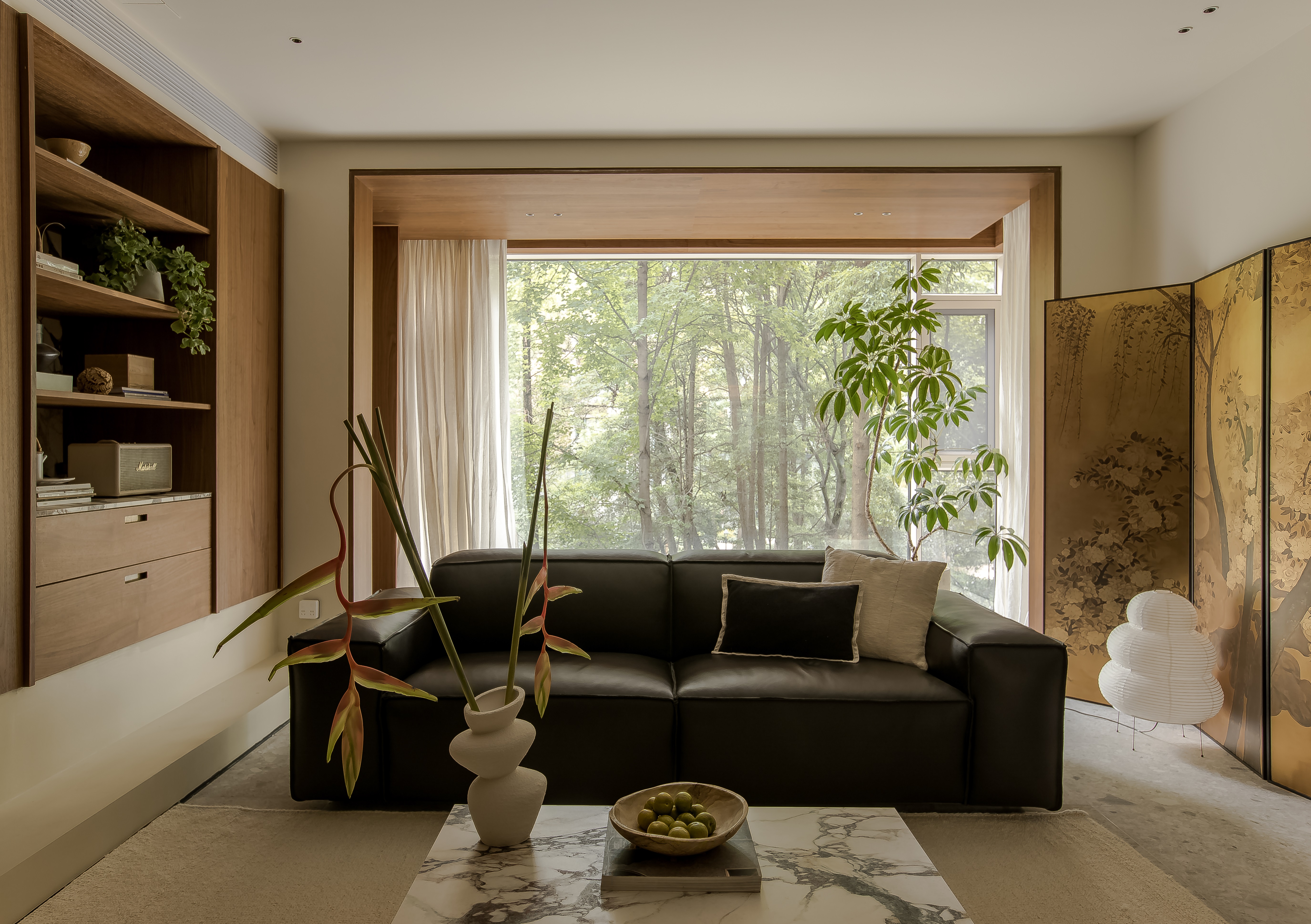 玄关左转便进入客厅空间,把阳台纳入客厅后,不仅光线更多的来到了客厅,而且为客厅带来了沉浸式的窗景体验,黑色手工皮沙发面朝内而坐,不仅能把窗景的蓊郁引入客厅,还营造出松弛自在的室内氛围,形成客厅动线上令人愉悦的驻足点。