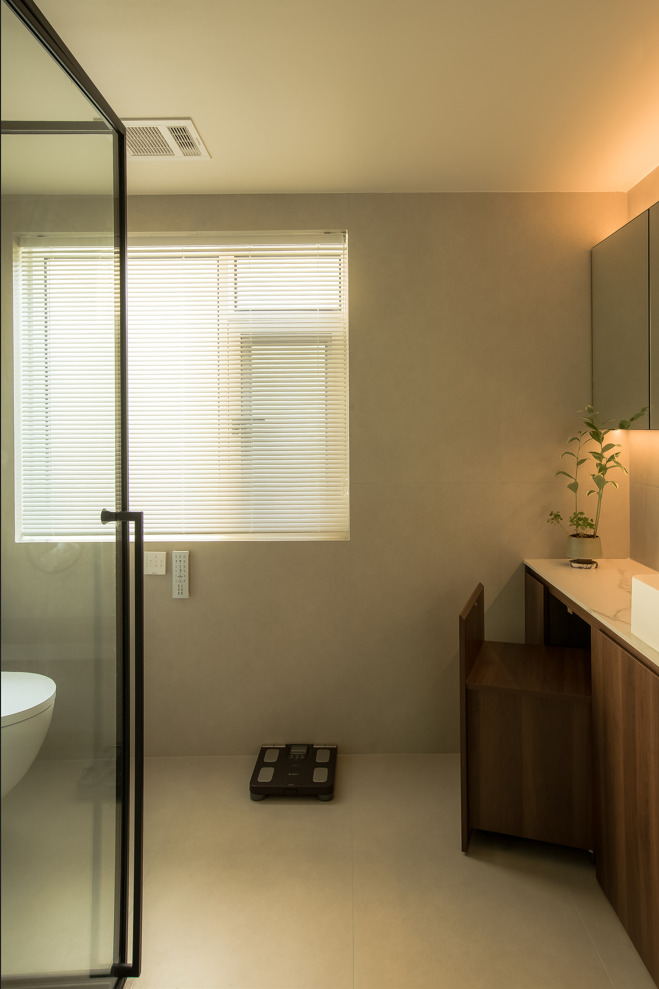 主卫采用了浅米色的水磨石砖墙地通铺,模糊墙地交界,倍化空间视觉。