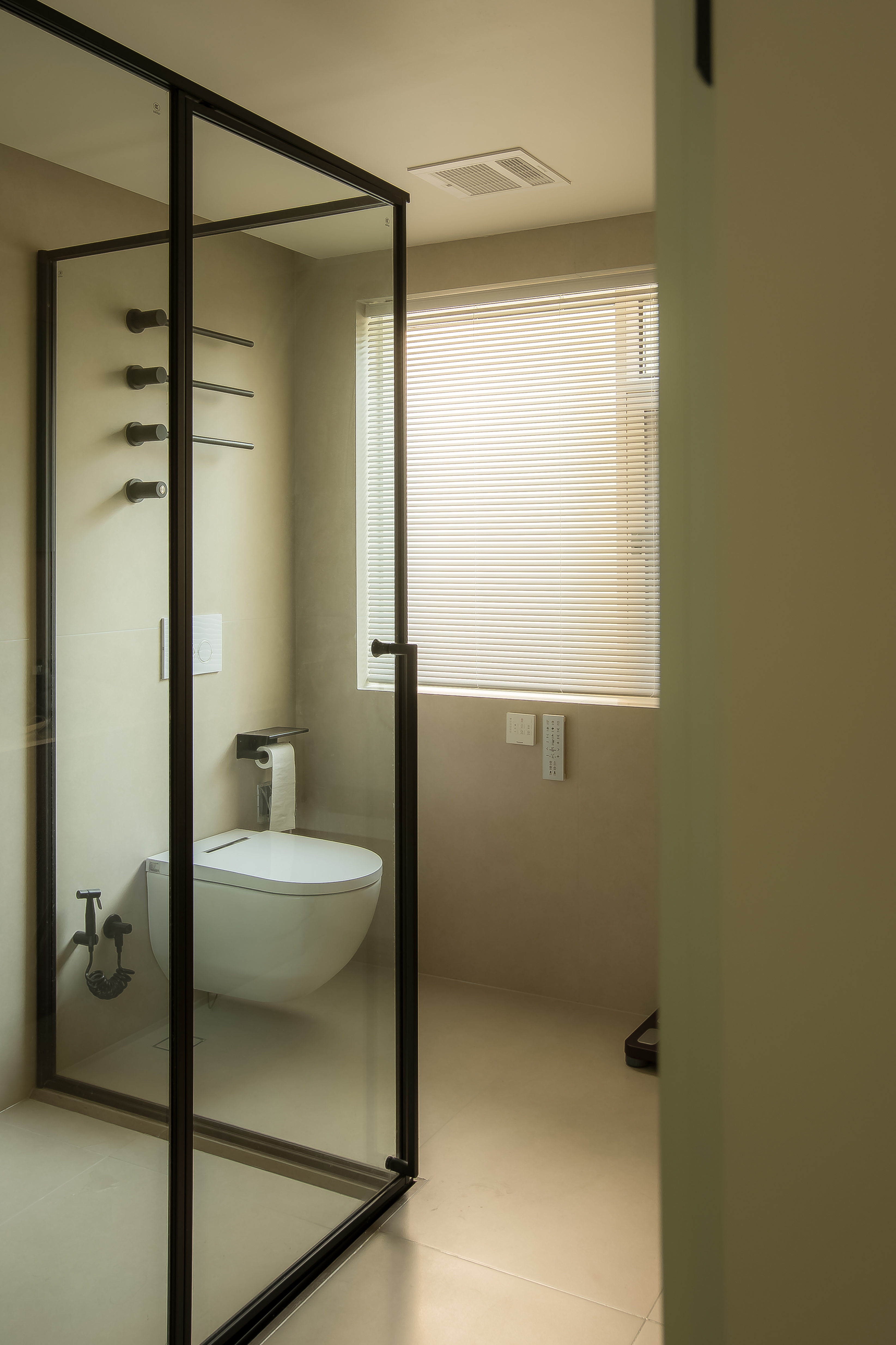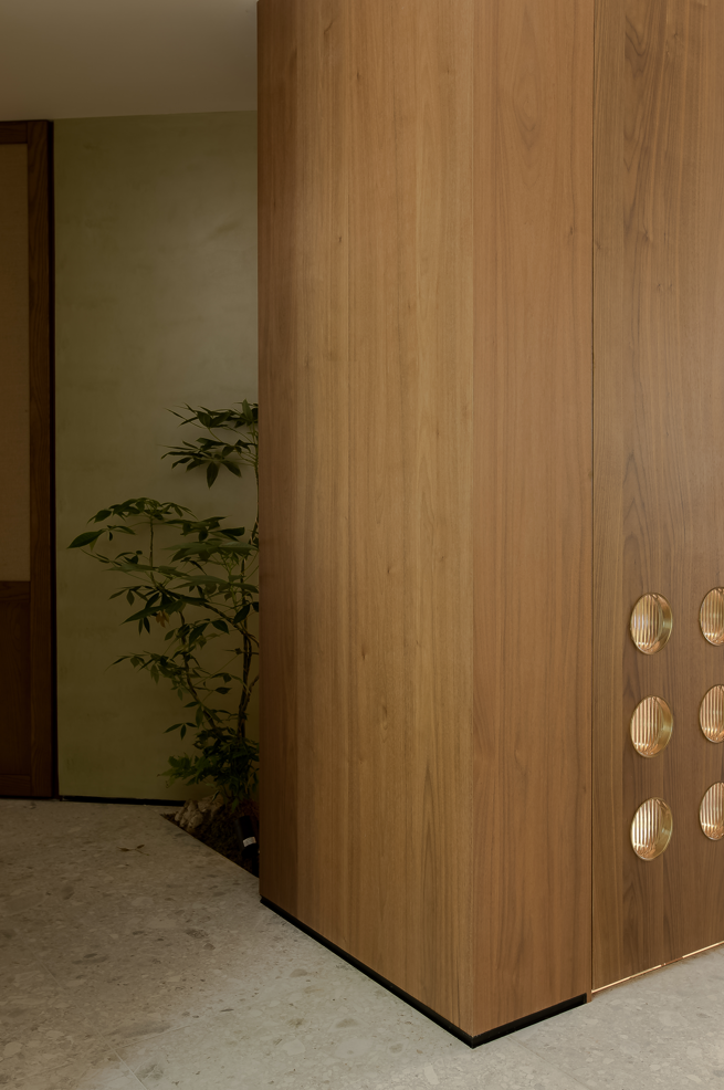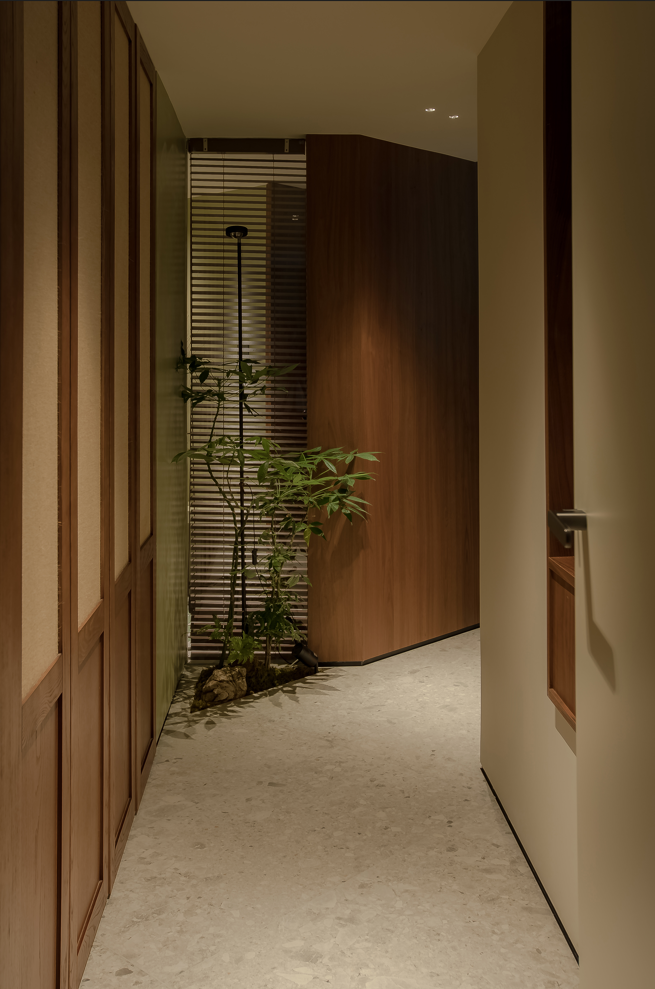 盥洗间安排在客厅靠近走廊的一端,进门处的落地窗外是走道的花池小景,我们希望能把自然引入盥洗间,同时也能把走廊的光线延伸到这里。
