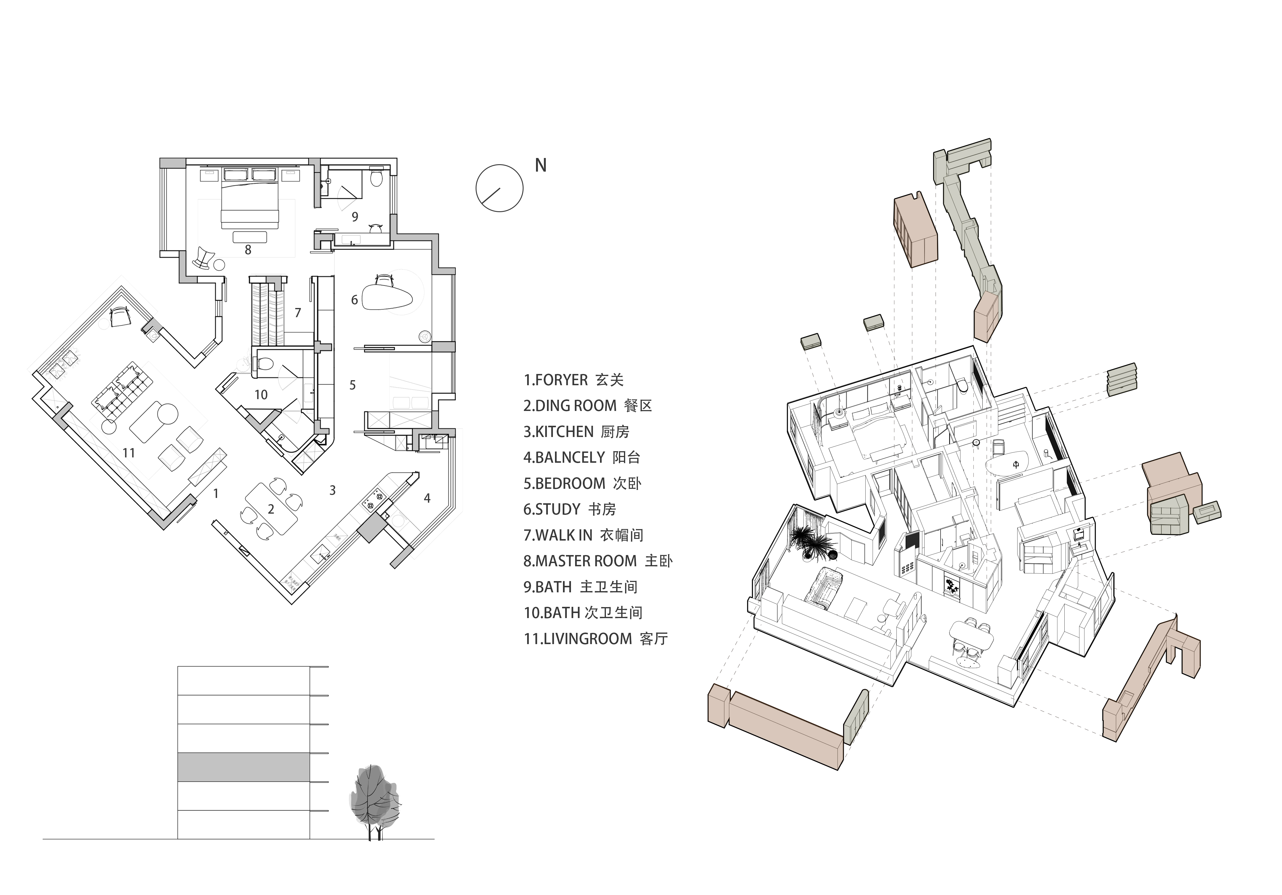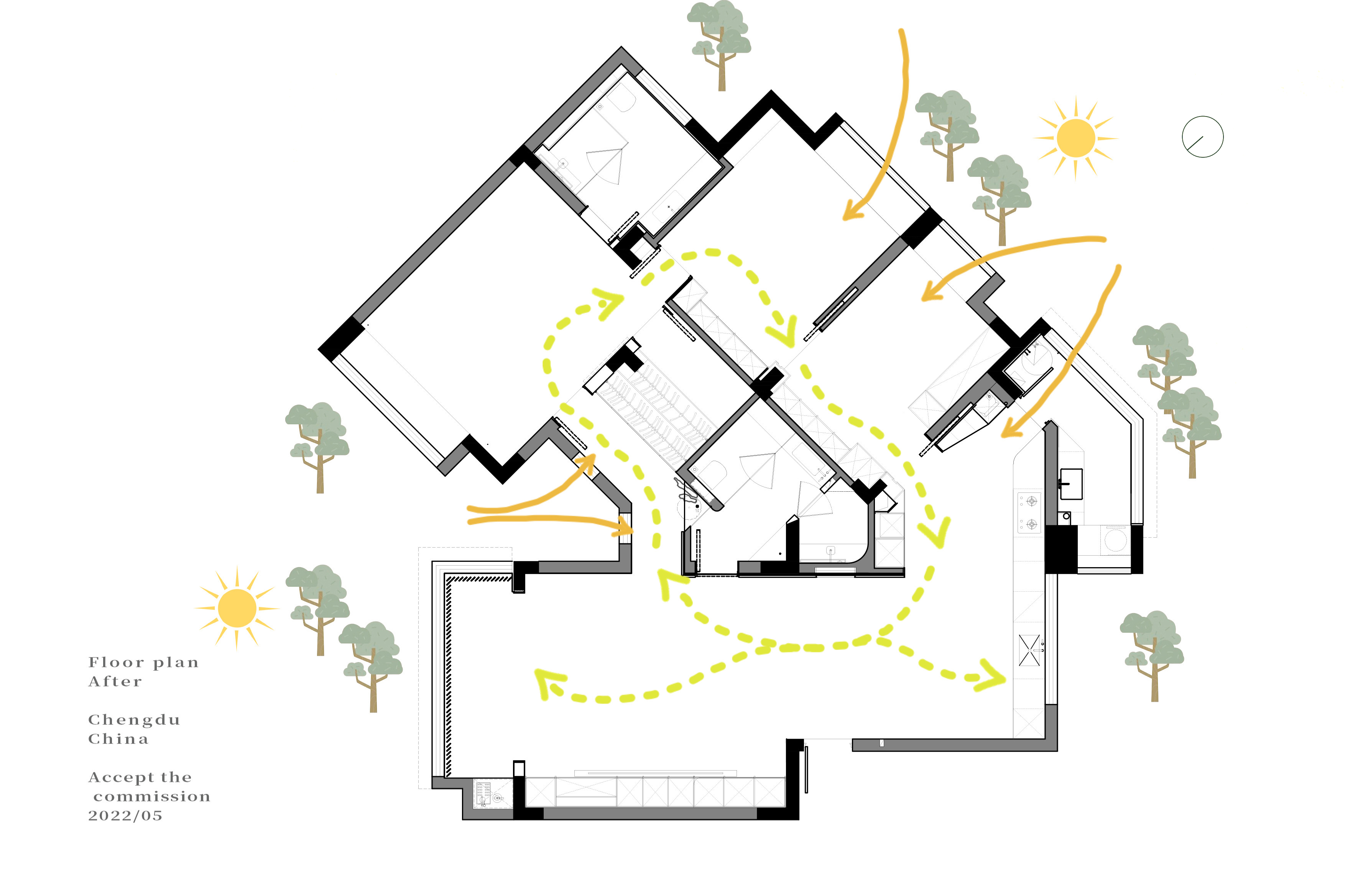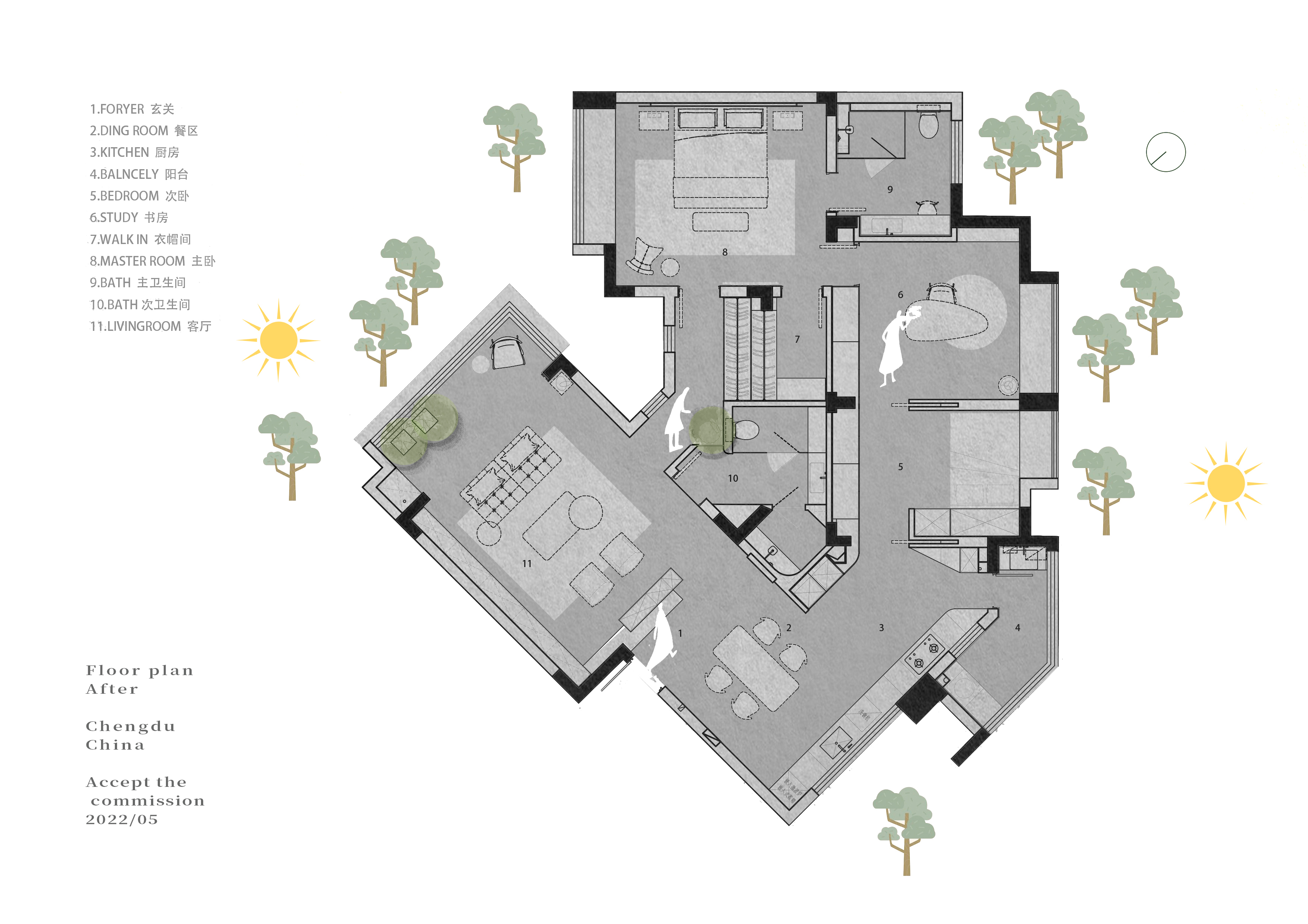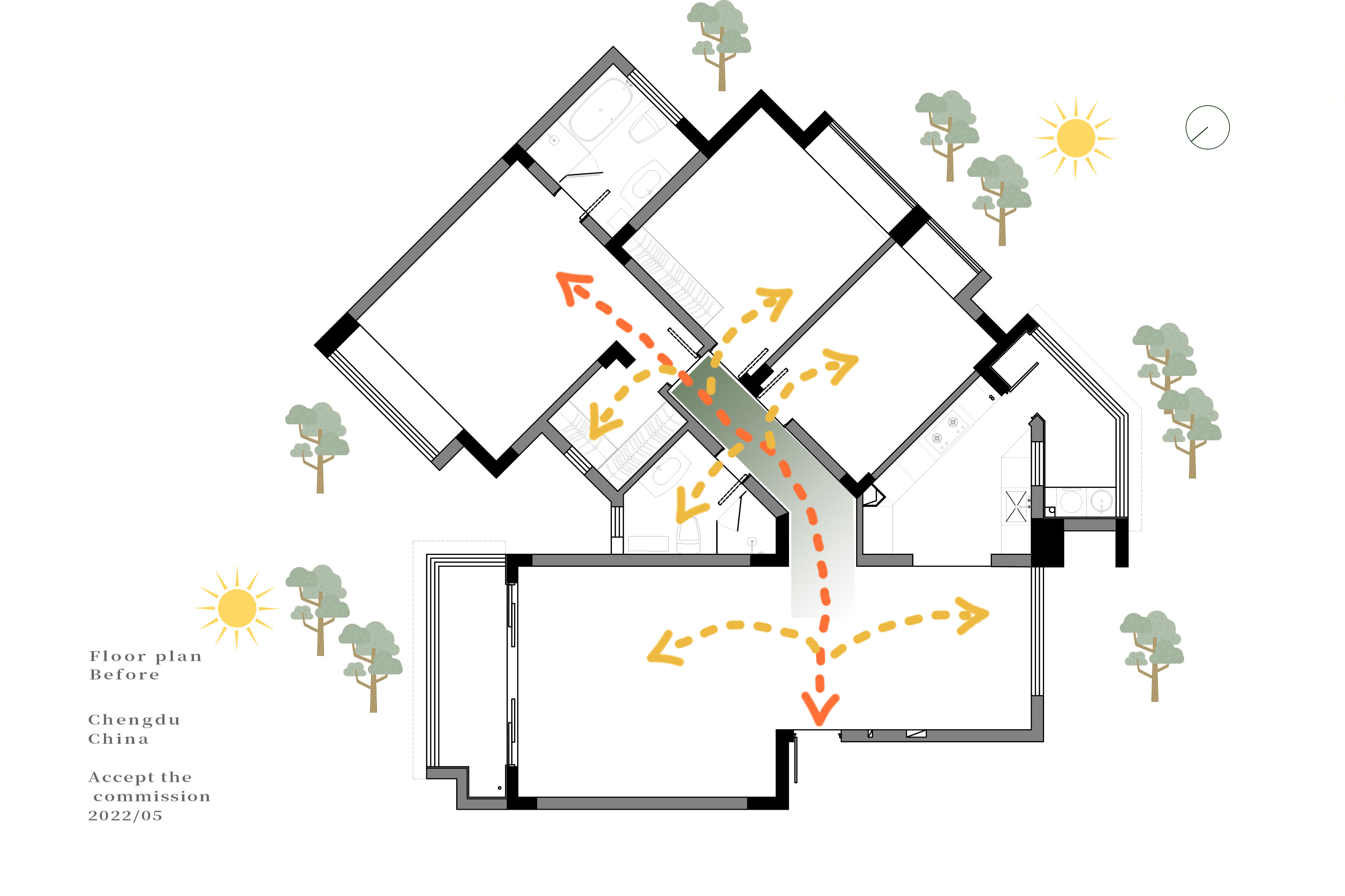 项目定位:这是个老房翻新的项目,一家三口一起在这里生活了18年,原美式乡村风格的装潢,墙面墙纸已经空鼓开裂,地板也有不同程度的变形,屋主孩子长大已经出国工作,空置的房间几乎很少进入更不谈使用,屋主夫妇退休不久在家时间变得长了起来,愈发觉得原来的家不能满足他们生活功能的需求和动线体验,希望通过设计重新构架空间格局,解决家中收纳不足同时提高生活的品质。房屋本身条件不错,双面采光,每个房间都有不错的窗景,遗憾的是房间都是各自独立,光和窗景都被关在了房间里,同时遮住了主动线的光线,导致这条通往各个房间的走道的昏暗,加上原来空间功能不合理,餐厨闭塞没有互动性,收纳不足导致生活物品外拓,公区空间体验下降,最终导致整体空间浪费愈发严重。