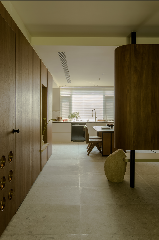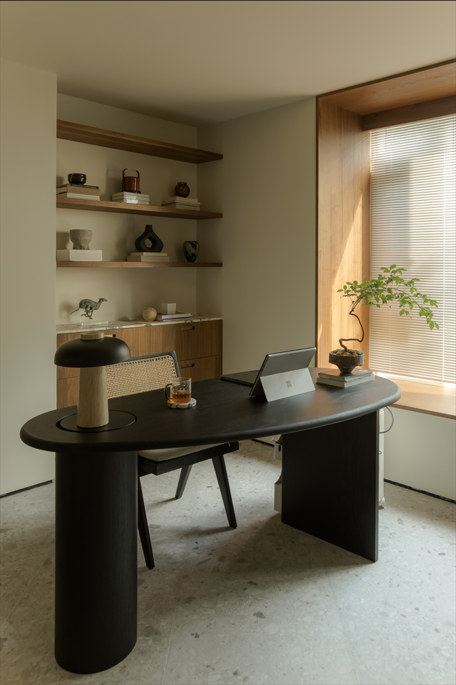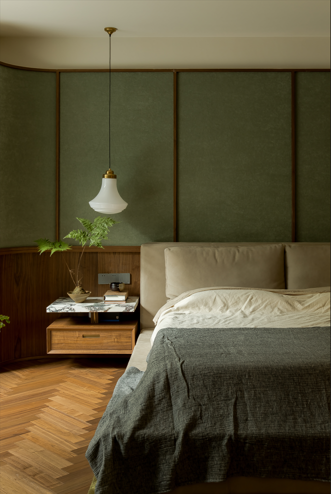 胡桃木让人有归属,麻织的床屏让空间显得更柔软,氤氲出平和松弛的气息。