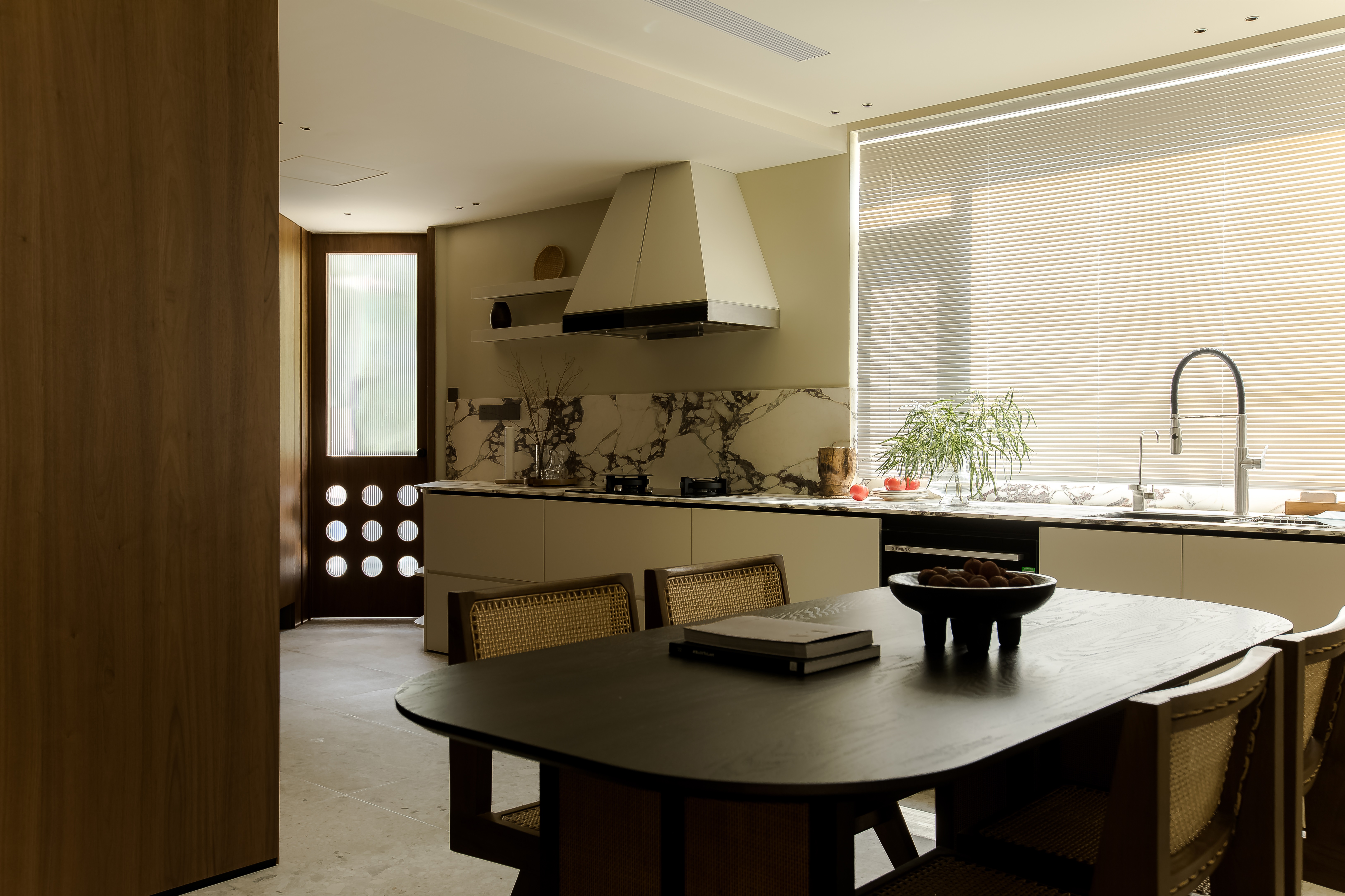 造型圆润的原木餐桌搭配藤编的木椅,呈现拙朴、宁静的生活氛围。
