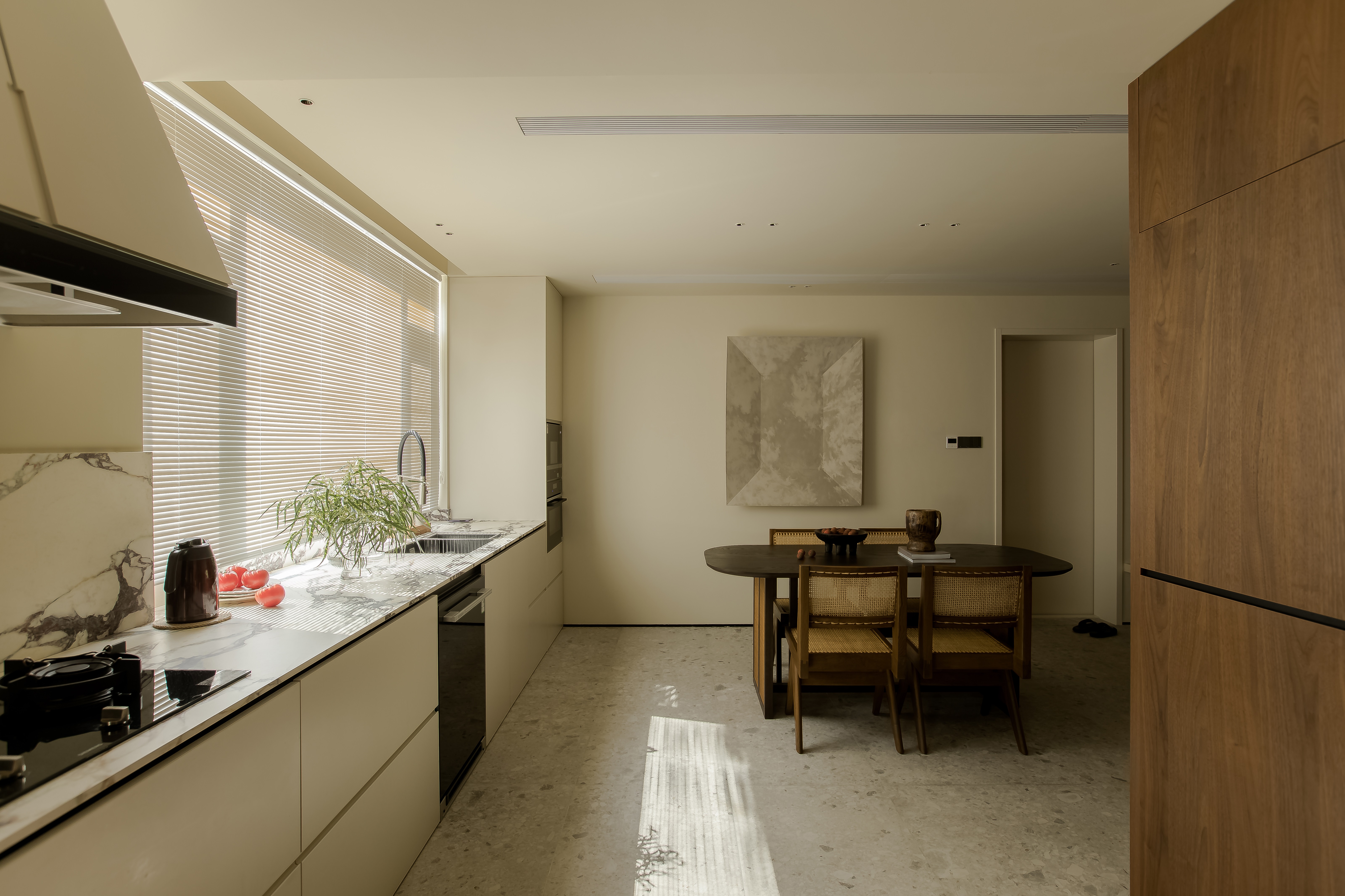 我们打开了原来的厨房空间,把“卷缩”在里面橱柜,一字排开舒展出来,一直延伸到餐厅,这样不仅拉大了餐厅空间的尺寸,让它成为家人的生活中心。