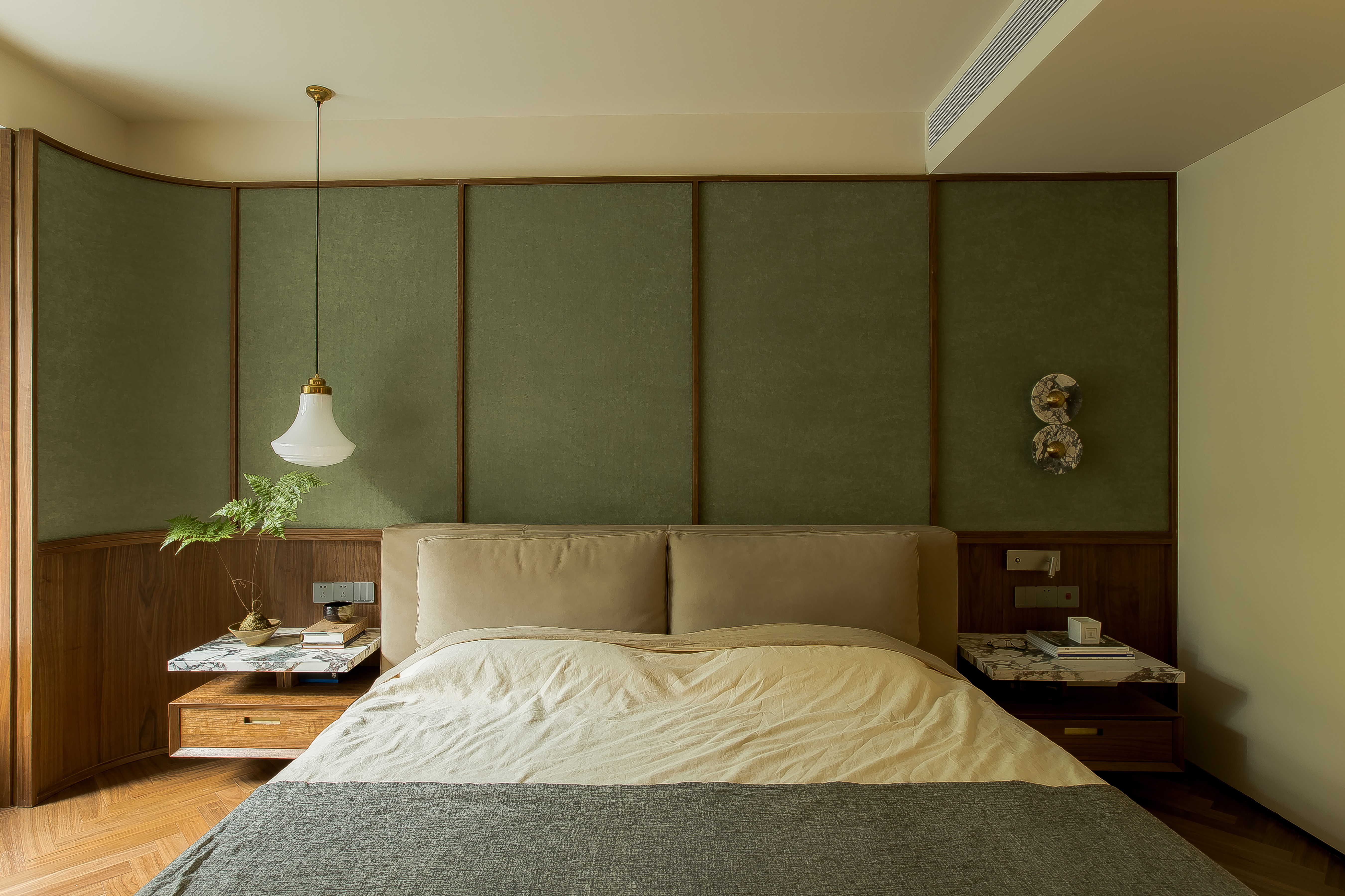 卧室床头设计了胡桃木+麻织的床屏。