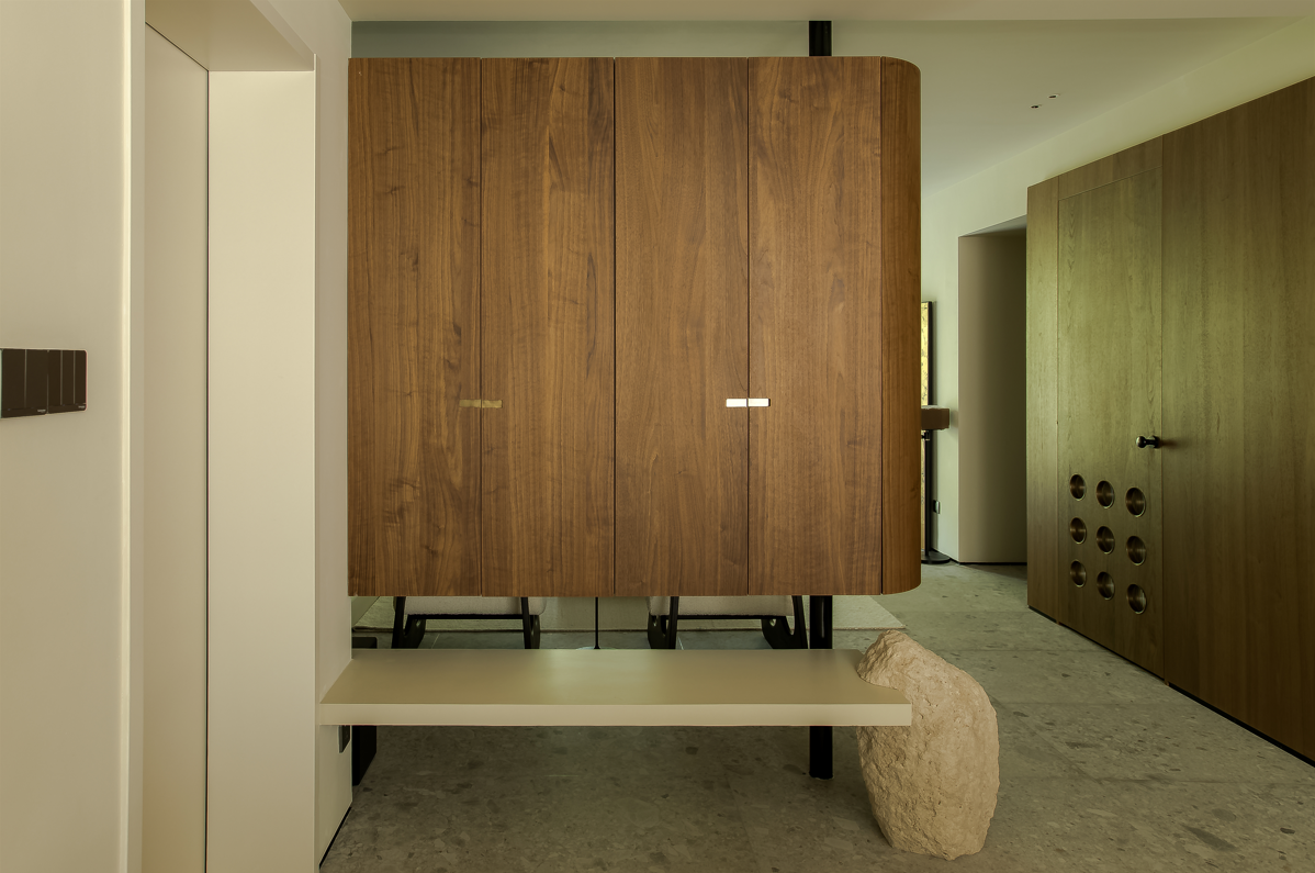 我们在客厅设置了5米长的收纳柜体,胡桃木柜门饰面,随着时间的推移而变化,木调的颜色可以刻录时间的表情,悠闲地躺在沙发上,感受一旁落地窗外的蓊郁和阳光。客厅的储物柜相当于100个20寸登机箱的容量,不论是目前男主人高尔夫装备还是日后屋主日常收纳都可以轻松应对。屋主一直想有一个可以看电影的客厅,在壁橱前我们在吊顶嵌入了投影幕布,不论自己是看电影,还是家人、朋友一起聚会也能拥有丰富多元的互动体验,让空间动静相宜,是个非常Chill的驻足地。