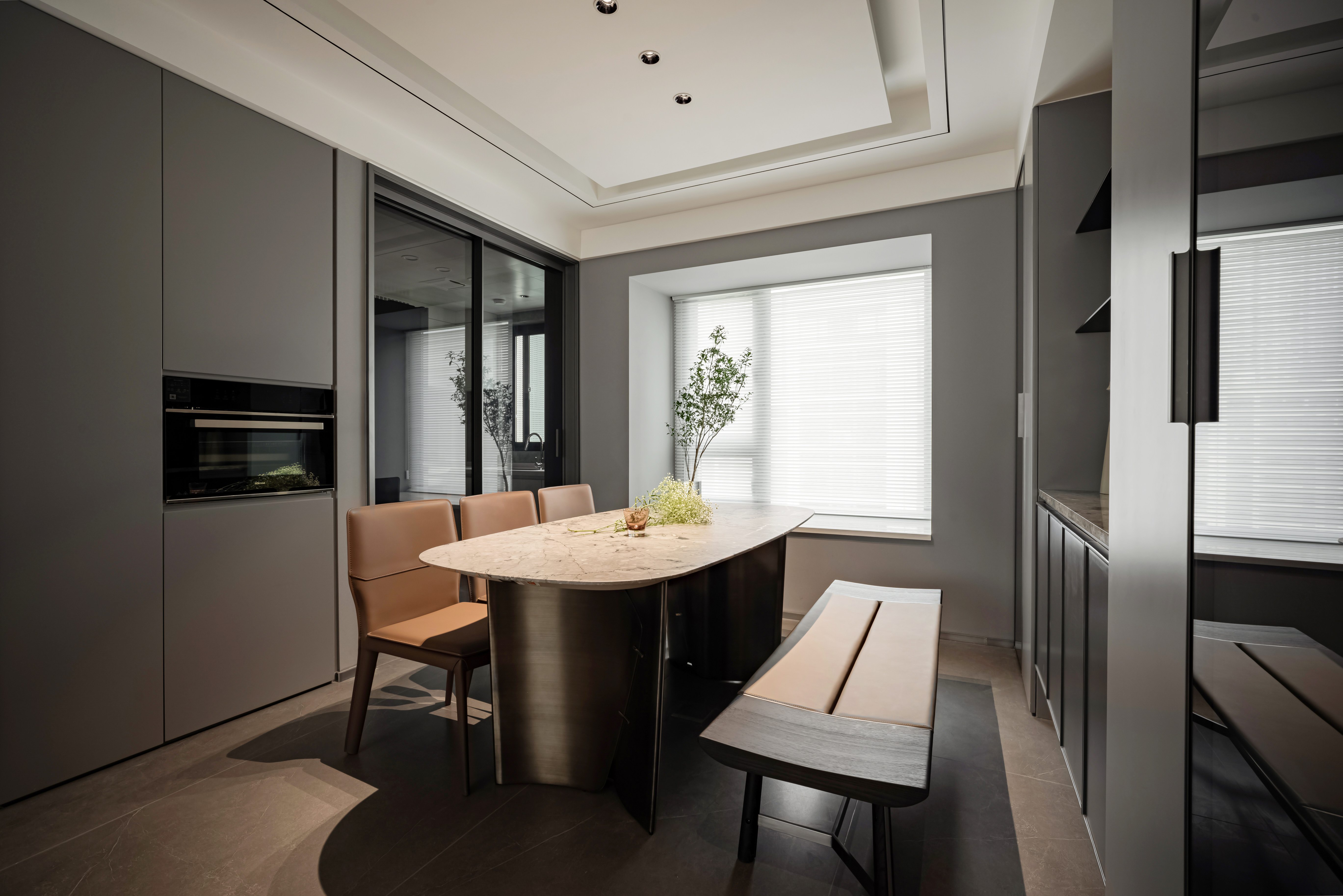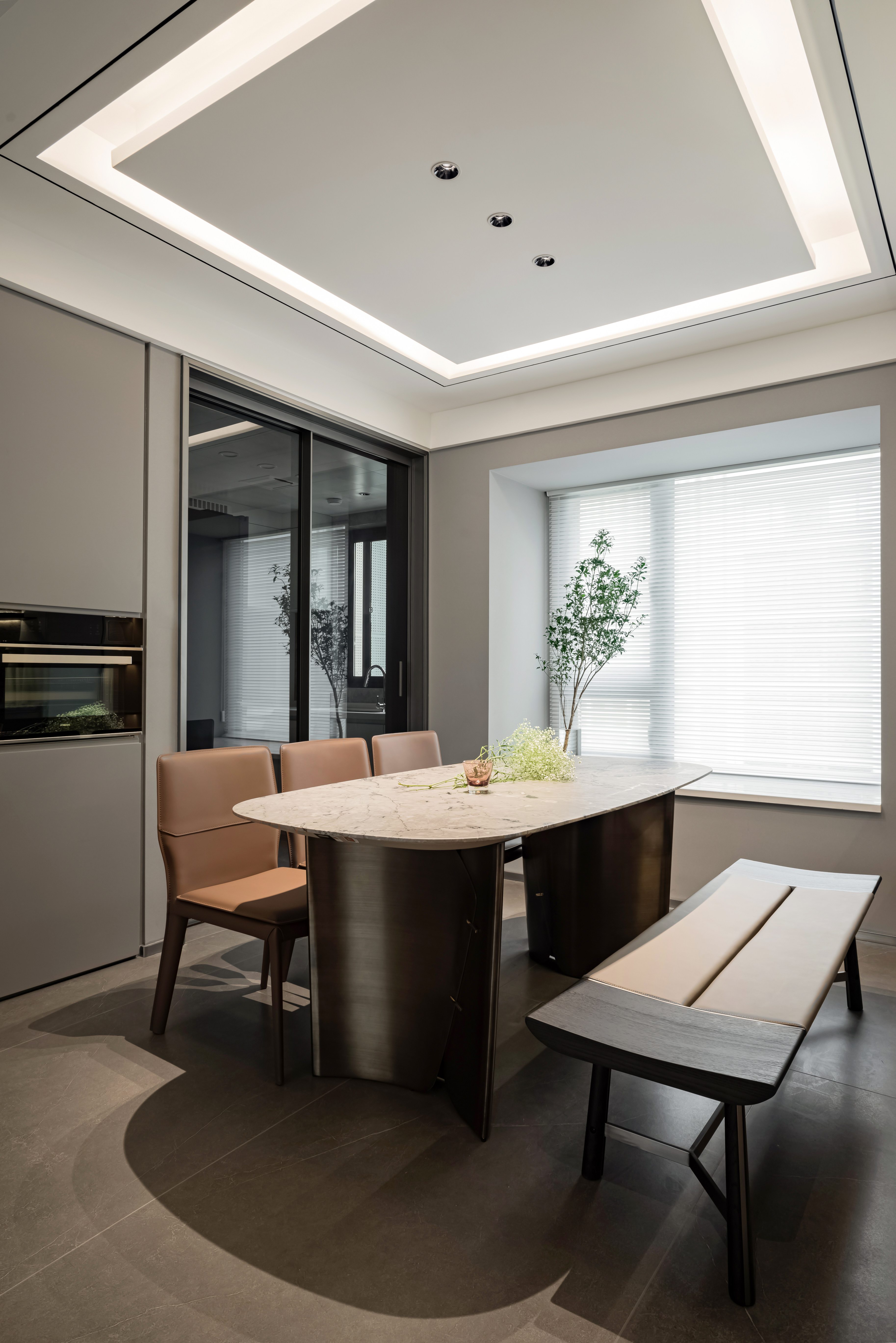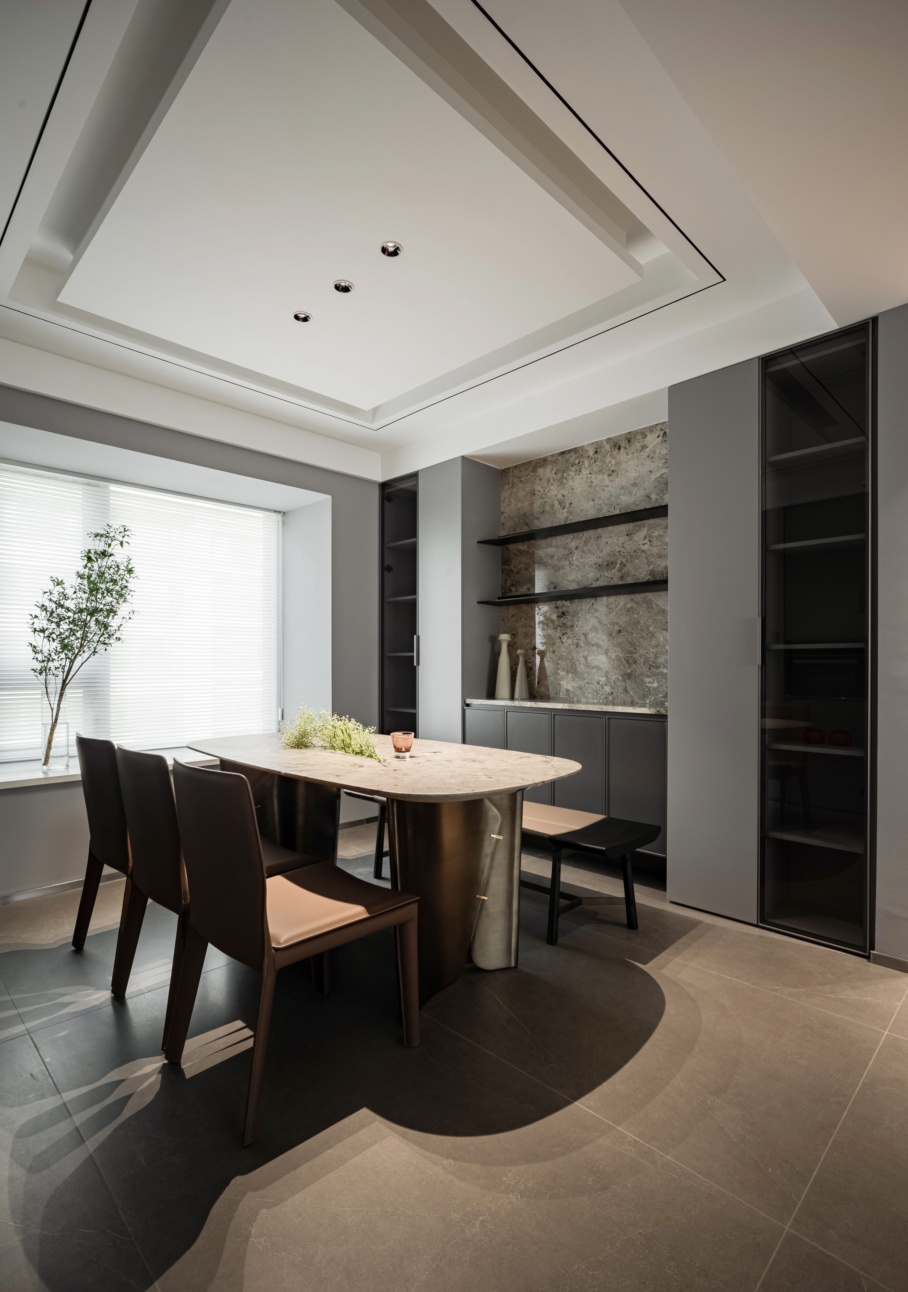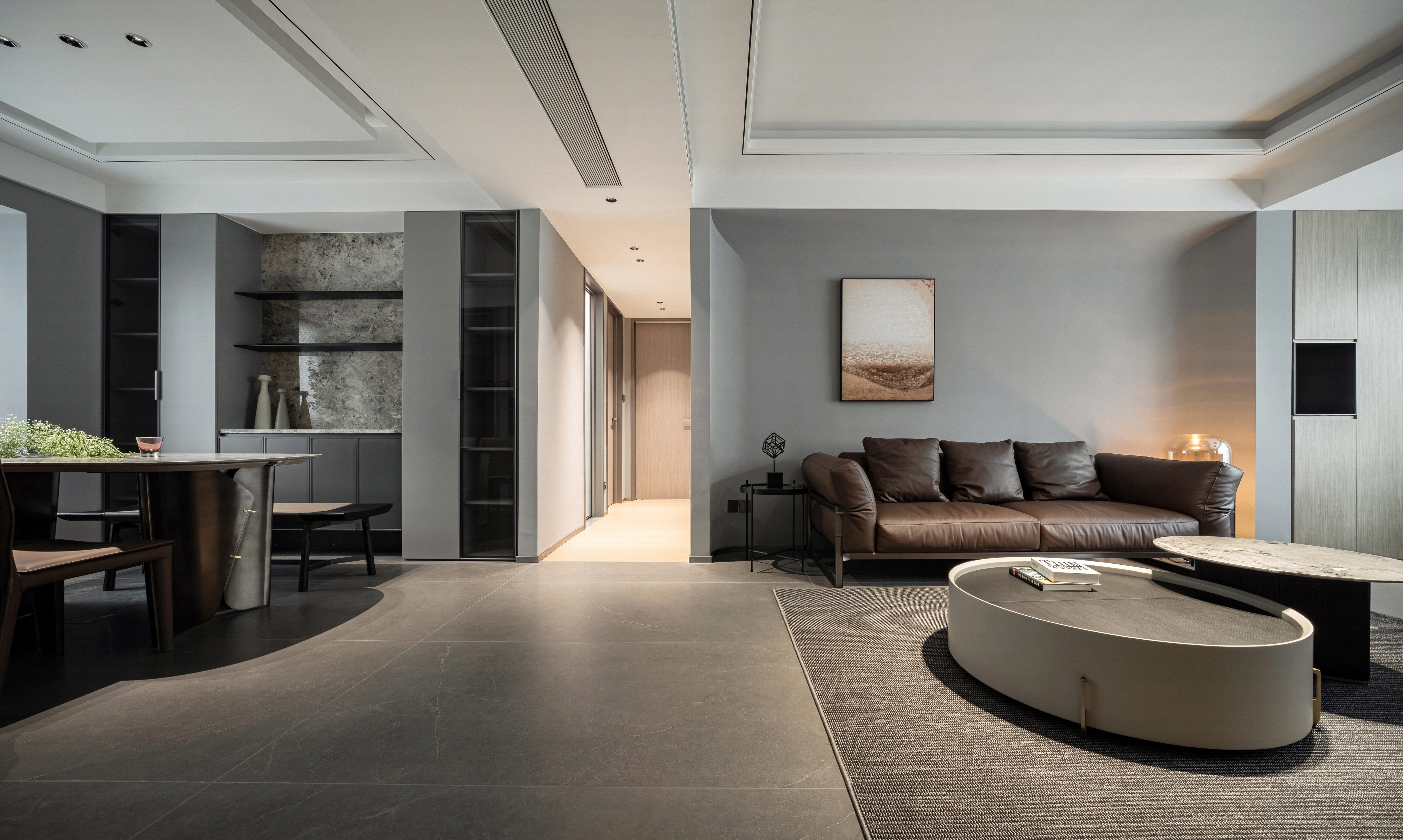 空间意境:加入高级感的灰调系与木饰面的结合,岩板与木饰面,配以艺术漆+金属,线条曲面吊顶,带动空间活力.