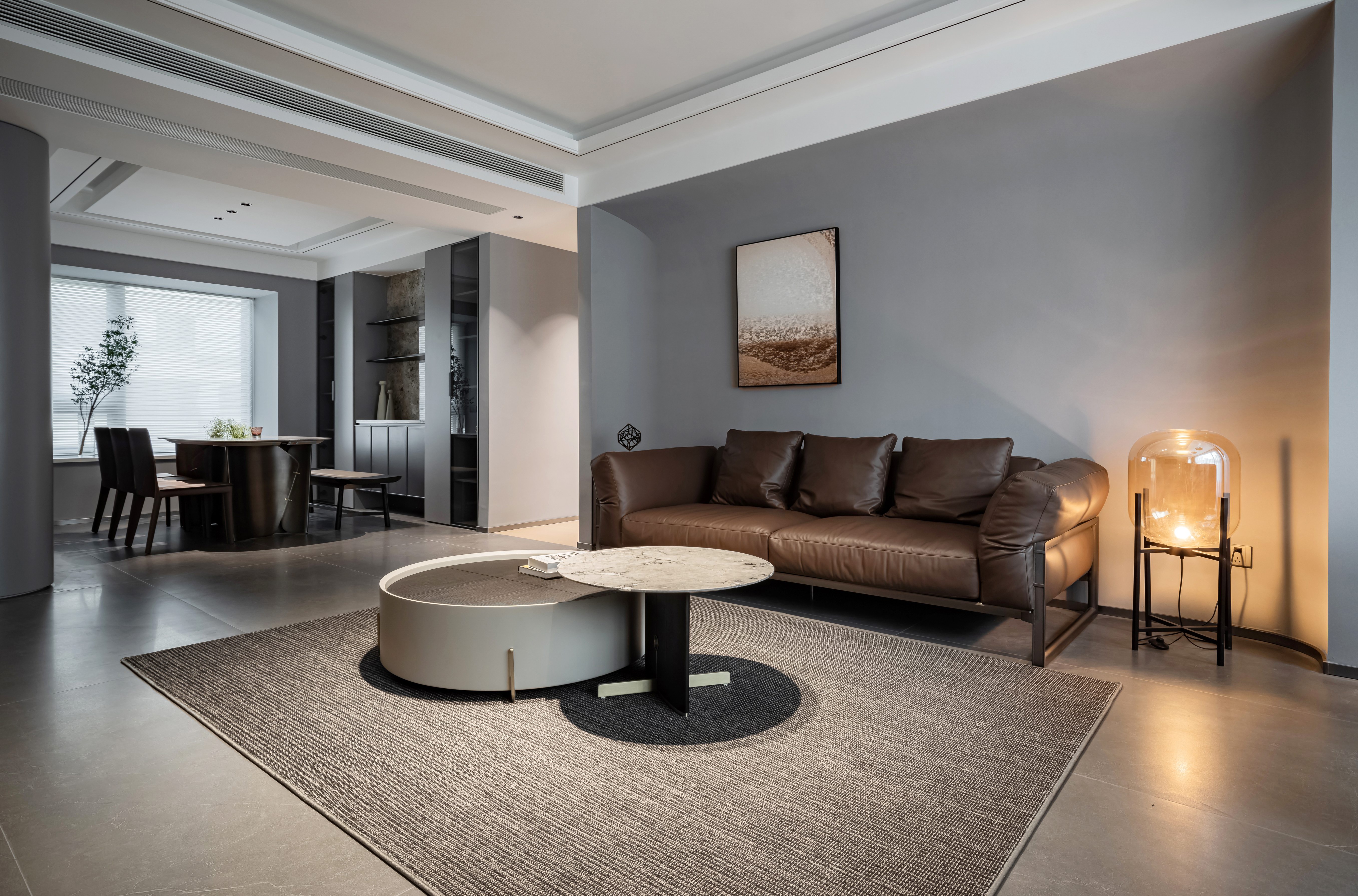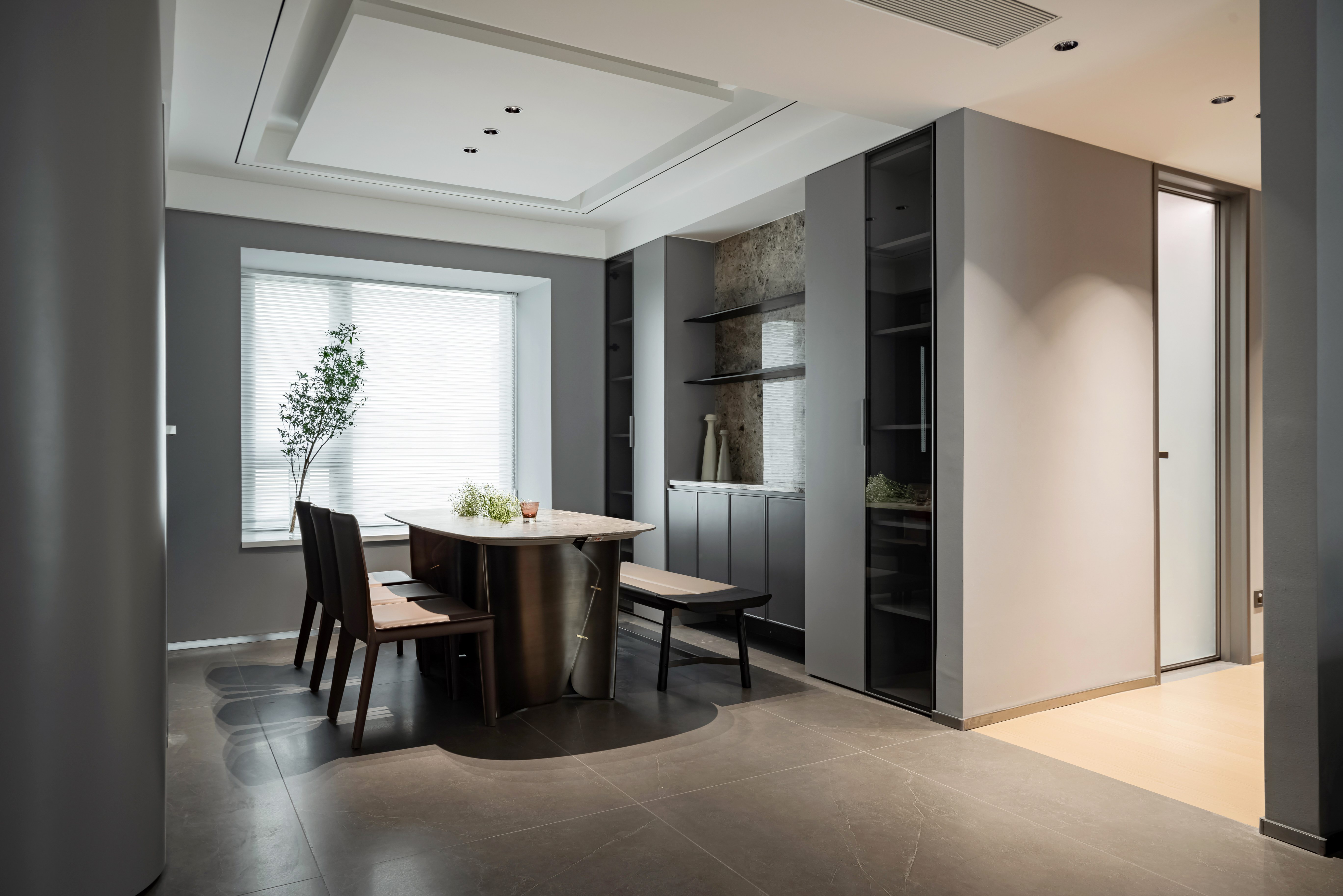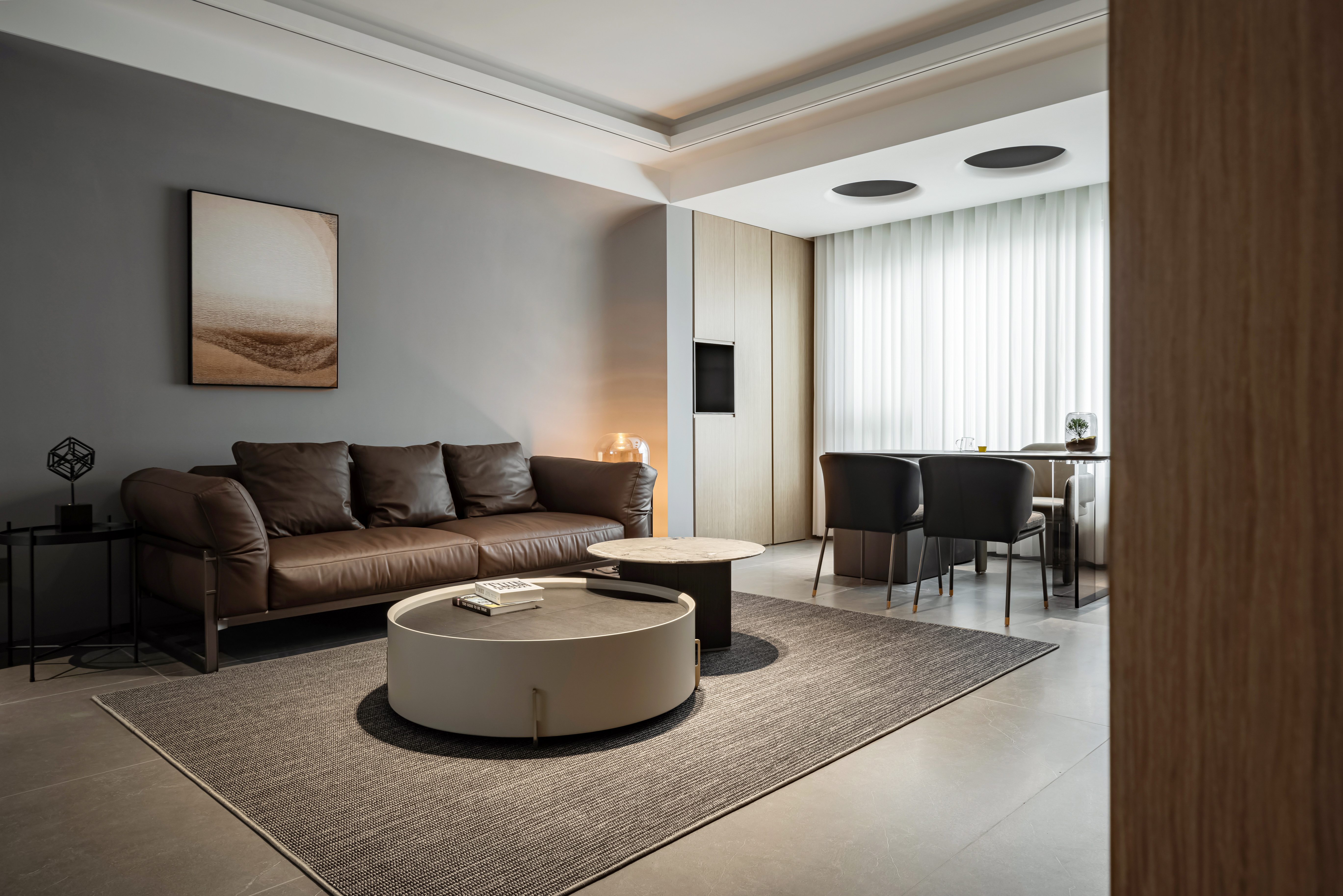空间意境:加入高级感的灰调系与木饰面的结合,岩板与木饰面,配以艺术漆+金属,线条曲面吊顶,带动空间活力.