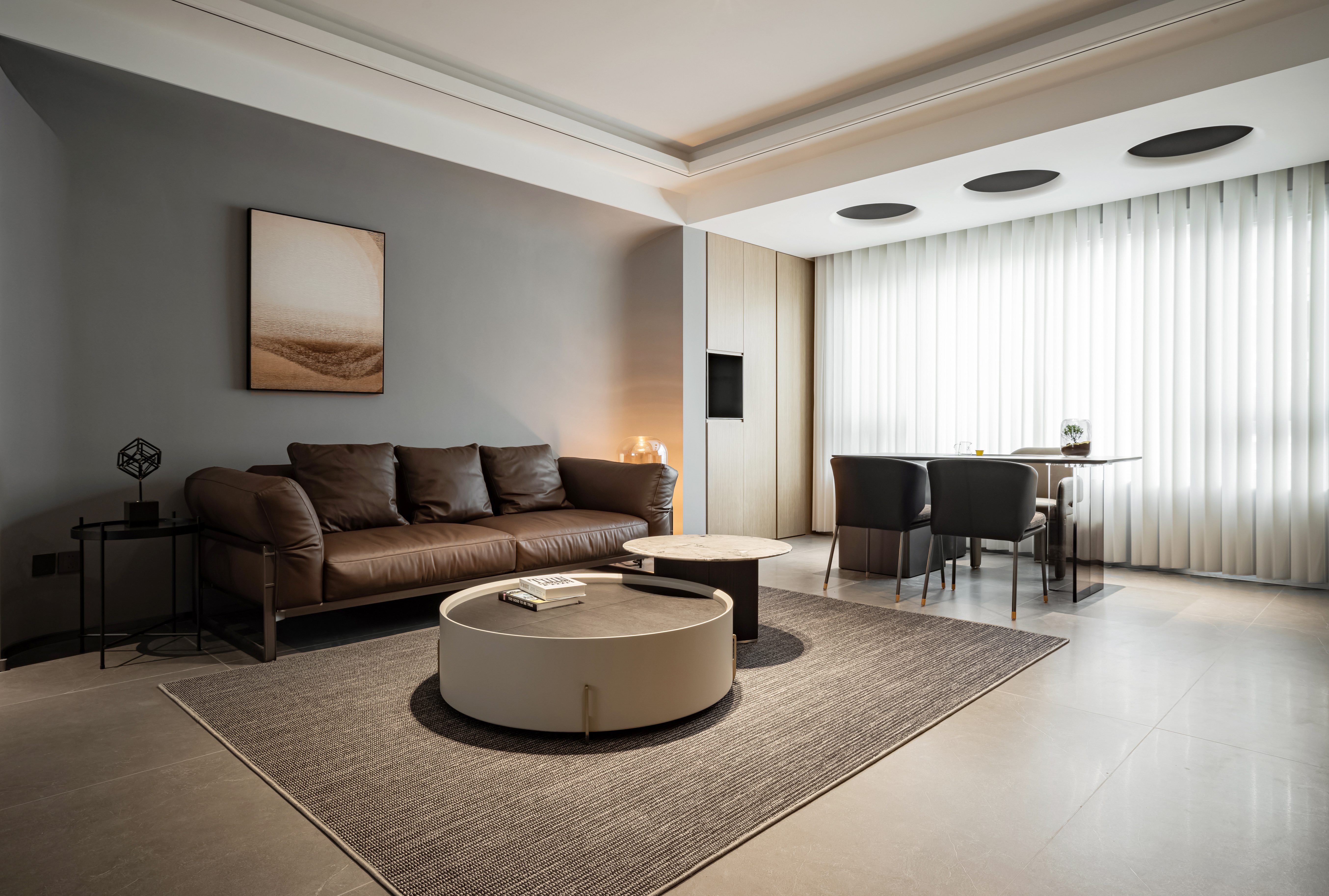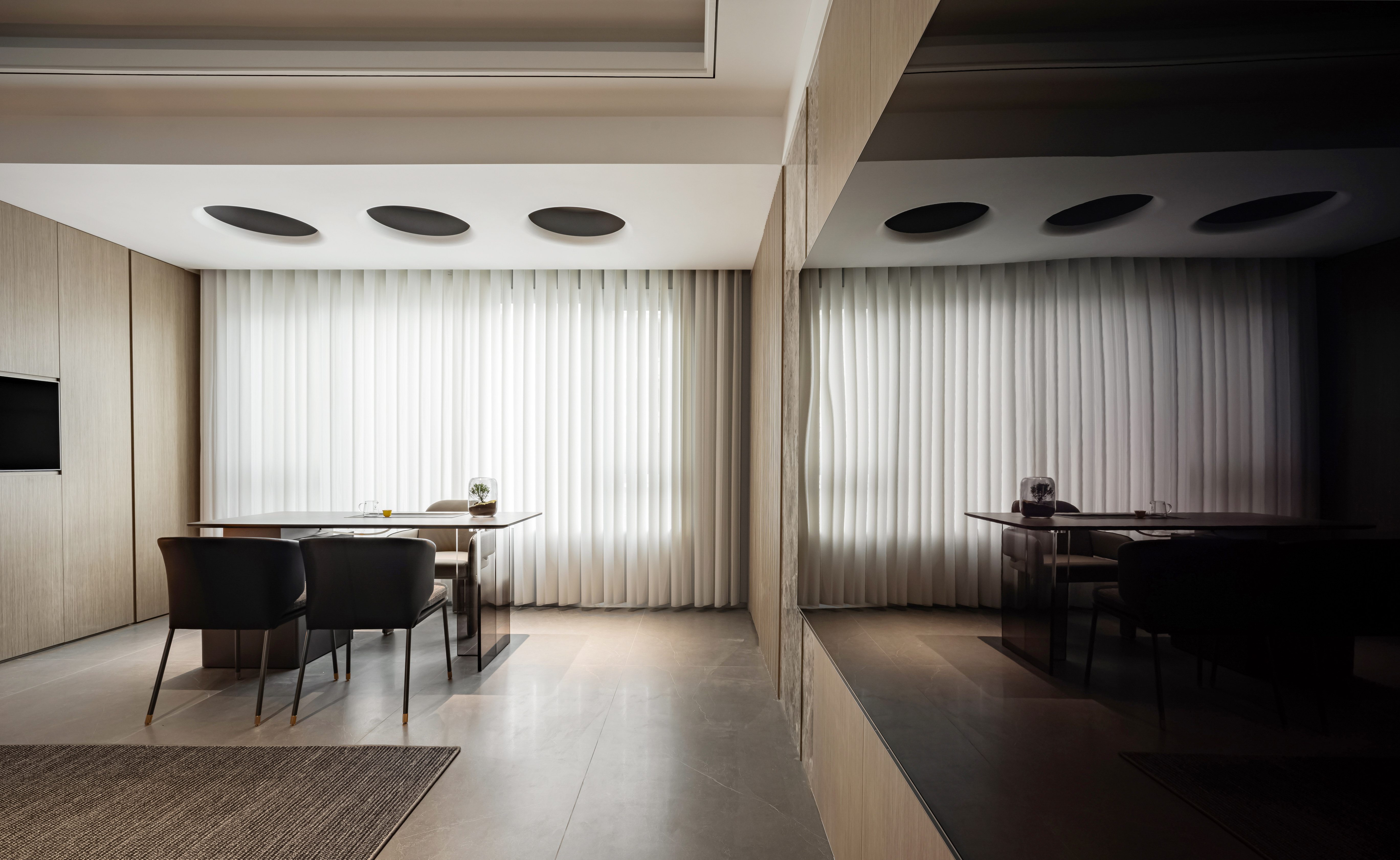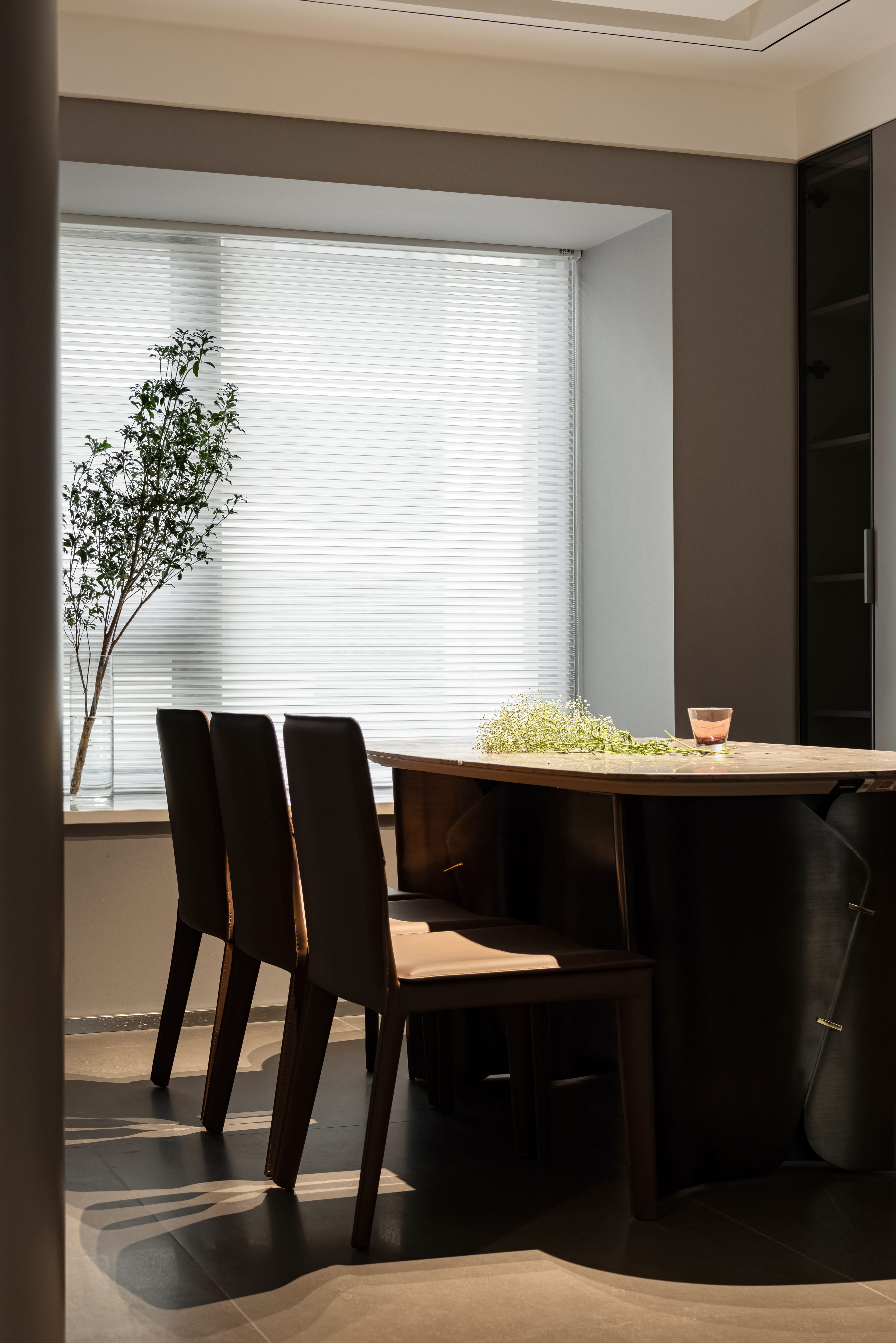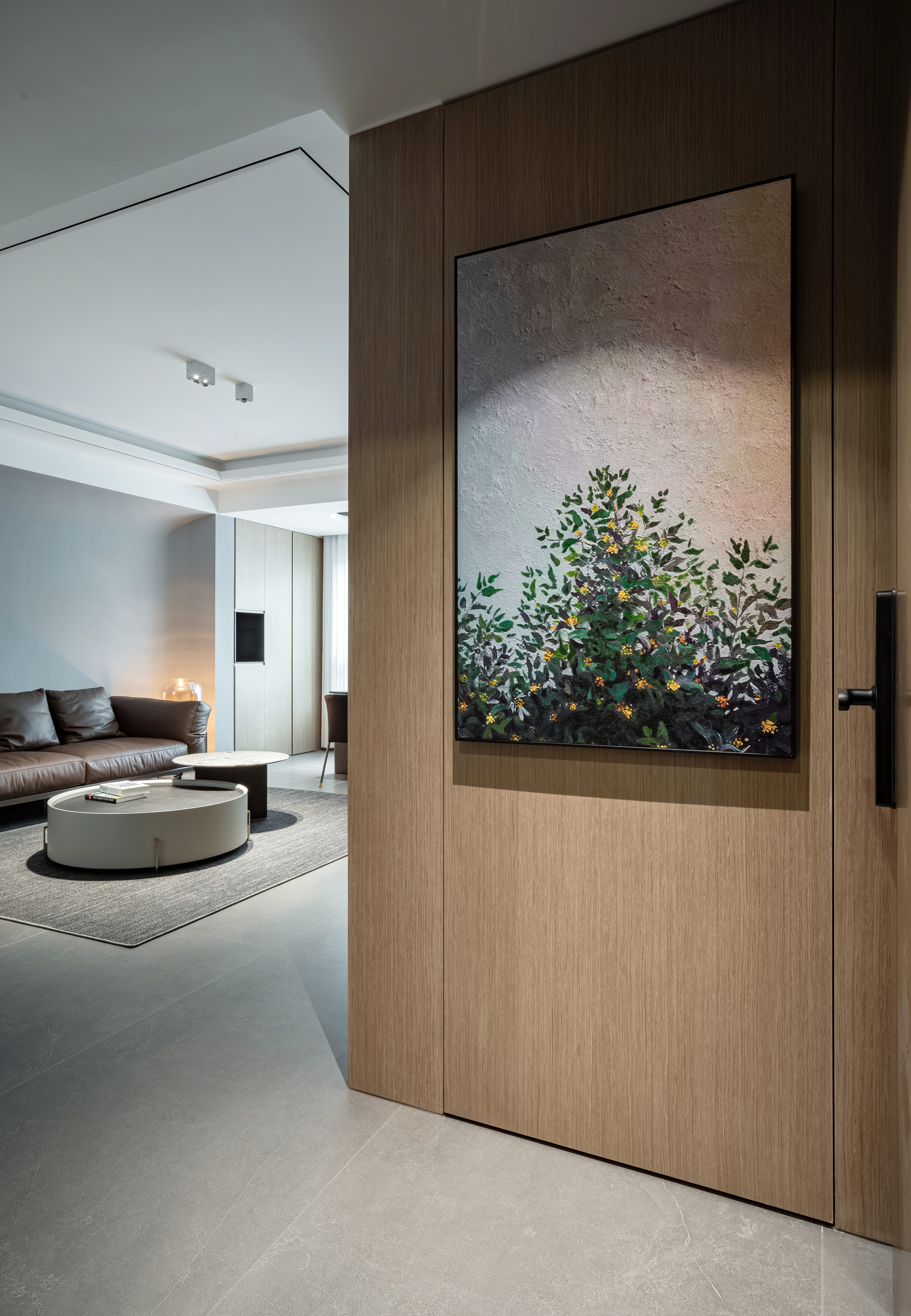 空间意境:加入高级感的灰调系与木饰面的结合,岩板与木饰面,配以艺术漆+金属,线条曲面吊顶,带动空间活力.