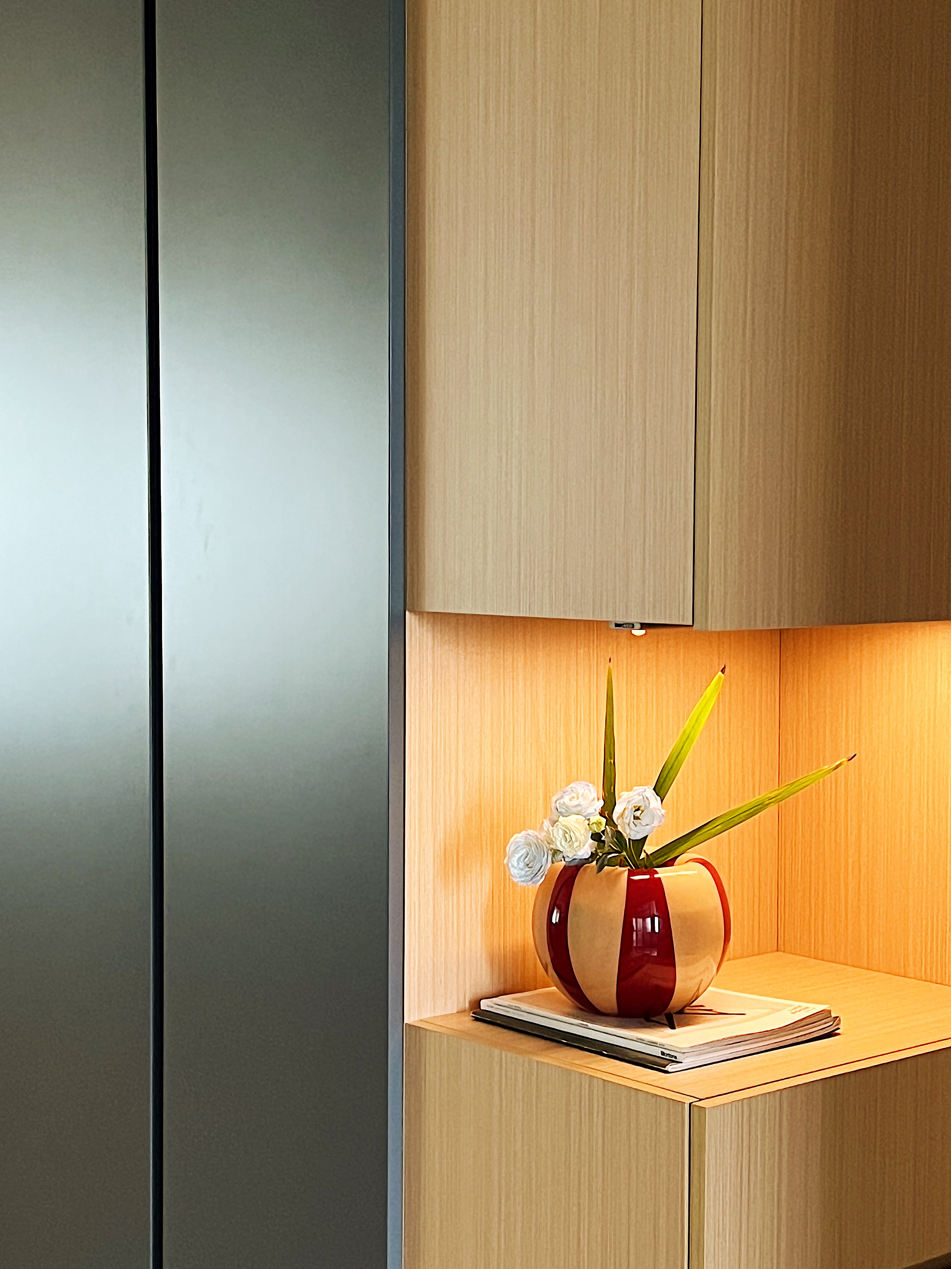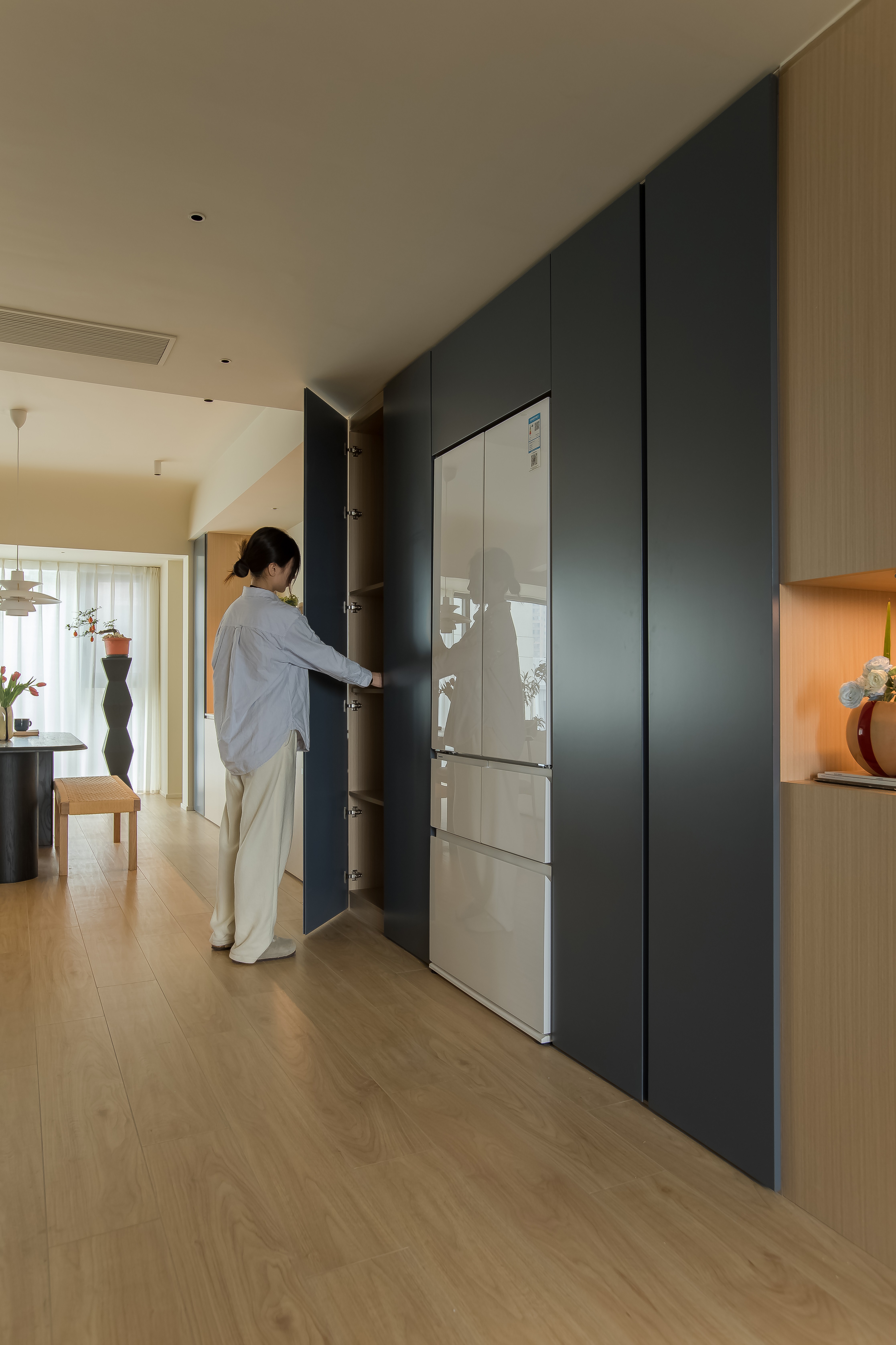 餐桌旁设置了双高柜+餐边柜组合,双高柜可以实现餐区所需收纳,餐边柜则能担当烘培和蒸烤料理的操作平台,满足女主人的西厨烹饪需求,内嵌灯带补充台面照明,同时提升餐厅的氛围感。