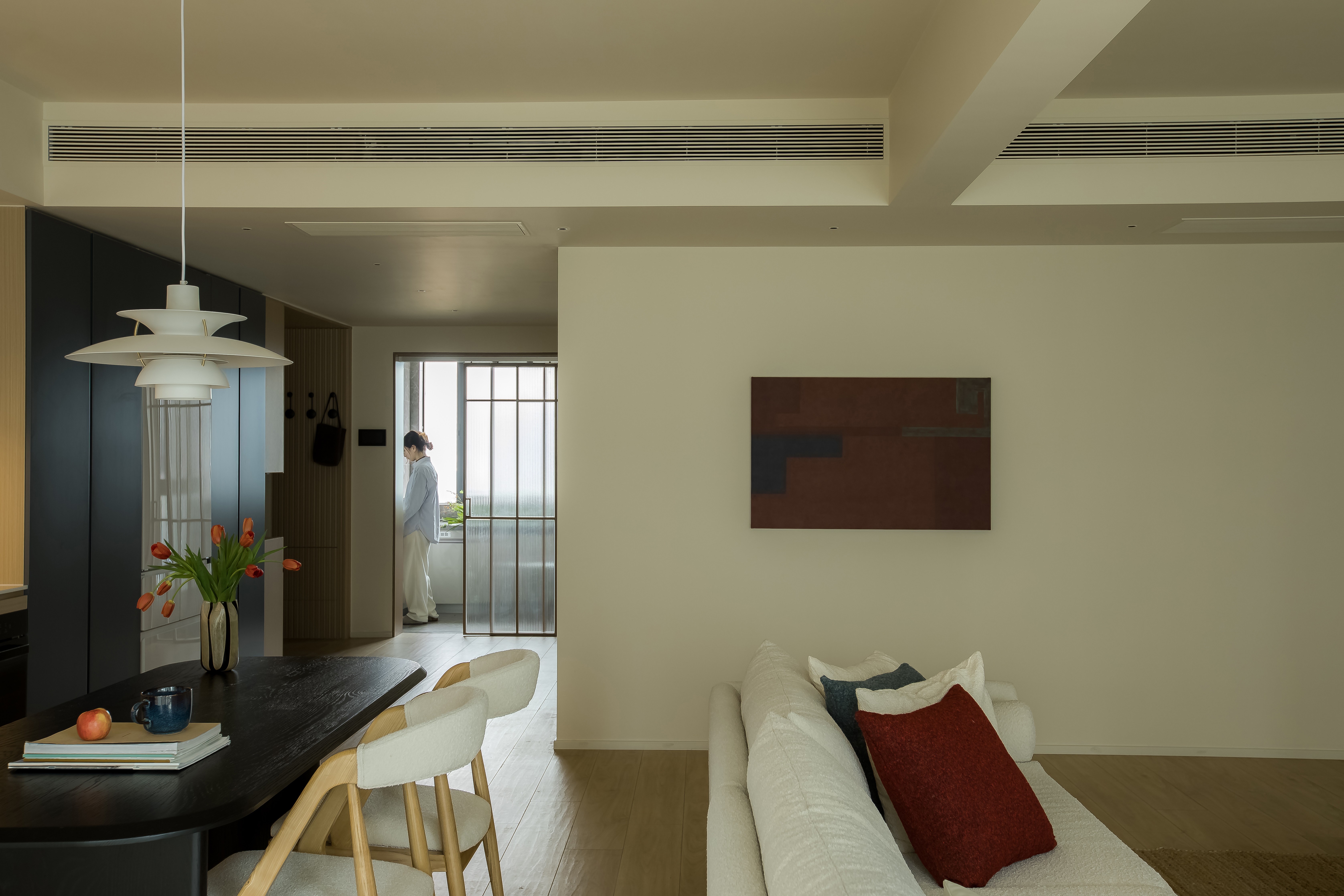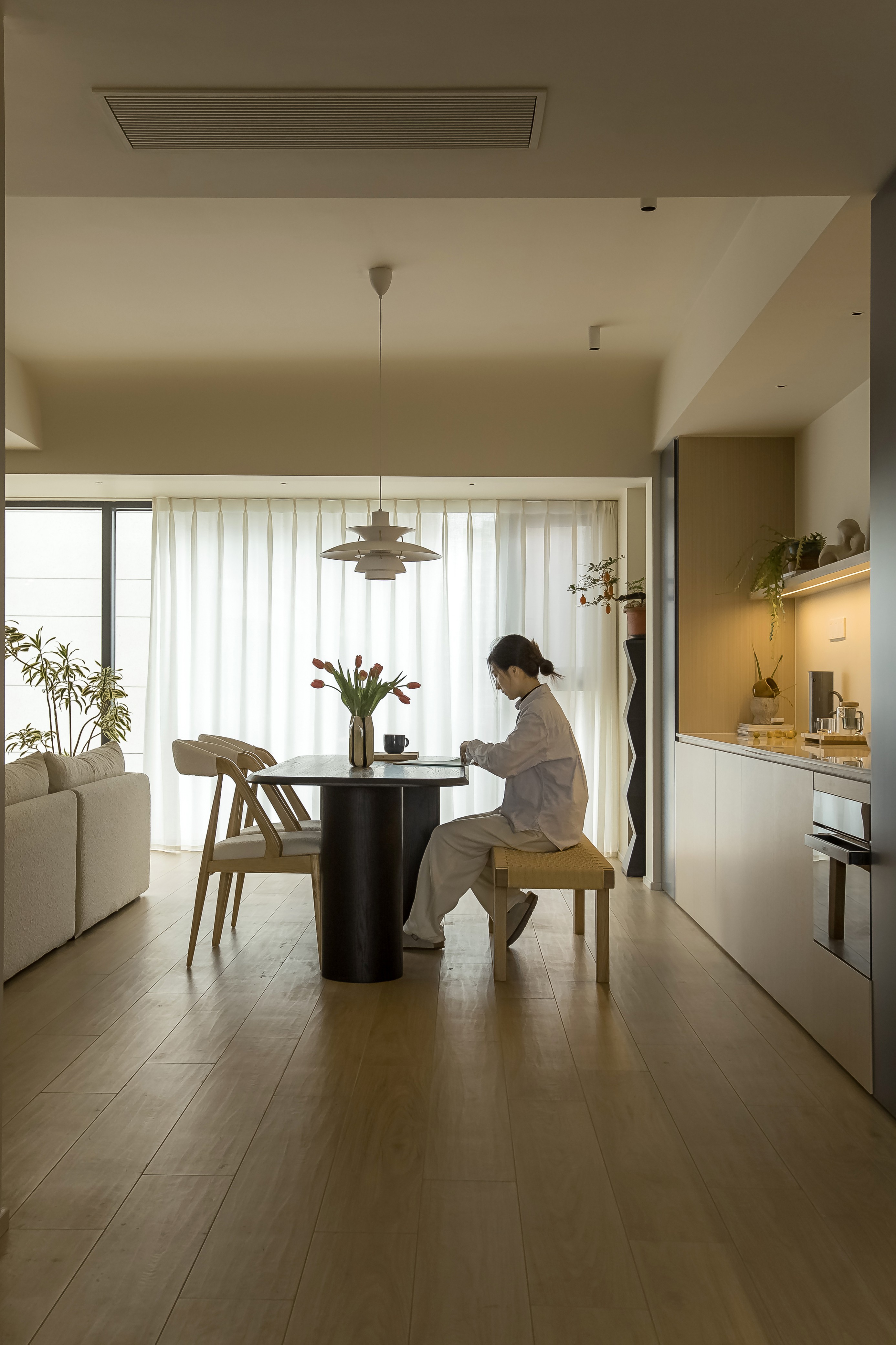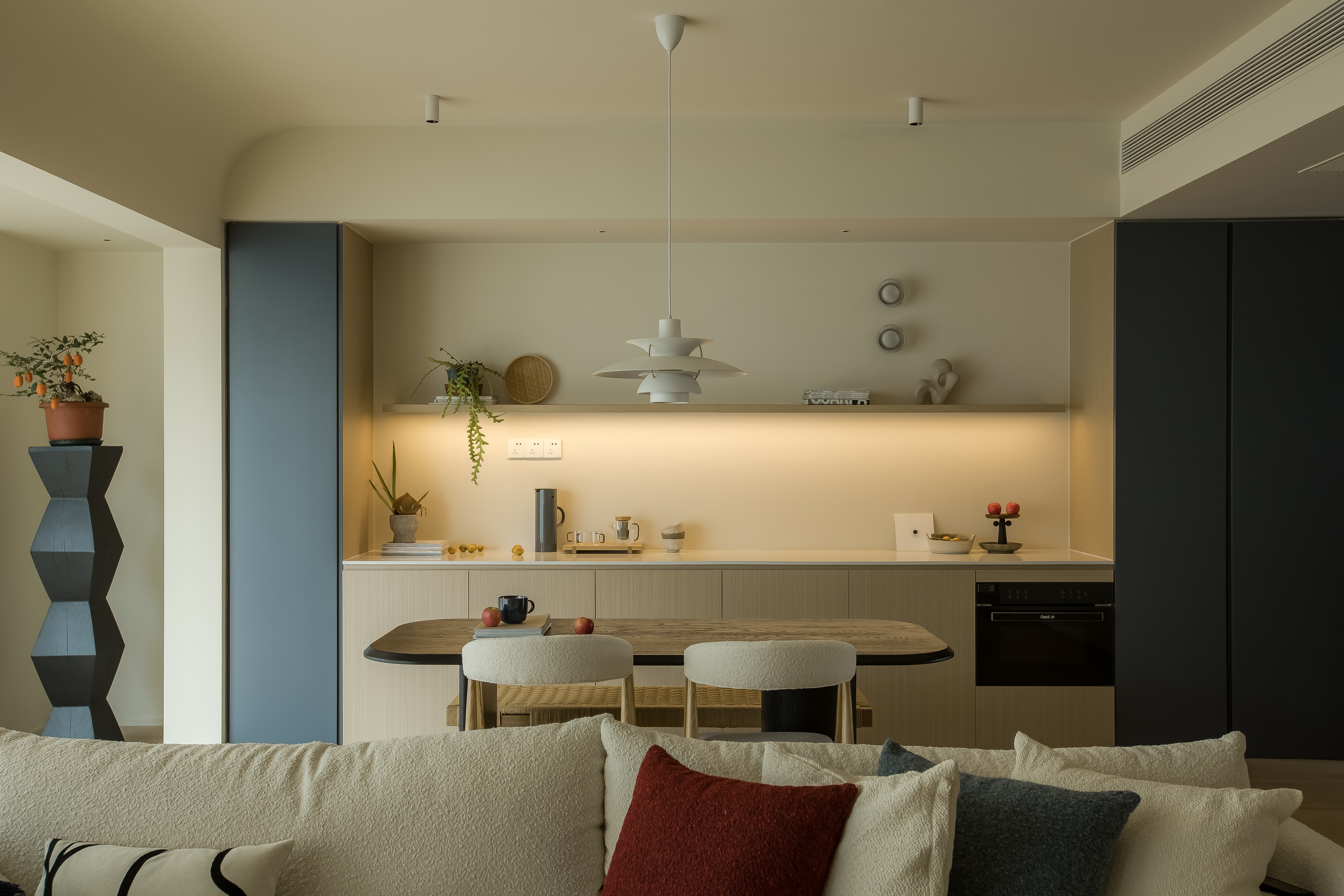 沙发背后就是餐厅,低矮的沙发靠背造型,在维持空间利落线条的同时,轻巧的划出场域界限。餐厅在非用餐时刻也可以转换为阅读,轻办公,喝茶聊天场景模式。