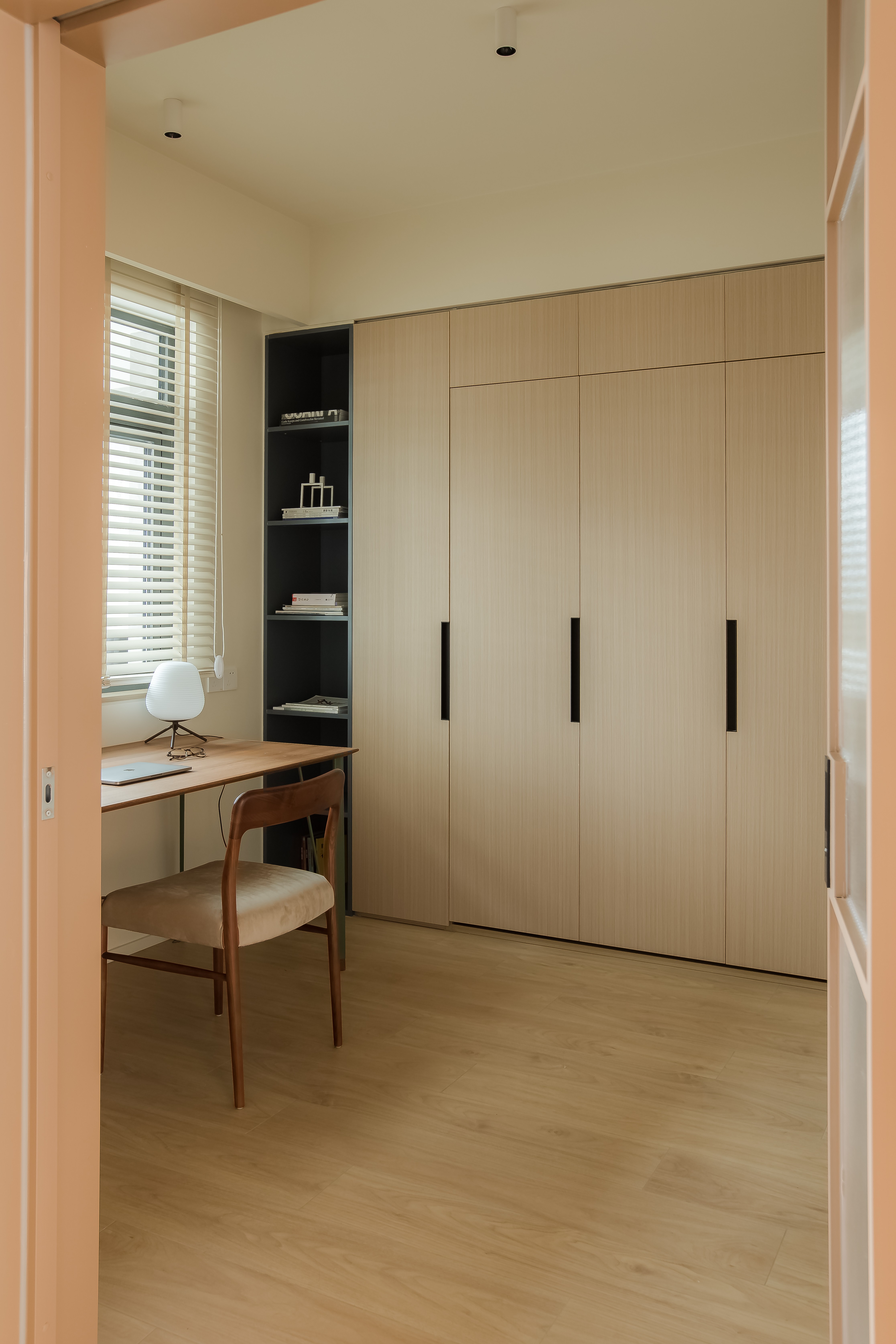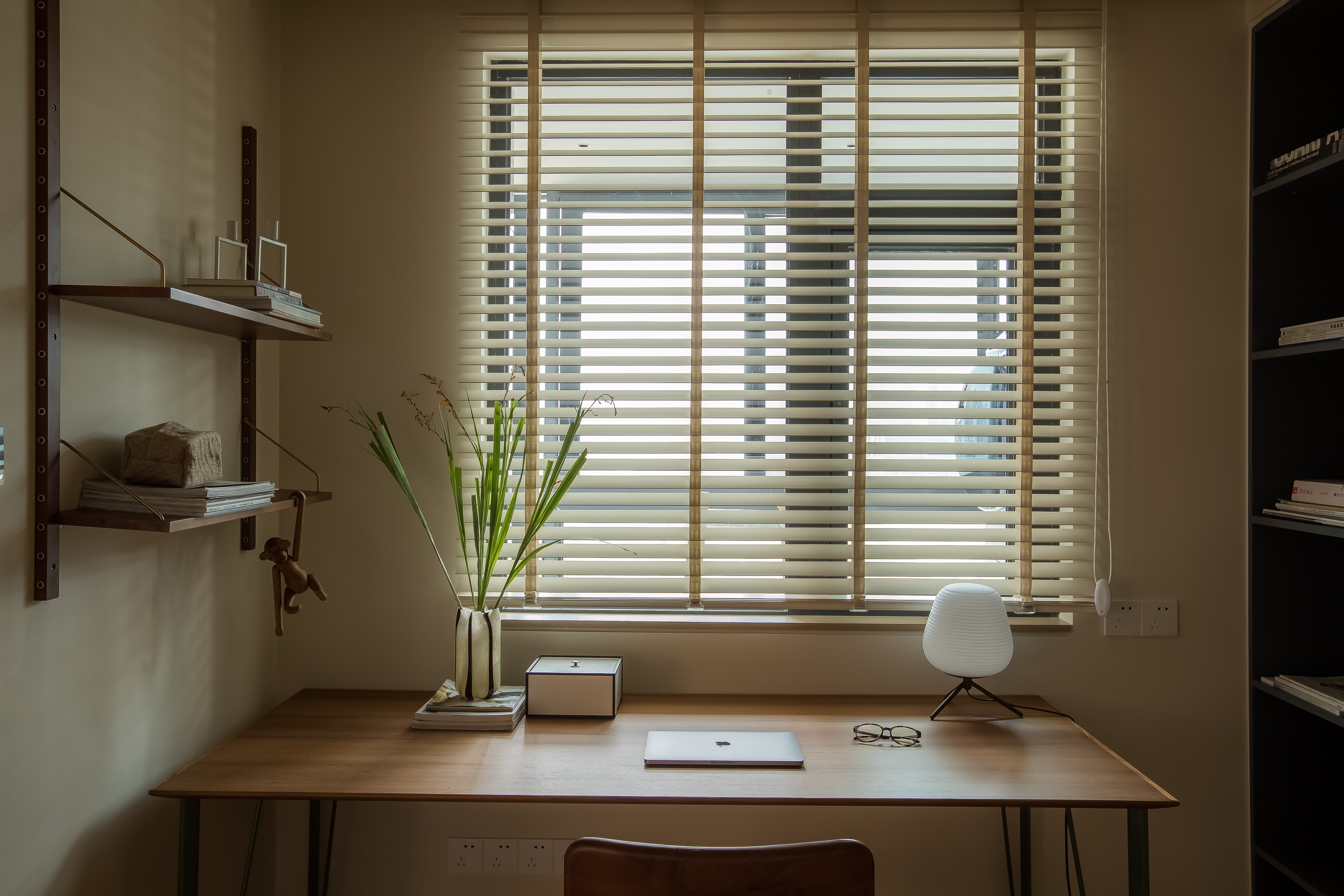 书房是男主人最喜欢的空间,他可以在这里放松地阅读、冥想,奶杏色的百叶窗,温润统一,营造出一个宁静、舒缓的空间氛围。