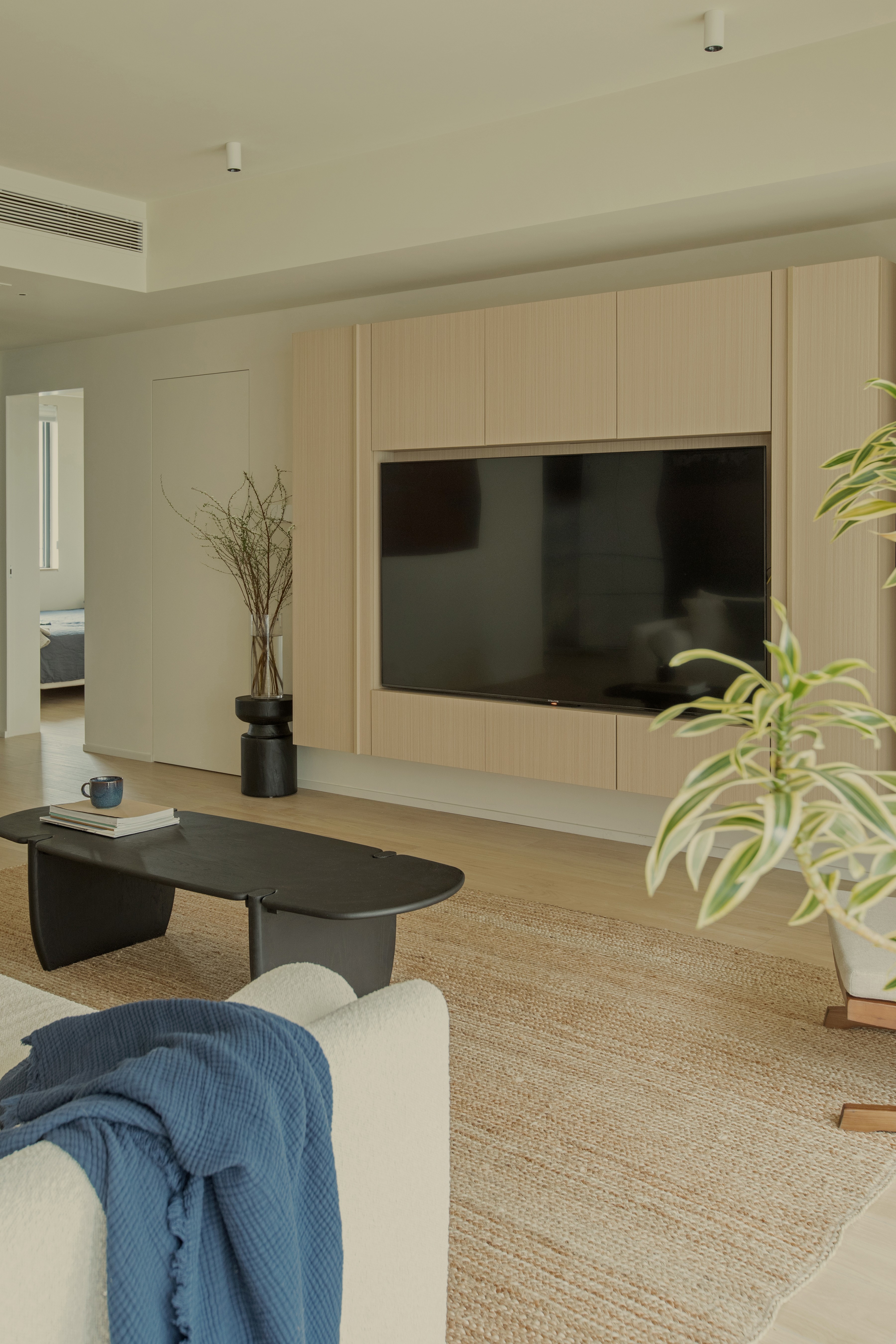 电视柜作为客厅的收纳中心,挑空设计使空间更加轻盈透气,同时也便于日常打理。为了保证视觉的整洁统一,我们将机顶盒和连接线收纳于侧柜中,更加简约干净。