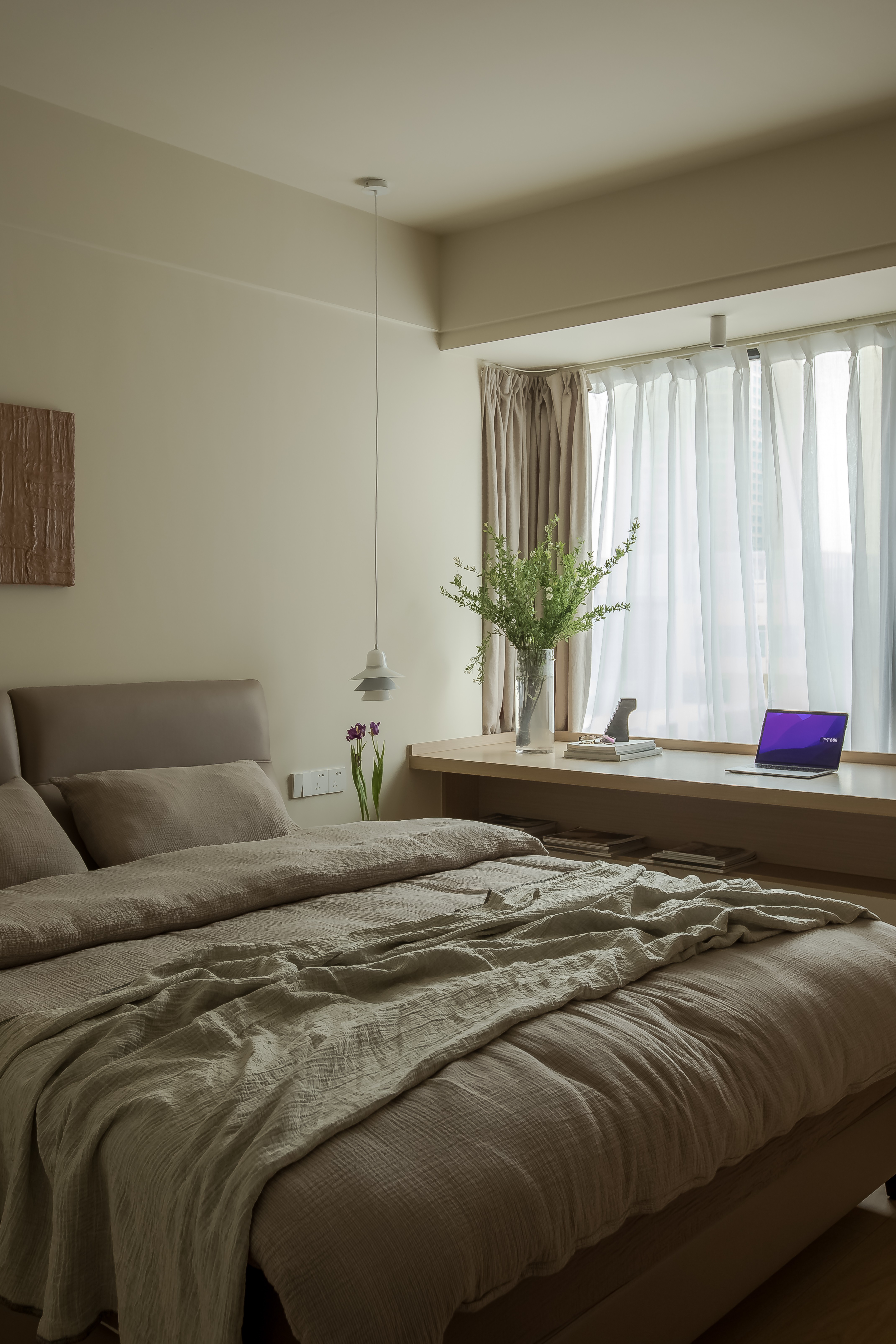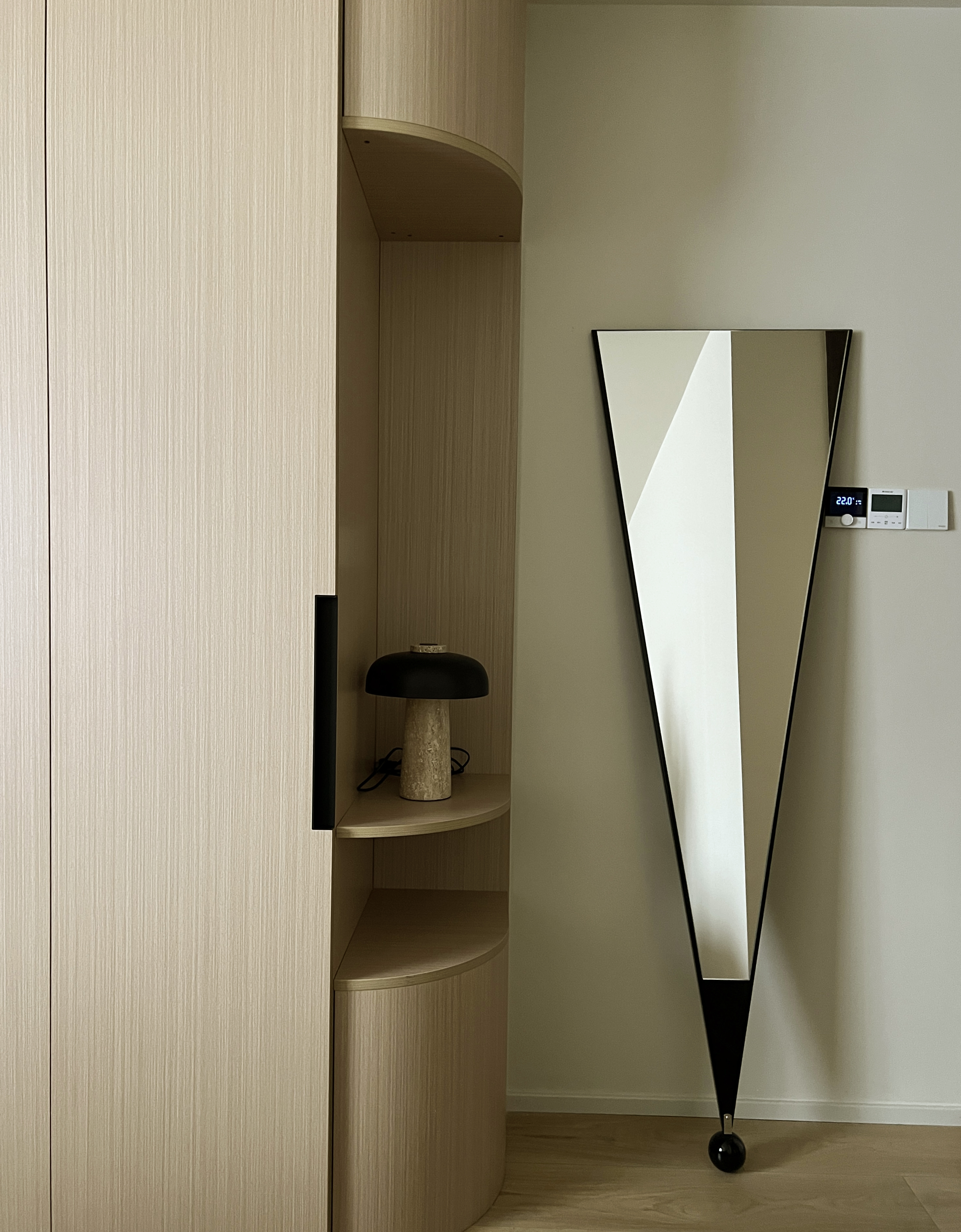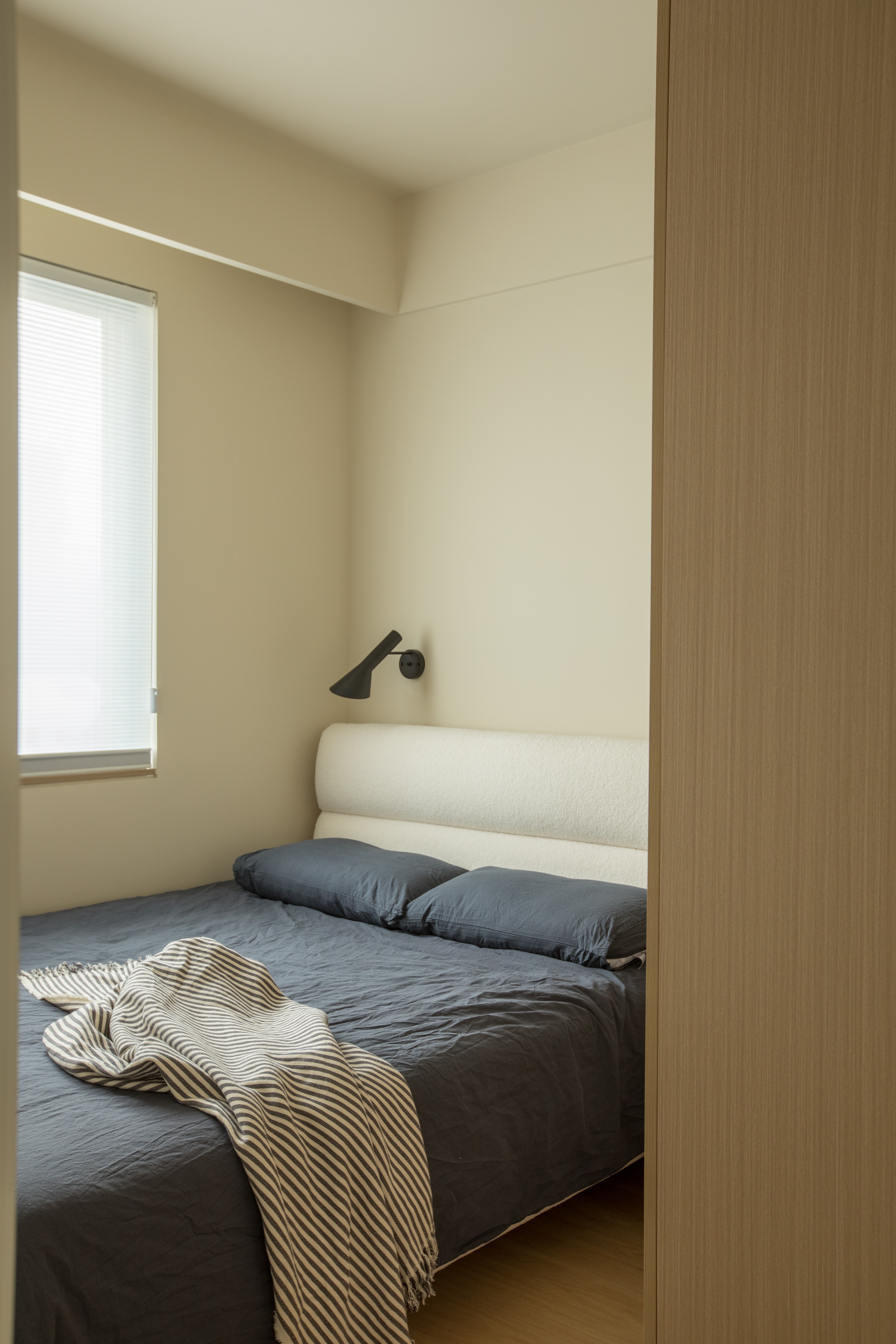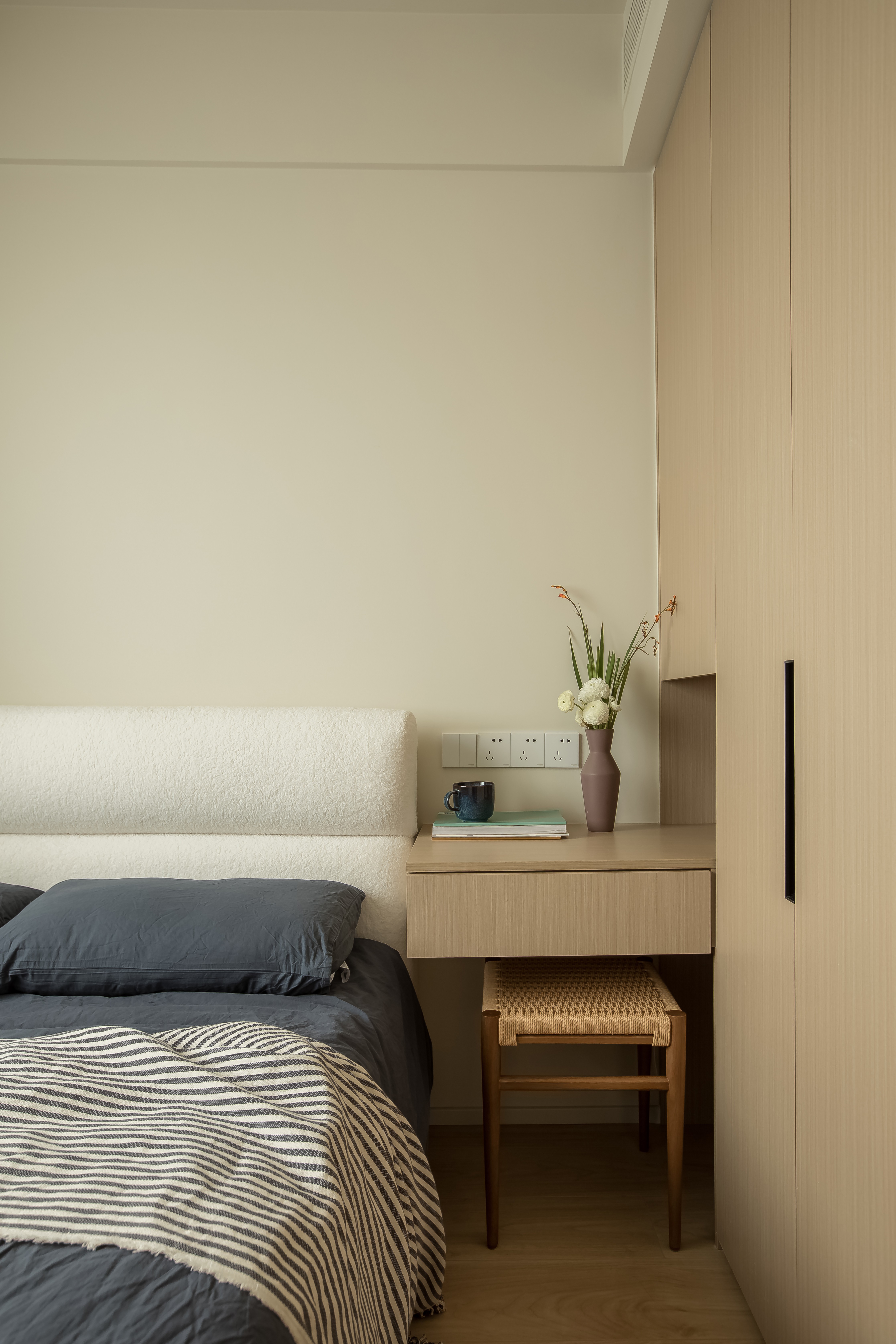 床头处设置了个迷你小桌面,将床头柜和妆台结合在一起,兼具实用和美观,杏白墙面+橡木色柜体+蓝灰色床品,营造全然放松的休憩空间。